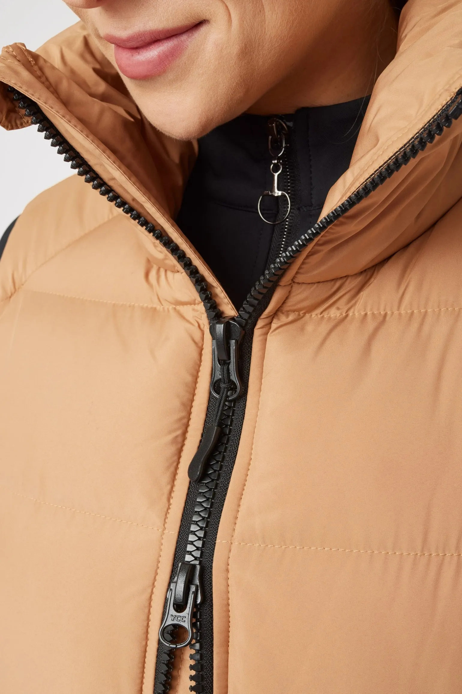 Mit ihrem glatten Griff und dem matten Finish strahlt diese Weste einen eleganten Look aus. Die schmutzabweisenden Eigenschaften lassen sie stets sauber aussehen. Das Stretch-Fleece auf der Rückseite erhöht die Bewegungsfreiheit und sorgt für ein komfortables Tragegefühl. Die Weste hat große Reißverschlüsse und praktische Vordertaschen, in denen du alles Wichtige verstauen kannst. Der große Stehkragen verleiht ihr einen Hauch von Eleganz und bietet zusätzlichen Schutz vor Wind.