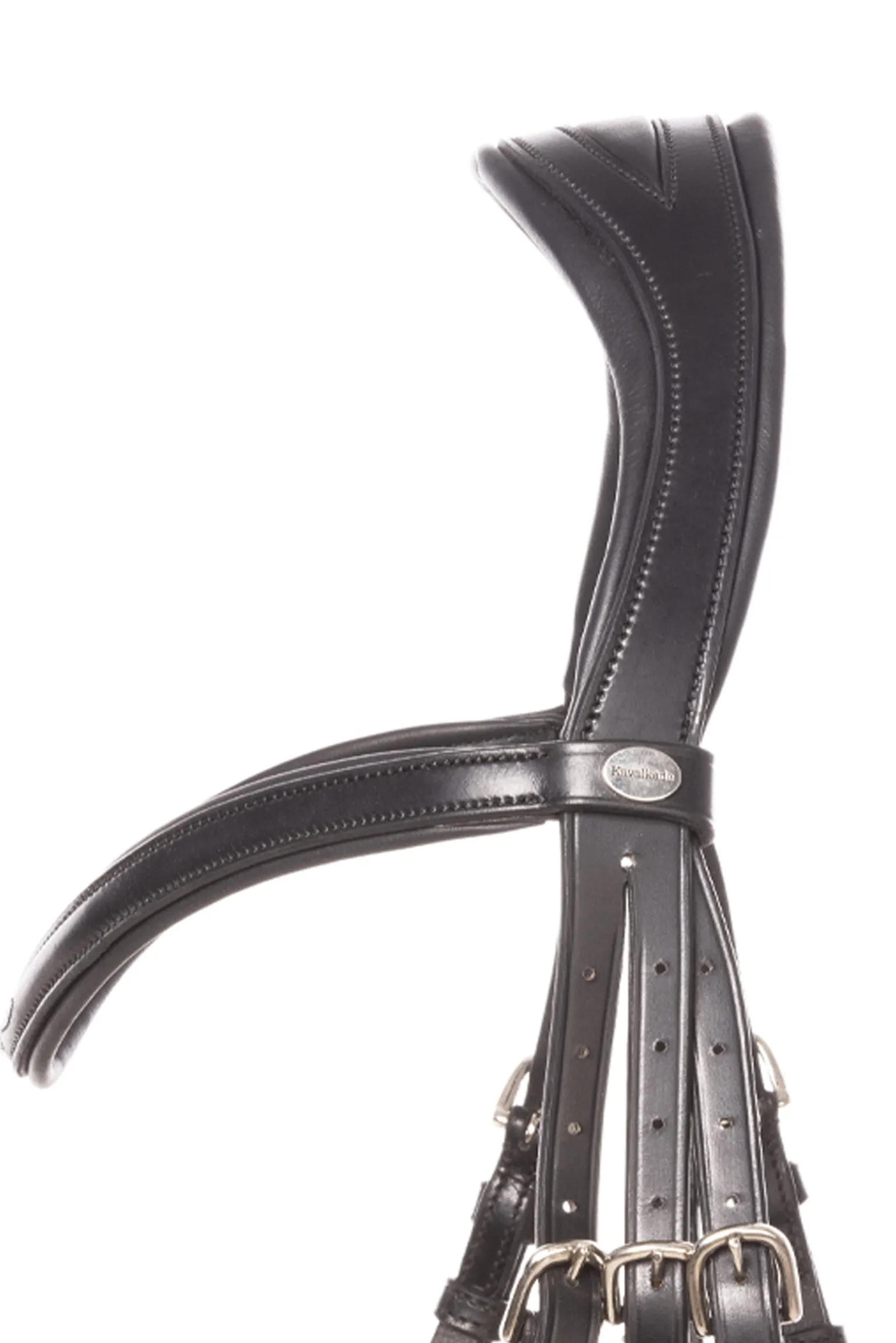 Bei Trensen mit dem Zusatz KavalSH4 ist der Sperrriemen abnehmbar. Das Besondere daran ist, dass die Halterung für den Sperrriemen nicht, wie bei herkömmlichen Trensen mit abnehmbarem Sperrriemen, ersichtlich ist.