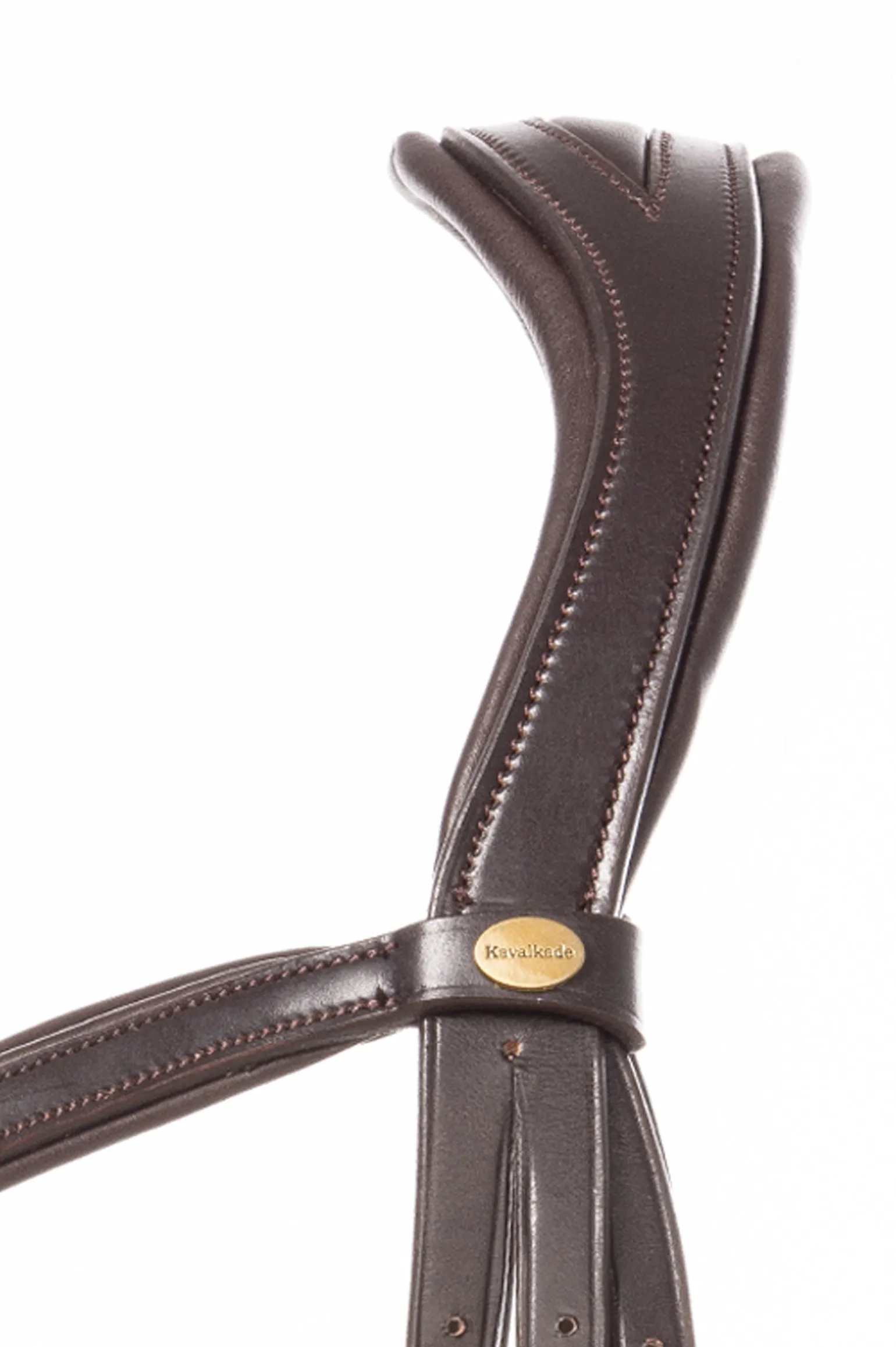 Bei Trensen mit dem Zusatz KavalSH4 ist der Sperrriemen abnehmbar. Das Besondere daran ist, dass die Halterung für den Sperrriemen nicht, wie bei herkömmlichen Trensen mit abnehmbarem Sperrriemen, ersichtlich ist.