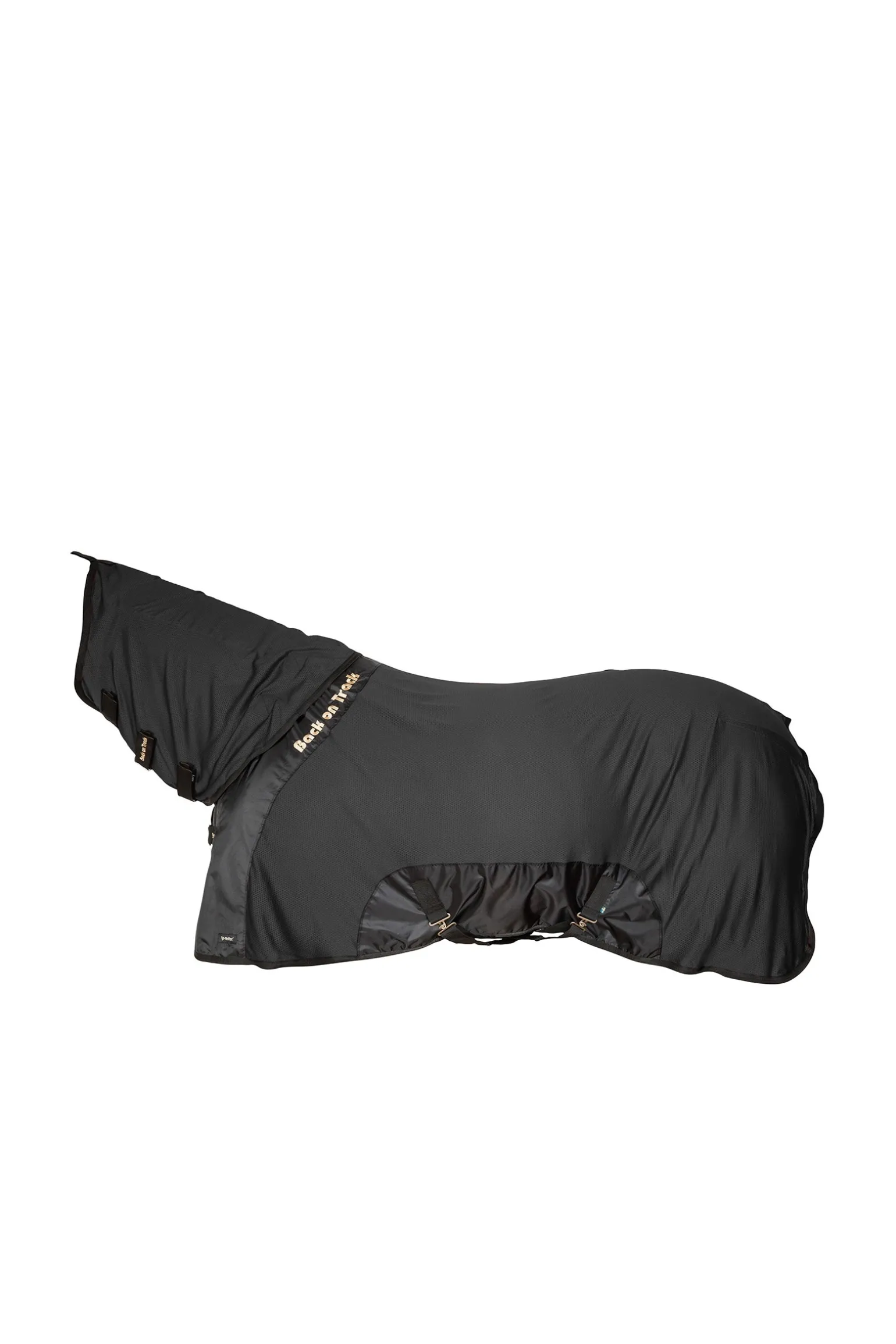 Halsteil für die Royal Mesh Rug Deluxe. Eine perfekte Ergänzung zur Netzdecke, besonders bei kälteren Temperaturen und für Pferde, die im Halsbereich steif sind. Die Halsdecke erweitert den Einsatzbereich der Decke, da sie je nach den momentanen Bedürfnissen des Pferdes verwendet werden kann. Das mit Welltex® durchzogene Futter kann die Blutzirkulation erhöhen und zu einer guten Beweglichkeit der Halsmuskulatur beitragen. Die Halsdecke wird mit flachen Klettverschlüssen einfach an der Decke und am Halfter befestigt. Die Weite lässt sich mit Hilfe von drei Klettverschlüssen im Nacken angepasst werden. Schlaufen unter dem Hals angepasst werden. Das Innenfutter hat ein dichtes gewebten Stoff über der Mähne, um ein Scheuern zu verhindern.