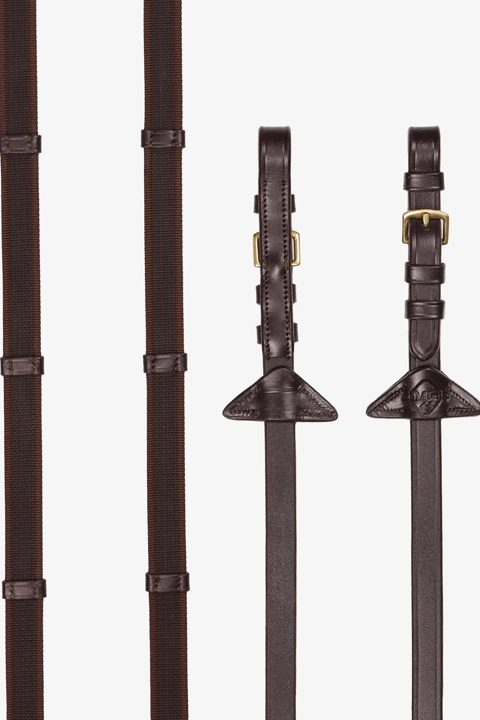 Die Zügel im klassischen schwarzen Design mit silberner Schnalle werden durch die passenden LeMieux Gummimartingalstopper ergänzt.