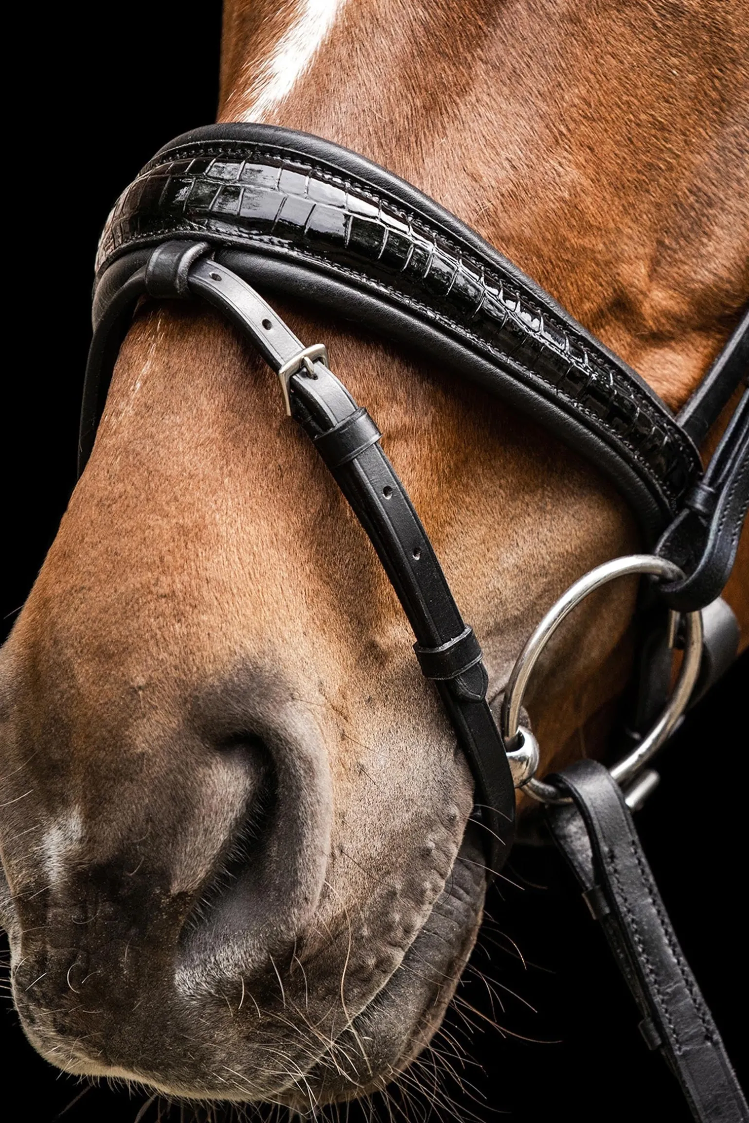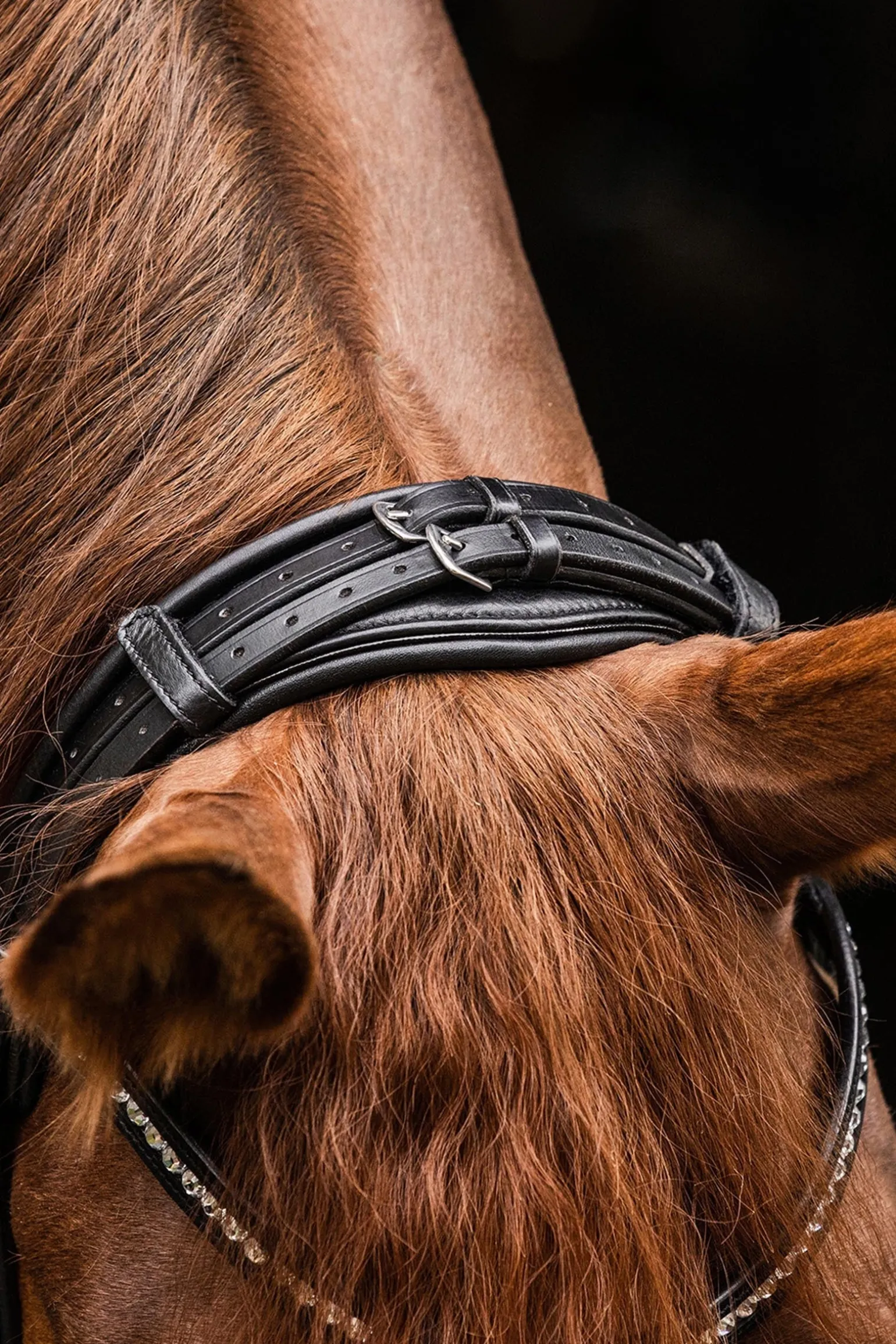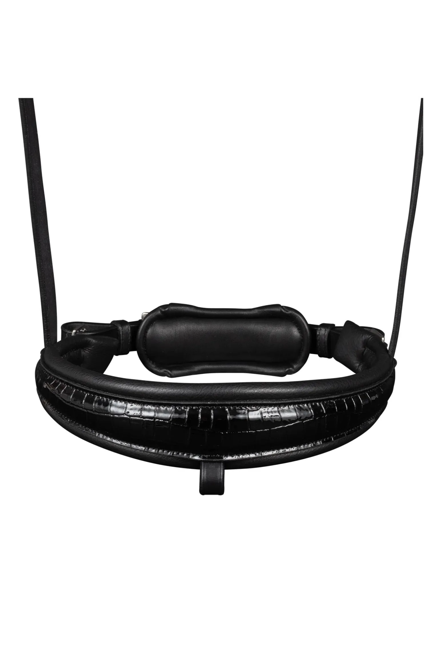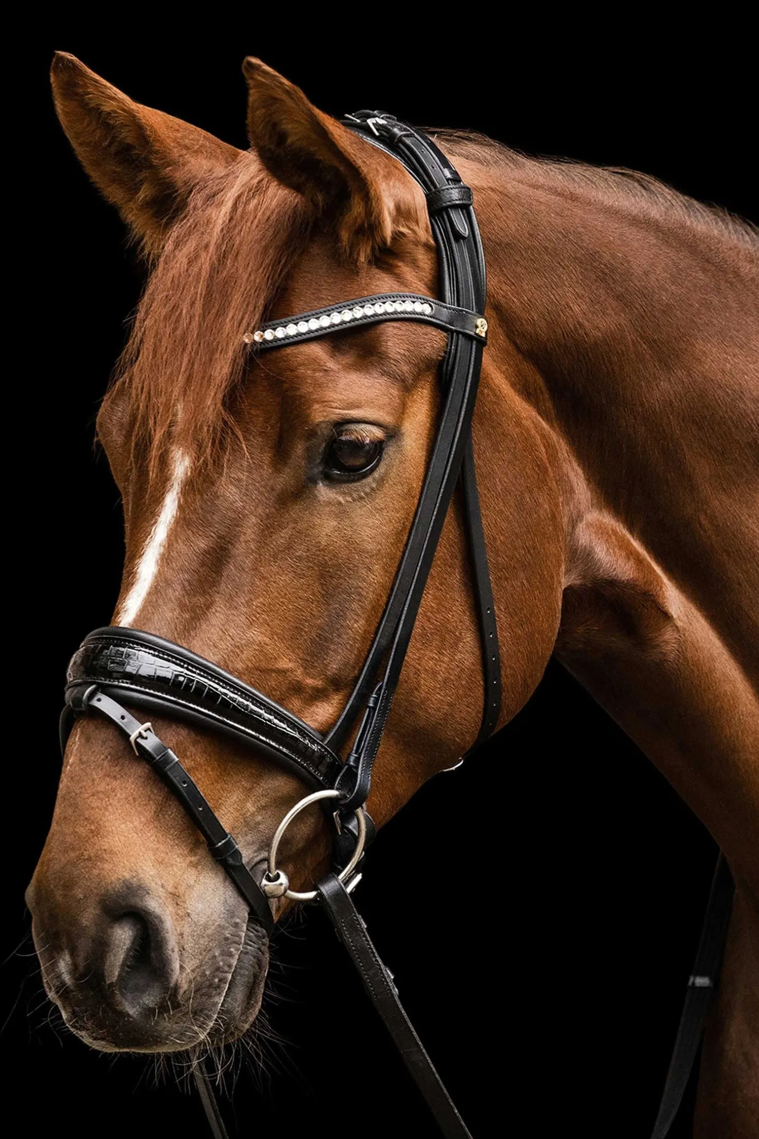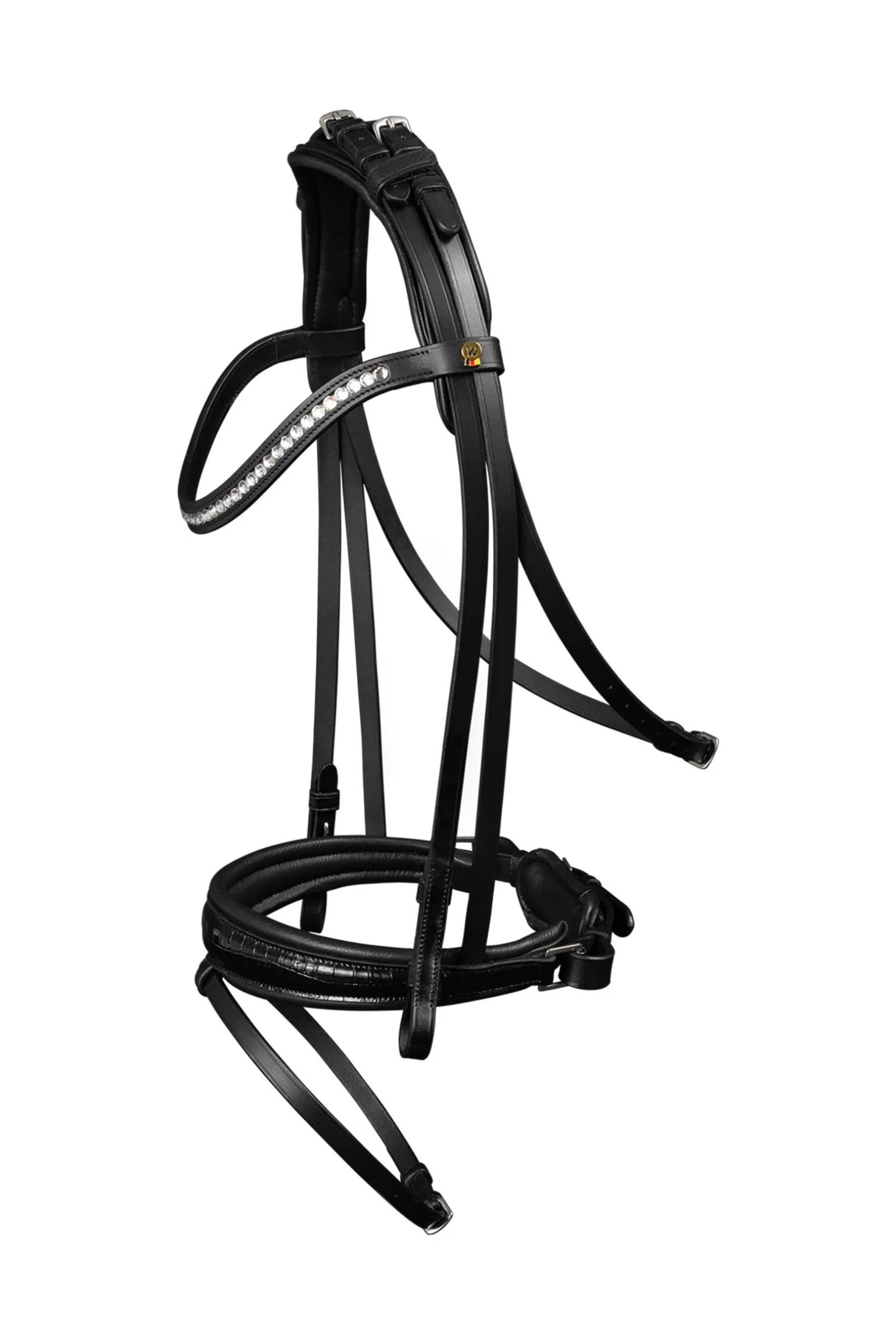 Die Trense verfügt über einen Pull-back-Nasenriemen, flach genähten Nasenriemen, Backenstücke und einen Kehlriemen. Das Kopfstück ist weich gepolstert für zusätzlichen Komfort, mit Schnallen am Kopfstück. Das gebogene Stirnband ist mit funkelnden Kristallen verziert, und die Backenstücke sind mit Haken versehen. Edelstahlbeschläge gewährleisten Haltbarkeit. Zügel sind nicht enthalten.