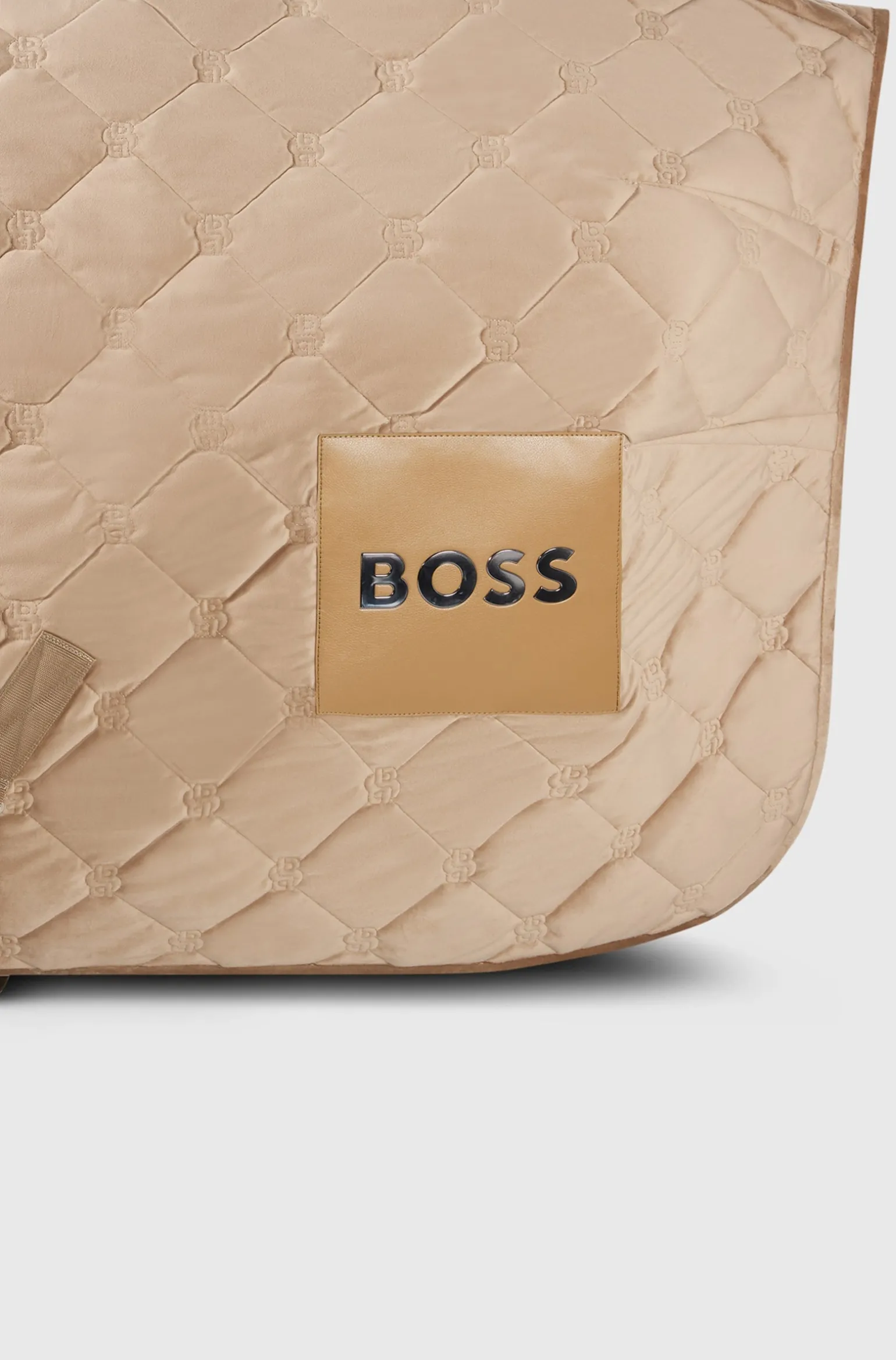 Die BOSS Turnier-Abschwitzdecke ist anatomisch geformt und hat eine perfekte Passform. Das künstliche Schafsfell im Hals-, Widerrist- und Brustbereich sorgt für einen angenehmen Sitz. Die extrem weiche Samtaußenseite mit vollflächiger BOSS Logo-Steppung wirkt äußerst luxuriös. Die Hightech-Faser auf der Innenseite verhindert Scheuerstellen und erzeugt kleine Luftblasen, die die Körperwärme einschließen und speichern. Außerdem glänzt das Fell des Pferdes durch den Kontakt mit dieser weichen Innenseite. Das hervorragende Wärme-Gewichts-Verhältnis maximiert den Komfort für Reiter und Pferd. Die dreilagige Rautensteppung macht die Turnierdecke sehr strapazierfähig und verhindert, dass sich Späne im Gewebe verfangen. Der doppelte Frontverschluss, der Bauchgurt und die Schweifkordel vervollständigen die Sicherheit der Turnierdecke.