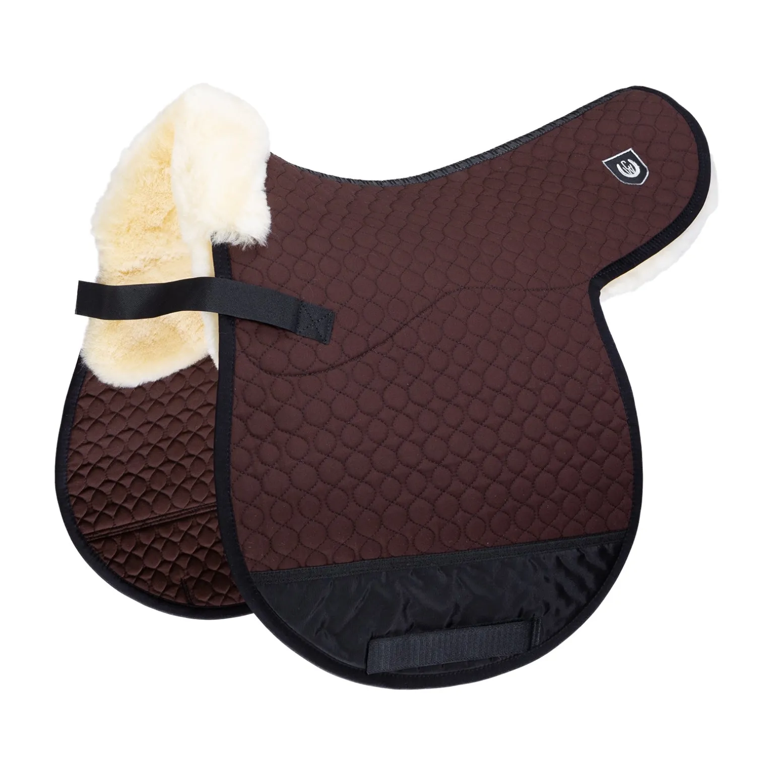 Die Satteldecke ist nur im Sitzbereich mit Lammfell ausgestattet. Der Blattbereich bleibt frei. Die Befestigung erfolgt mit Klettstrupfen an den Gurtriemen des Sattels und durch eine Gurtführung am Blattende. Der eingearbeitete Nylonschutz verhindert das Aufscheuern im Bereich der Sattelgurtung. Vorne wird das Lammfell bis auf die Oberseite herumgezogen und dient als Sattelanlage.