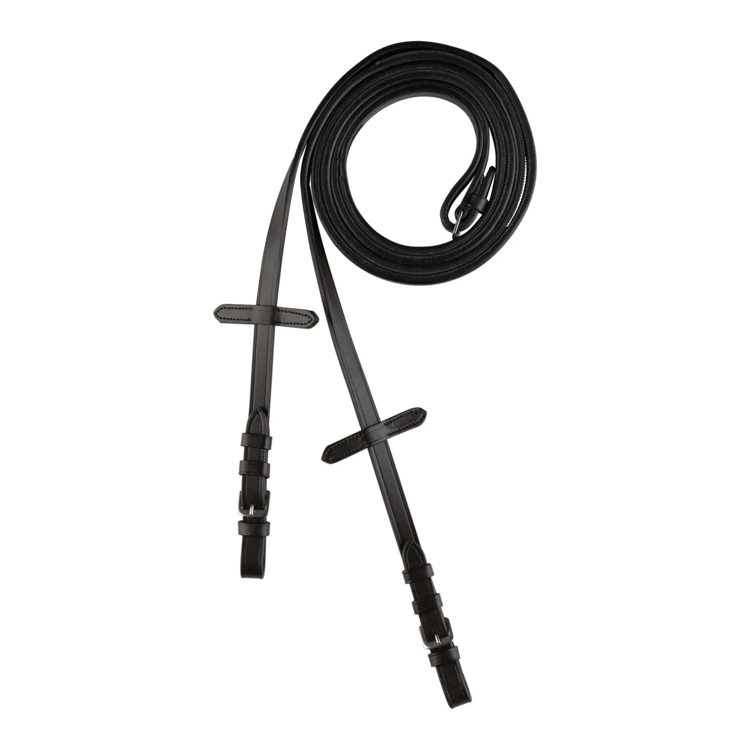 Diese schmalen Zügel bestehen aus Leder mit Gummi auf der Innenseite, das für einen sicheren Halt und einfaches Säubern sorgt. Die rostfreien Stahlschnallen sind robust und leicht an jeder Trense zu befestigen.
