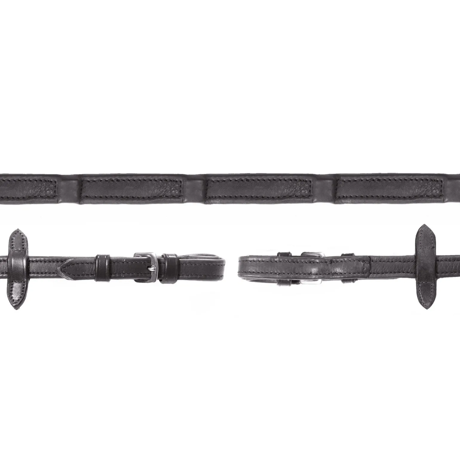 DURASOFT REINS: Diese innovativen, neuen Zügel besitzen einen reißfesten Kern aus Nylon. Bis zur Gebissschlaufe ist ein reißfestes Gurtband eingelegt, bei dem das Kerngewebe vergleichbar ist mit dem Material von einem Sicherheitsgurt. Das verarbeitete Leder ist strapazierfähig aber auch extra-soft und geschmeidig. Eingearbeitete Stege sorgen für eine sicherere Lage in der Reiterhand. Der Zügel hat Martingalstopper und ist 16 mm breit.