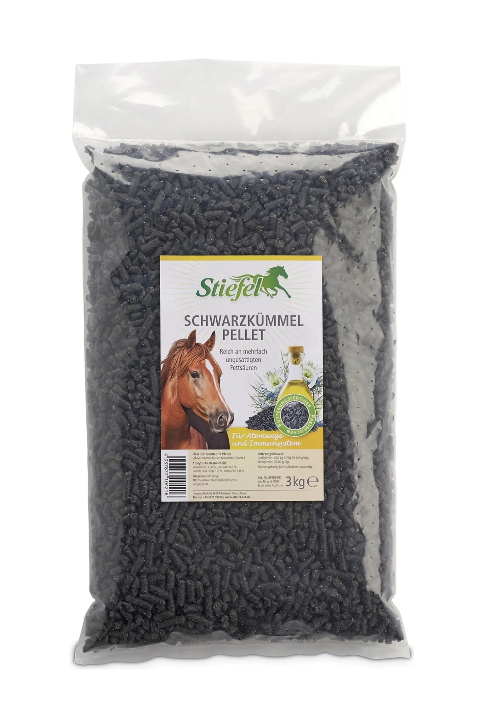 Stiefel Schwarzkümmelpellet ist ein fütterungsfertiger Schwarzkümmelkuchen, dessen Ölanteil durch schonende Kaltpressung reduziert wurde. Schwarzkümmel ist reich an mehrfach ungesättigten Fettsäuren und kann sich positiv auf die Abwehrkräfte, Haut und Fell sowie die Atemwege des Pferdes auswirken. Stiefel Schwarzkümmelpellet kann auch bei Pferden mit empfindlicher Haut eine gesunde Hautfunktion unterstützen. Fütterungshinweis: Großpferde (600 kg KGW) 60 – 100 g / tägl., Kleinpferde 30 – 60 g / tägl. Fütterungsfertig, kein Aufkochen notwendig.