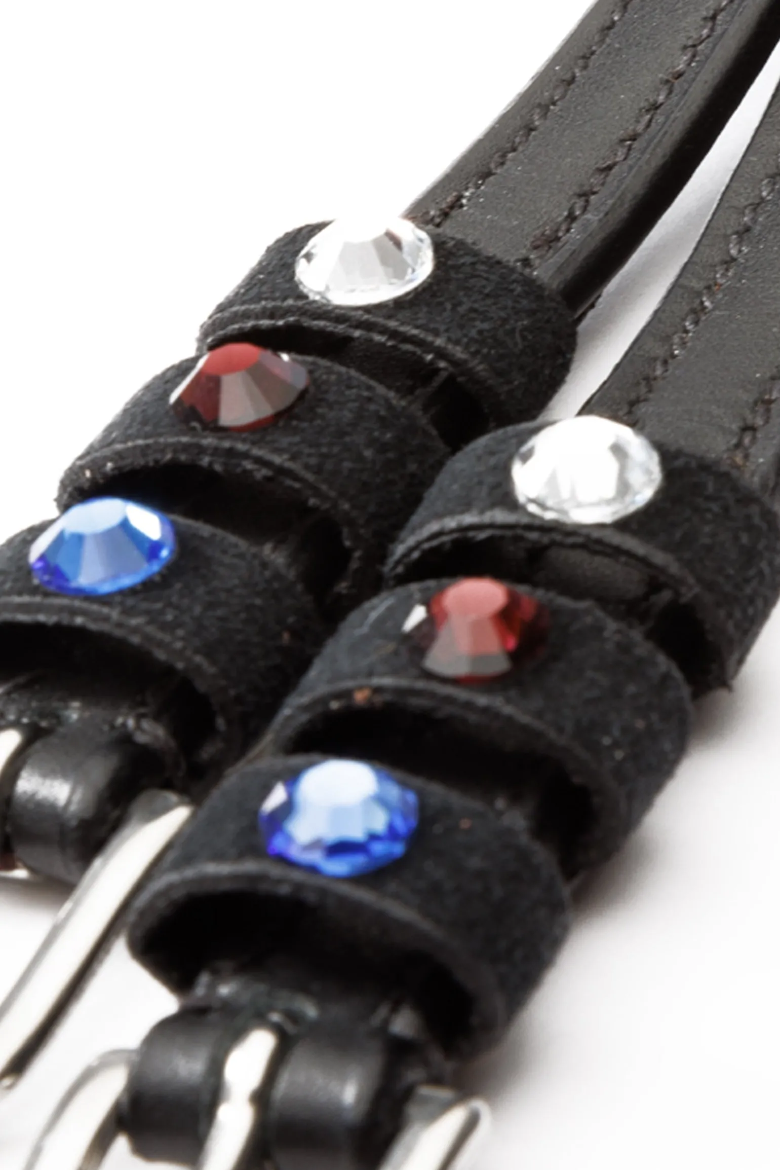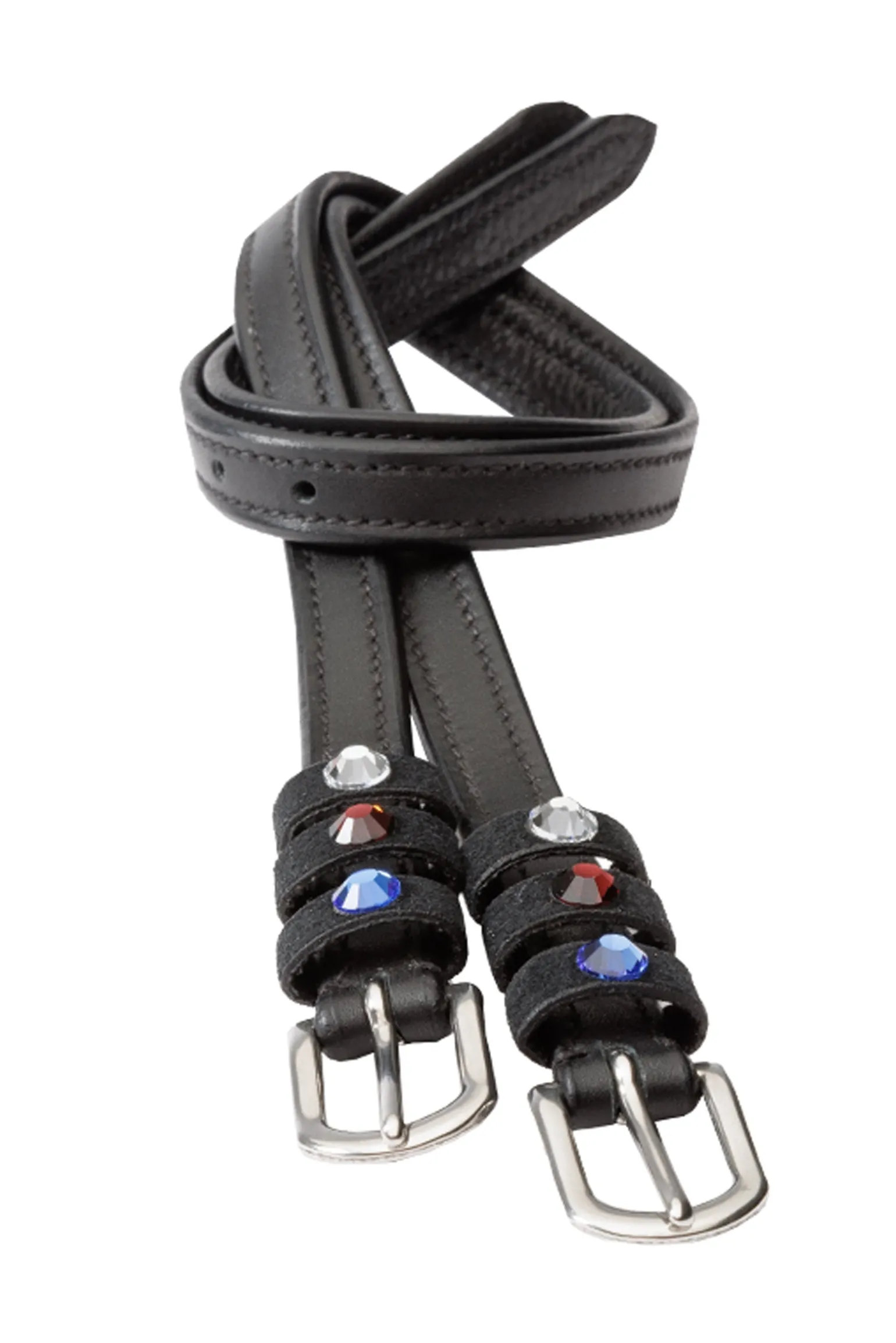 Sporenriemen „Seasons dreams“ aus weichem, langlebigem Qualitätsleder mit farbigen Strasssteinen auf den Schlaufen. Paarweise. Passendes Browband „Seasons dreams“ mit Knopfverschluss.