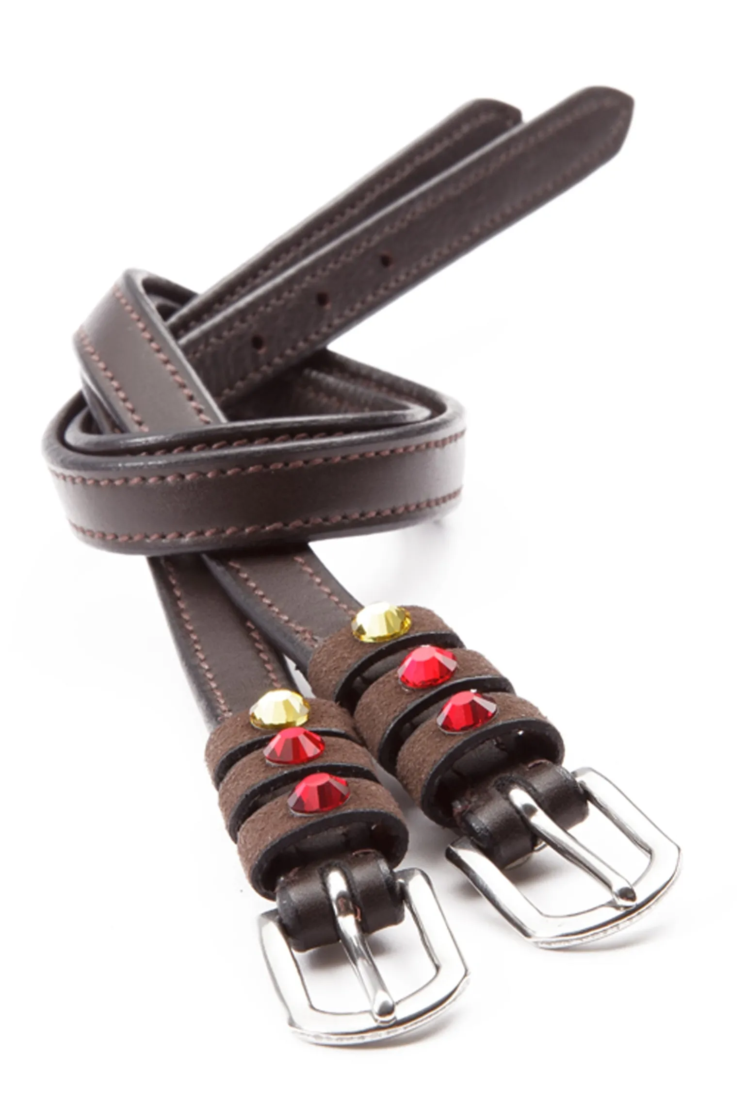 Sporenriemen „Seasons dreams“ aus weichem, langlebigem Qualitätsleder mit farbigen Strasssteinen auf den Schlaufen. Paarweise. Passendes Browband „Seasons dreams“ mit Knopfverschluss.