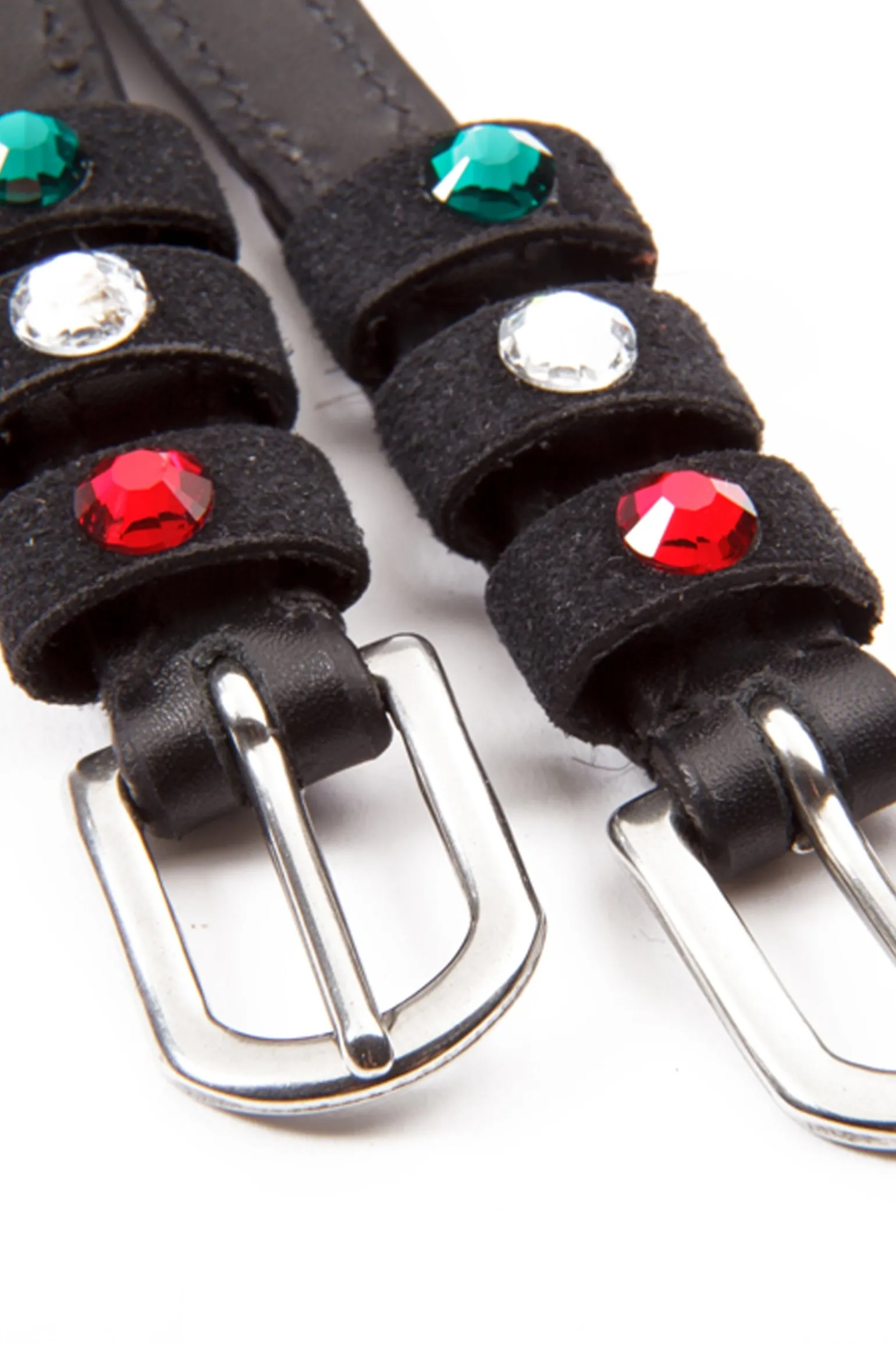 Sporenriemen „Seasons dreams“ aus weichem, langlebigem Qualitätsleder mit farbigen Strasssteinen auf den Schlaufen. Paarweise. Passendes Browband „Seasons dreams“ mit Knopfverschluss.