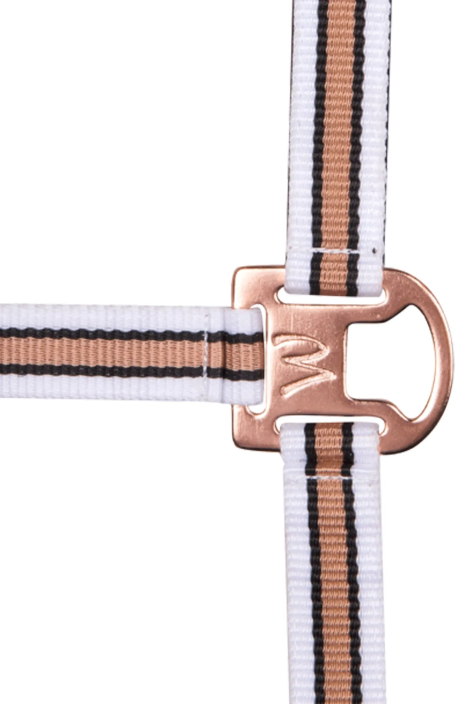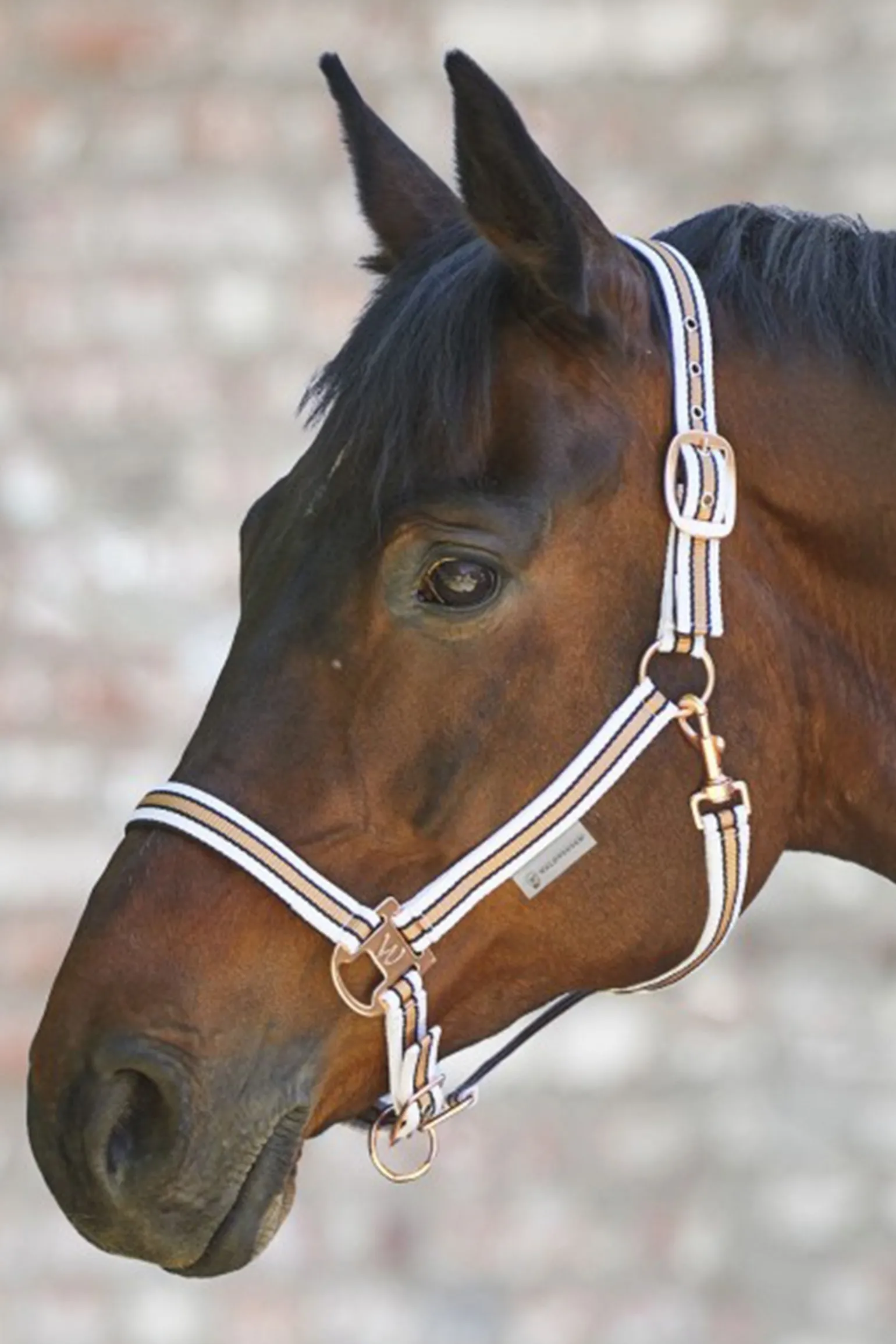 Weich unterlegtes Halfter, mehrfach verstellbar. Mit rosegoldenen oder silbernen Beschlägen. Am Kinnriemen und Genickstück (einseitig) mehrfach verstellbar. Passend zu Anbindestrick Shine Art. 342167& 335551.