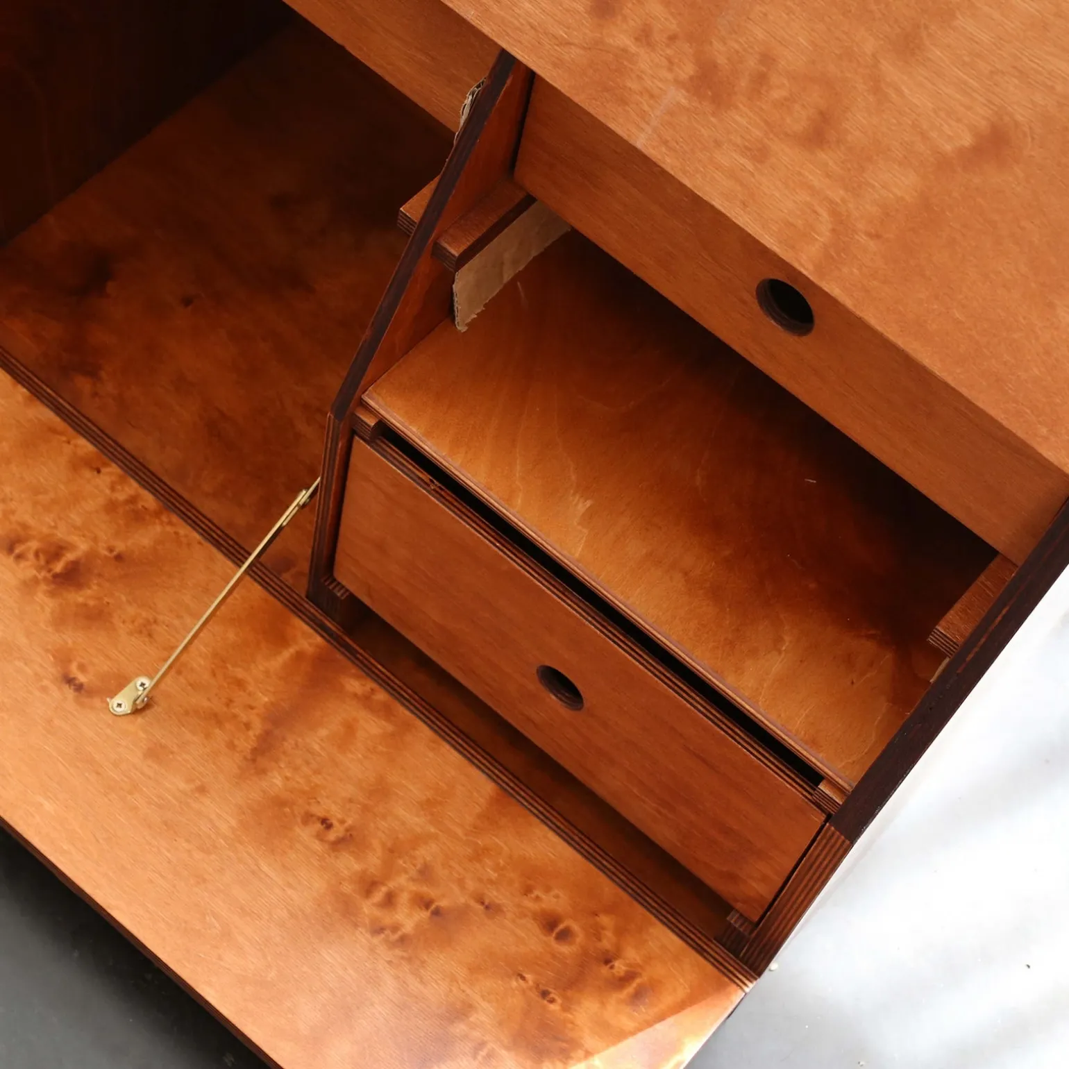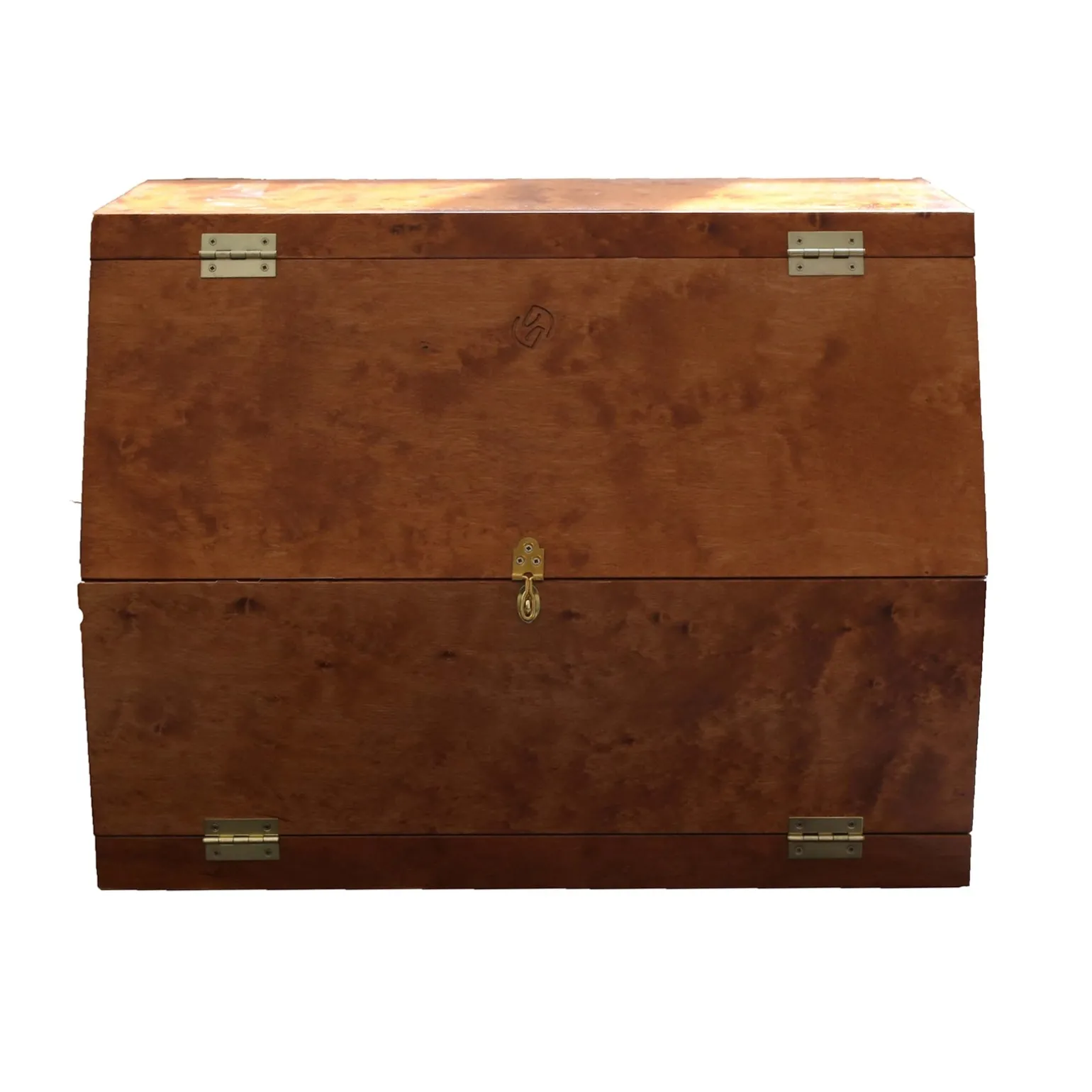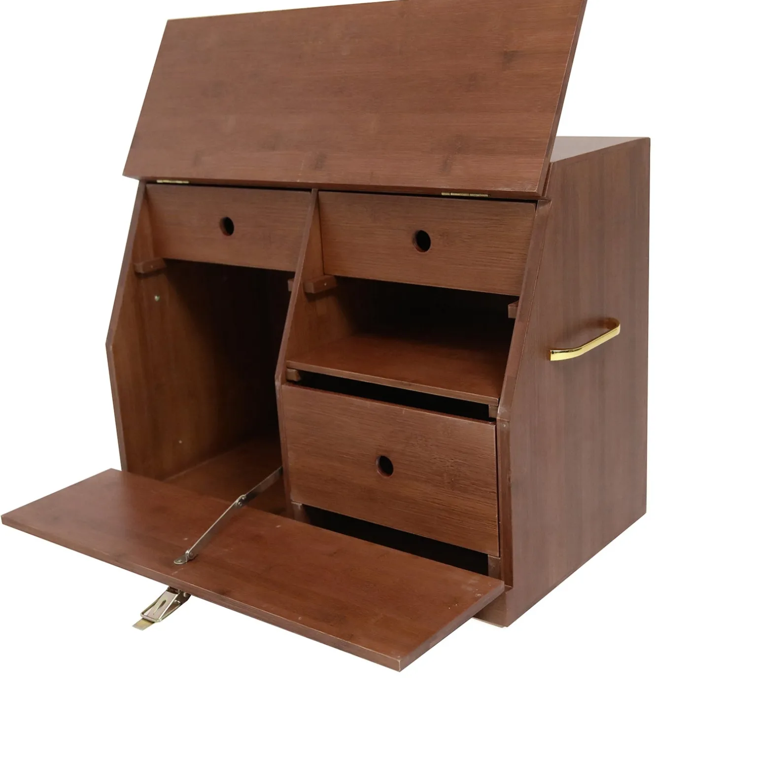 Sie ist 43,5 cm hoch, 59,5 cm breit und 32 cm tief. Die Box hat 2 Türen, die mit einem goldenen Schnappverschluss schließen, an dem Du ein Schloss anbringen kannst. Im Inneren befinden sich 2 kleine Schubladen (9,5 x 27,5 x 20 cm), eine größere Schublade (14 x 27,5 x 28,5 cm), ein großes Fach (28,5 x 28 x 29 cm) und ein kleineres Fach (8 x 28 x 28 cm). Alle Schubladen und der Boden des kleinen Fachs können entfernt werden. Das ist perfekt wenn Du mehr Platz brauchst oder die Box putzen möchtest. Sie besteht aus Bambus und ist dadurch besonders widerstandsfähig und leicht zu reinigen. Mit den 3 mitgelieferten goldenen Griffen lässt sich die Box leicht überall hin transportieren. Bring Stil in deine Organisation mit dieser Box.