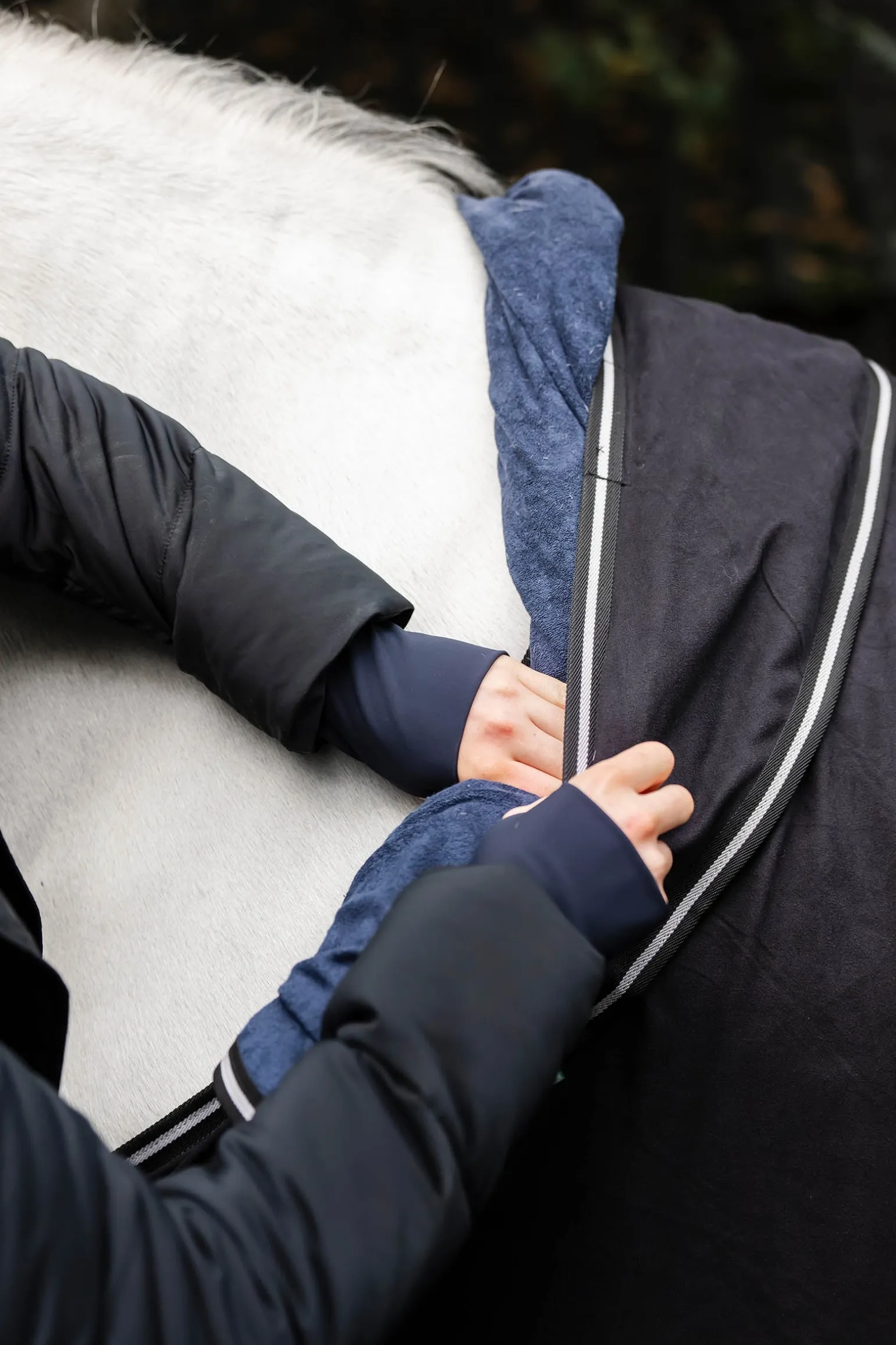 The waterproof & breathable outer protects against manure stains and can be worn on a damp coat.The natural bamboo towelling lining helps flatten and polish the coat, and smooth the mane.