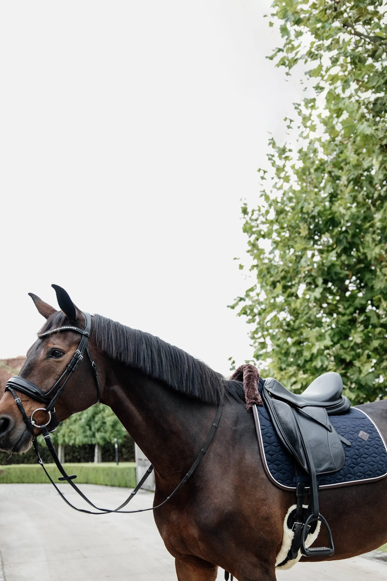 Die Schabracke hat keine nervigen Riemen an der Seite. Zum Befestigen der Schraken werden nur die Riemen für den Sattelgurt benötigt. Durch den künstlichen Lederrand und die weiße Biese wirkt die Schabracke besonders stillvoll und schick. Der einzigartige Look besticht durch dem gesteppten Sternmuster. Das dezente Logo aus Kunstleder befindet sich an einer zentralen, etwas höheren Stelle, sodass bei Bedarf immer Platz zum Besticken mit Ihrem eigenen Logo bleibt.