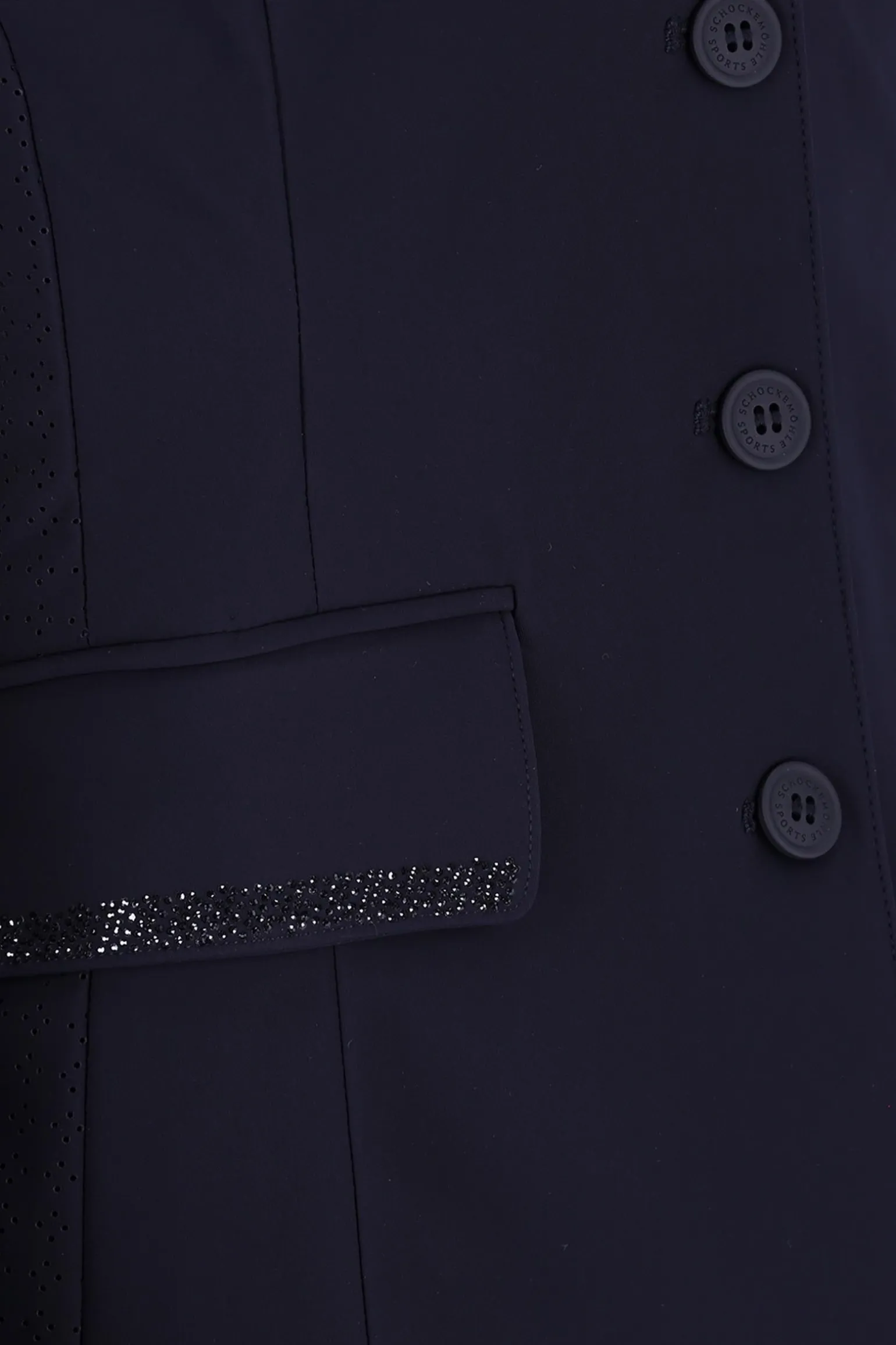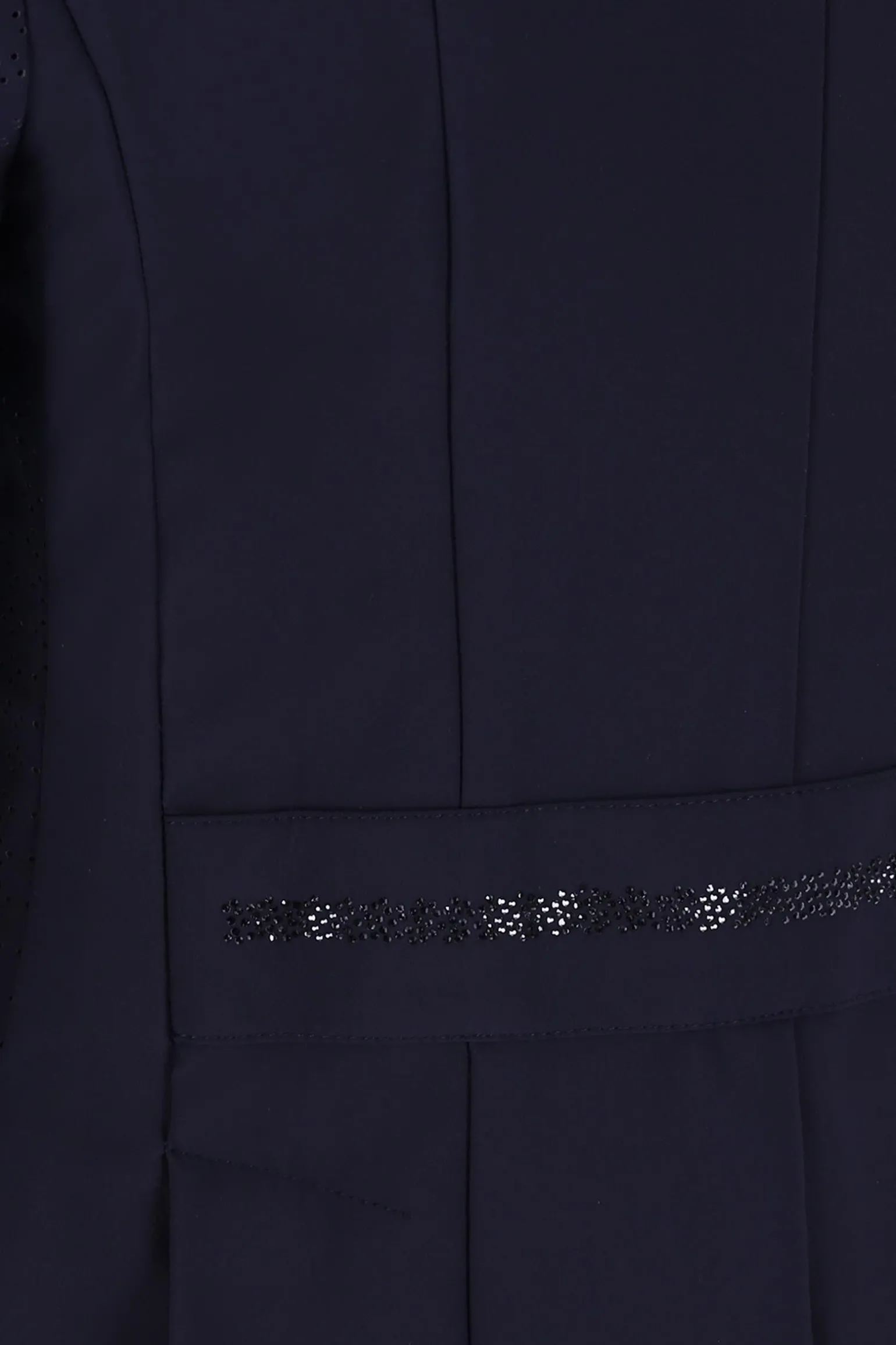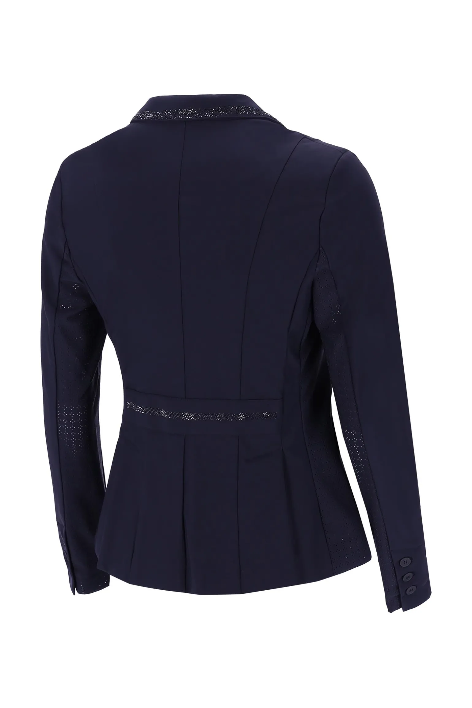 Das SPAlaine Turniersakko verbindet modischen Stil mit funktionaler Eleganz! Dieses modische, funktionale Turniersakko verfügt über Paspeltaschen mit Patten und Strass-Dekoration, die einen Hauch von Glamour verleihen. Die perforierten Seitenteile sorgen für zusätzliche Belüftung und Komfort. Die schmeichelnden Teilungsnähte und der Rückenriegel hinten betonen die Figur und bieten eine perfekte Passform. Gehschlitze ermöglichen Bewegungsfreiheit, während die Strass-Dekoration auf dem Kragen und dem Rückenriegel elegante Akzente setzt. Das Sakko hat einen Verschluss mit Knöpfen und einem verdeckt verlaufenden Reißverschluss, der für eine glatte Silhouette sorgt. Ein Logo-Rubber-Badge auf dem Ärmel rundet das Design ab.