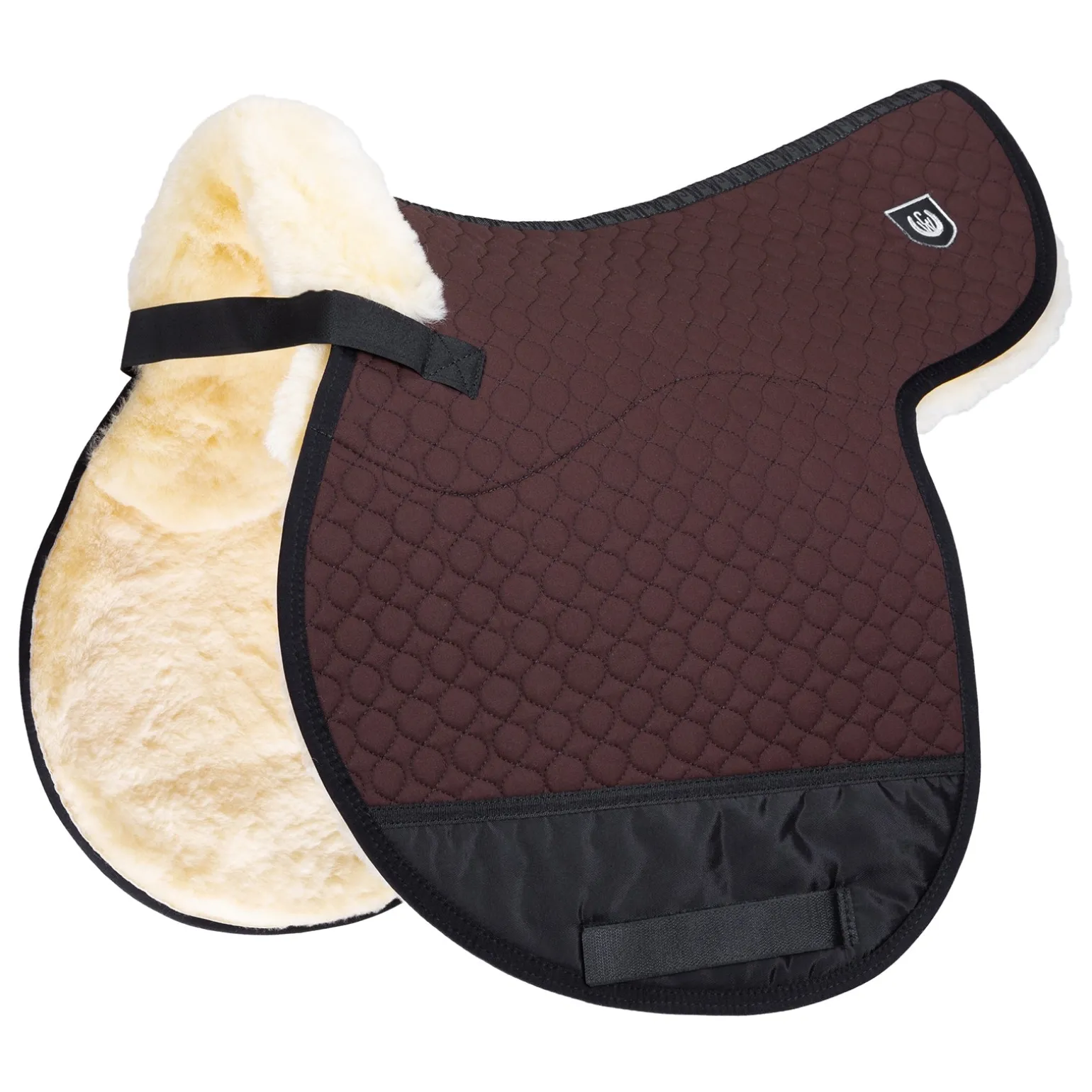 Die Satteldecke mit komplett Lammfell. Im Sitzbereich mit einer Wollhöhe von 30 mm ausgestattet und an den Blättern mit 15 mm. Durch das geschorene Lammfell im Blattbereich wird die Nähe zum Pferd gewährleistet. Befestigung mit Klettstrupfen an den Gurtriemen und Gurtführung am Blattende. Der eingearbeitete Nylonschutz verhindert das Aufscheuern im Bereich der Sattelgurtung. Vorne wird das Lammfell bis auf die Oberseite herumgezogen und dient als Sattelanlage.