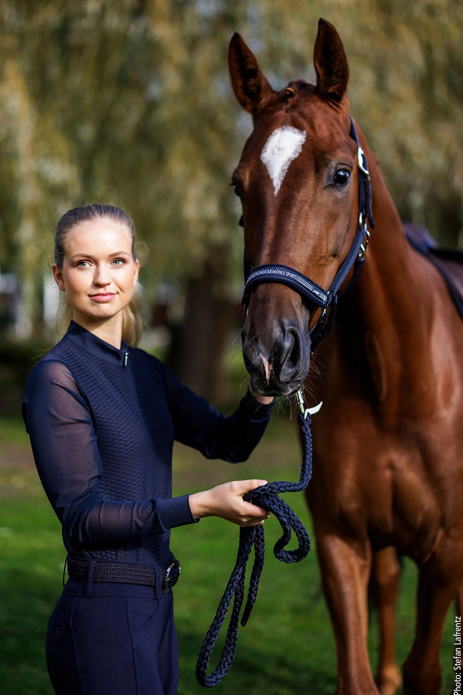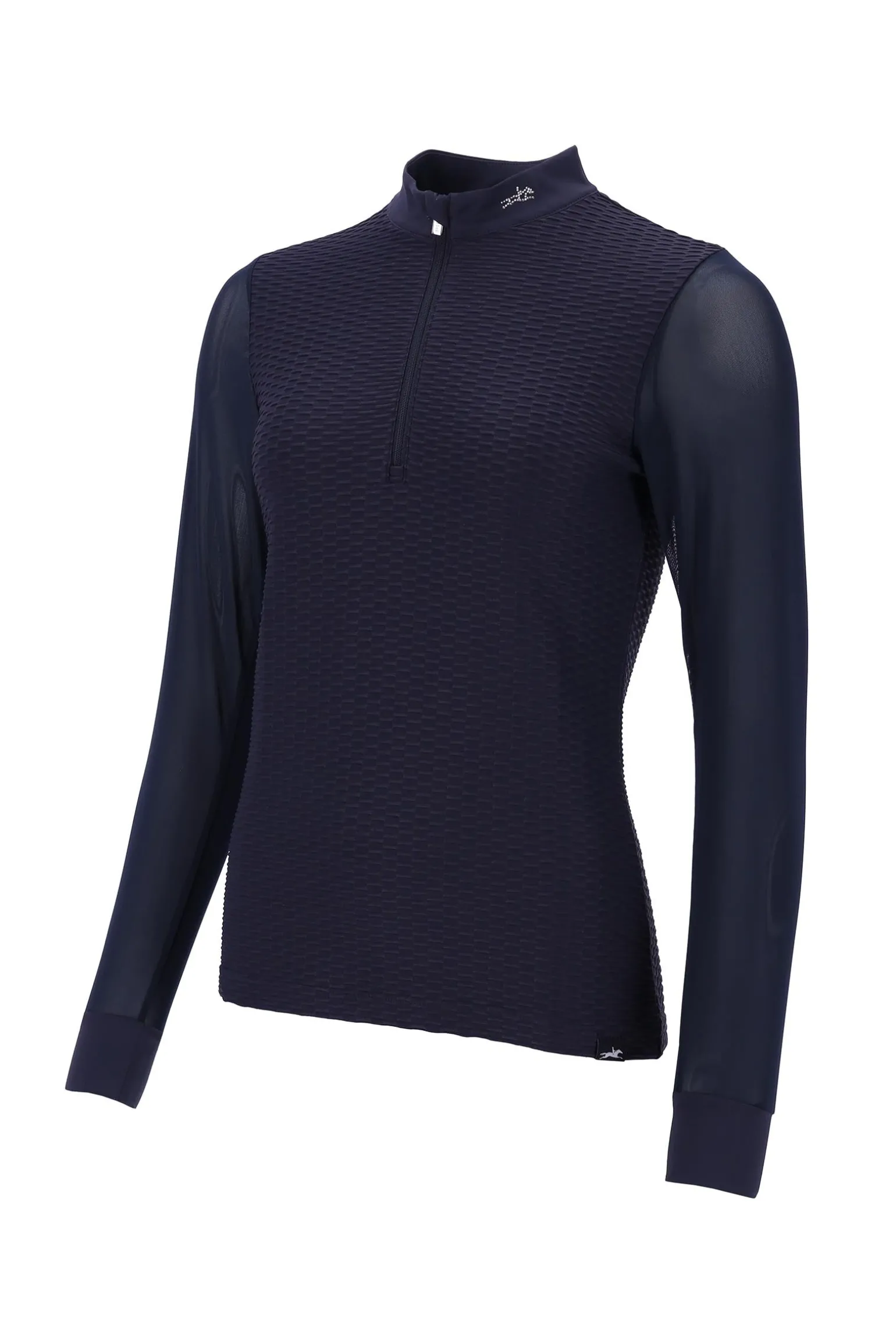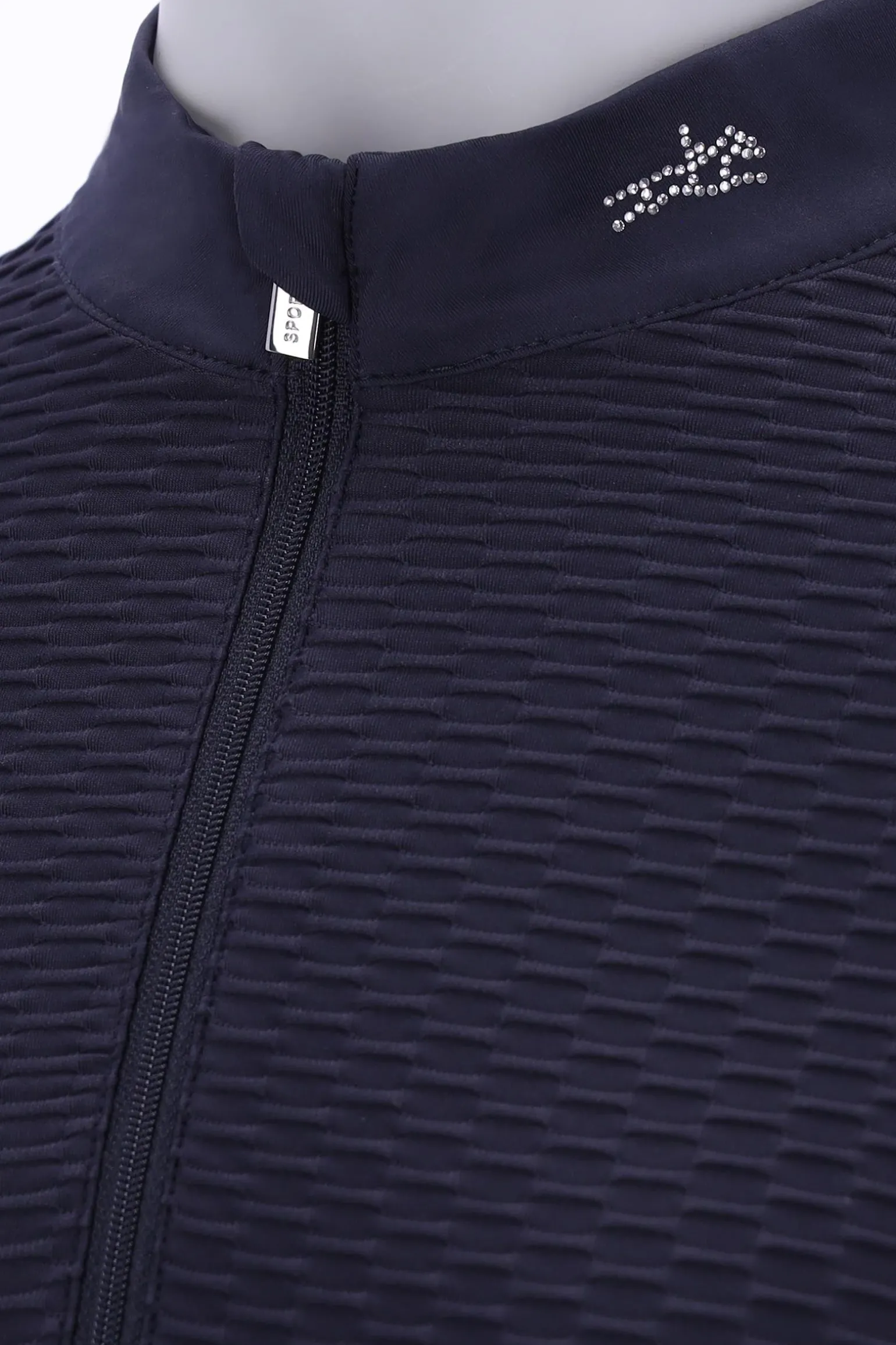 Das SPGianna Trainings- und Turniershirt vereint Funktionalität und stilvolles Design! Dieses funktionale Shirt bietet eine strukturierte Passform und hat 1/1 Ärmel mit Manschette sowie Ärmel aus transparentem Mesh, die für Belüftung und Bewegungsfreiheit sorgen. Ein praktischer Reißverschluss in der vorderen Mitte erleichtert das An- und Ausziehen und sorgt gleichzeitig für einen modernen Look. Das Highlight ist das Logo-Strass-Pferdchen auf dem Stehkragen, das dem Shirt eine elegante Note verleiht.