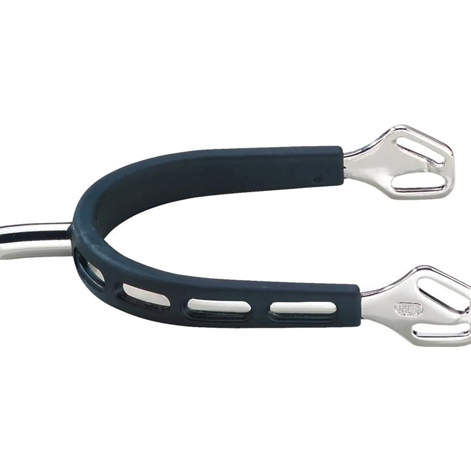 Deutsche Sporen aus Edelstahl mit Gummischutz. Schränkt das Bewegen der Sporen ein und schützt die Stiefel.