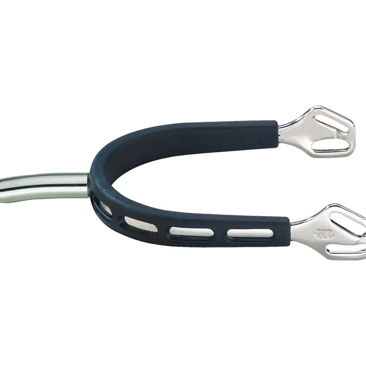 Ein Sporen mit Weichgummi-Überzug für einen besseren Sitz, der mit seiner schönen Optik sehr elegant am Reitstiefel wirkt. Durch die neue Sporenriemenführung wird der Stiefel zusätzlich geschont.