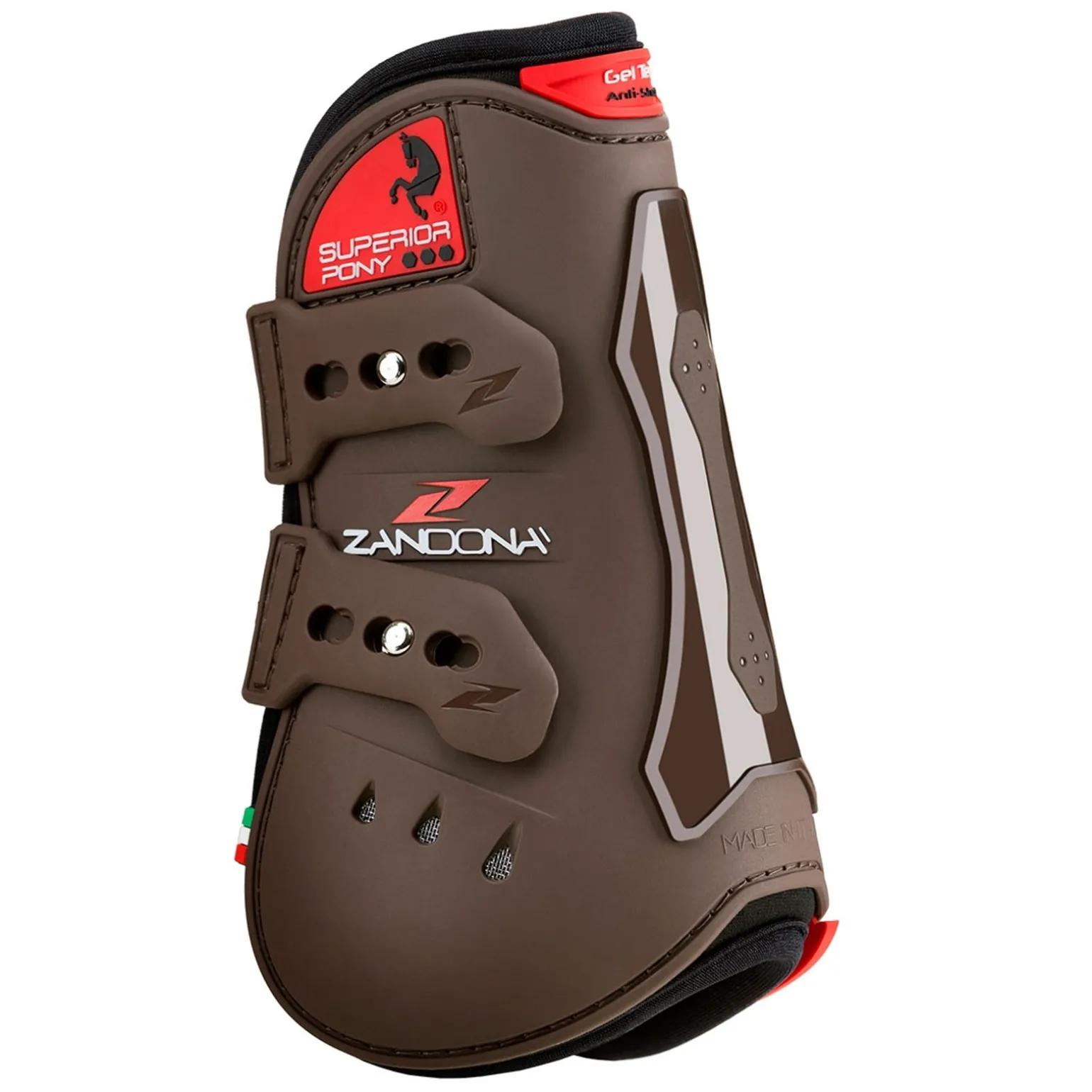 Das zu 100 % in Italien hergestellte Schutzsystem „SUPERIOR AIR PONY Tendon“ wurde entwickelt, um Springponys vor Aufprall und Hämatomen an den vorderen Fesseln und einem Teil des Schienbeins zu schützen und gleichzeitig Halt für die Sehnen zu bieten. Es besteht aus einer äußeren TPU-Struktur mitdifferenzierter Dicke, atmungsaktiv dank des perforierten Neoprens und belüftet mit 6 Lüftungsöffnungen über der Fessel. Zwischen der äußeren TPU-Struktur und dem Neoprenschutz befindet sich Gel-Tech, das, wenn nötig, als Stoßdämpfer und ansonsten als bequemes Polster dient. Auf der Innenseite, zum langen Fesselknochen hin geschlossen, wurde eine Flex-Zone geschaffen, die nötig ist, um dem Bein maximale Bewegungsfreiheit zu geben. Die elastischen Bänder mit Schnellöffnern wurden für einen sicheren Verschluss kalibriert, der eigentlich aus einem doppelten Verschlusssystem besteht (horizontal/vertikal). Die Maße und die absolut ergonomische Form wurden als genaue Kopie der Beinstruktur entwickelt, was eine perfekte Positionierung garantiert und jegliche Spannung vermeidet.