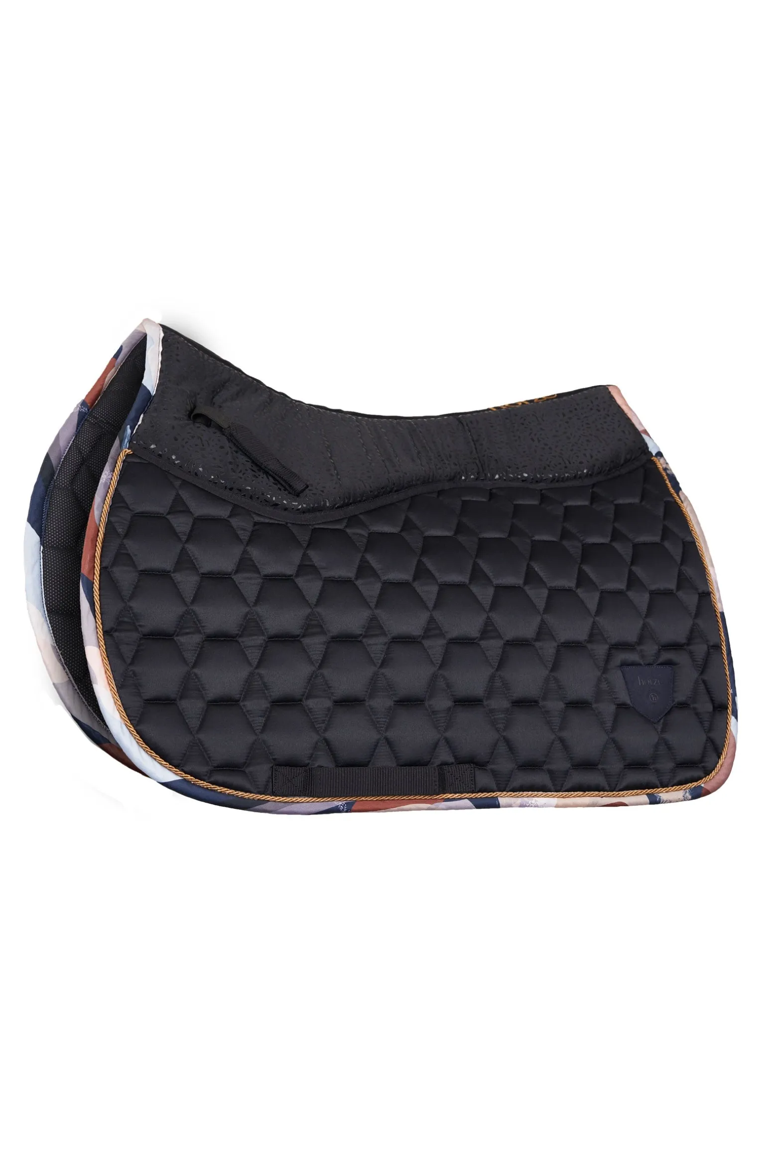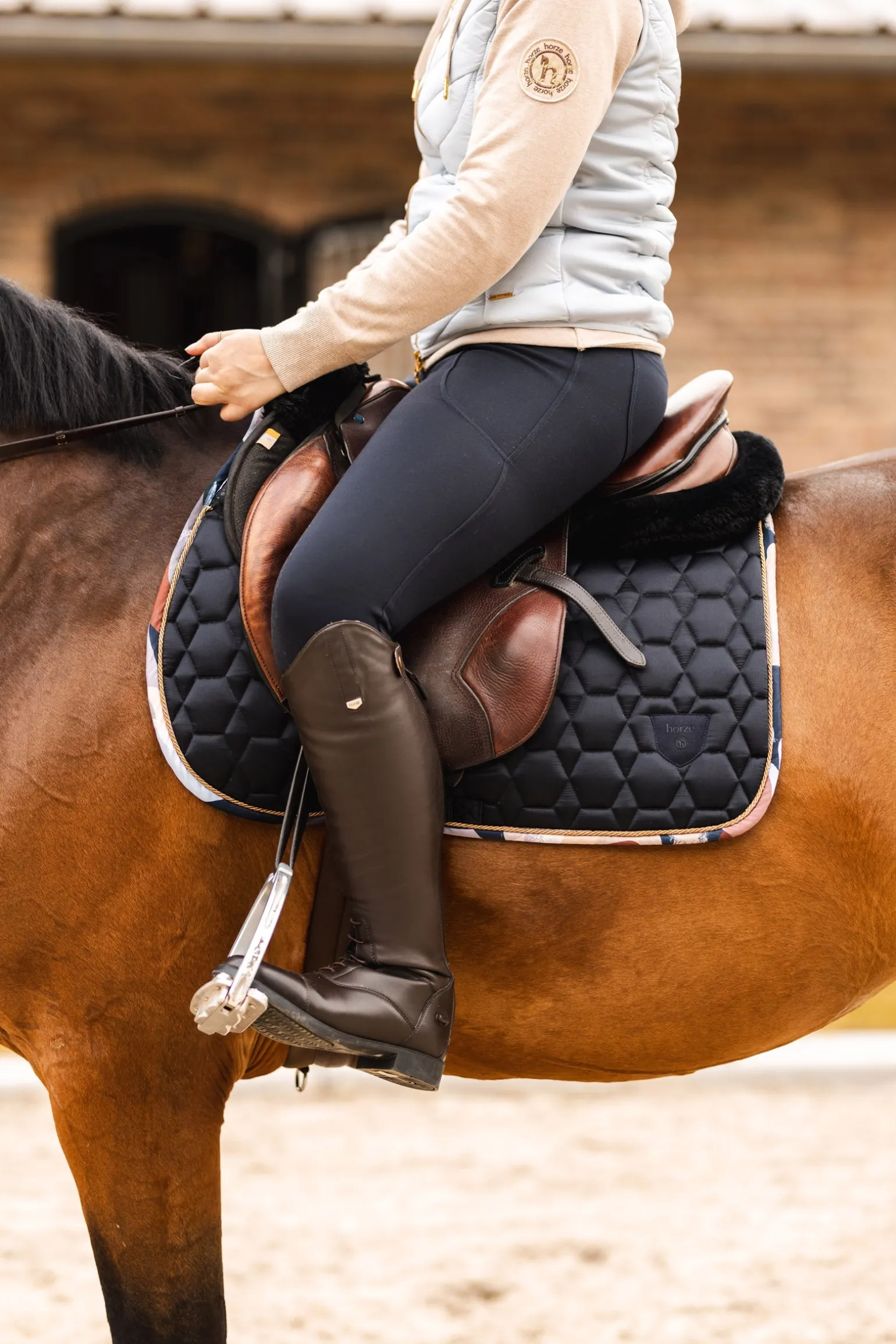 Diese Schabracke besteht aus einem satinähnlichen Material, das deinem Reitoutfit einen Hauch von Eleganz verleiht. Die gepolsterte Sattelfläche ist mit einem rutschfesten Silikonaufdruck versehen, der für einen sicheren und stabilen Sitz des Sattels sorgt. Die verstellbaren Gurtschlaufen und die langen Sattelbefestigungsriemen sorgen für eine individuelle und sichere Befestigung an deinem Sattel. Das gesteppte Muster sorgt für einen klassischen Look, während das feuchtigkeitsableitende Futter dein Pferd trocken und komfortabel hält. Mit der kontrastierenden Einfassung und dem Horze-Logo zeigt diese Schabracke, wie viel Liebe zum Detail in ihr steckt. Die Vielseitigkeitsschabracke Terrazzo von Horze ist ein Muss für jeden Reiter.