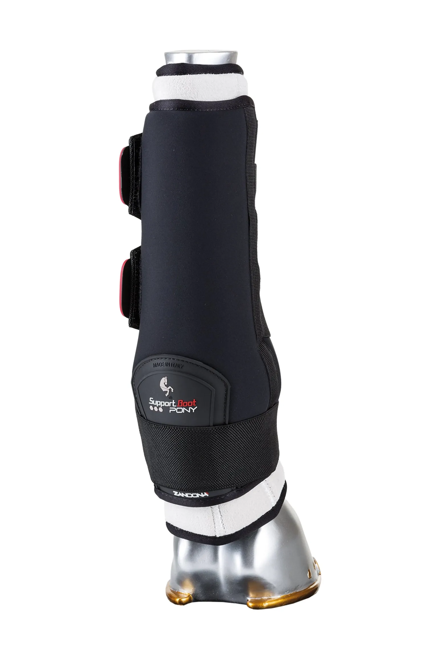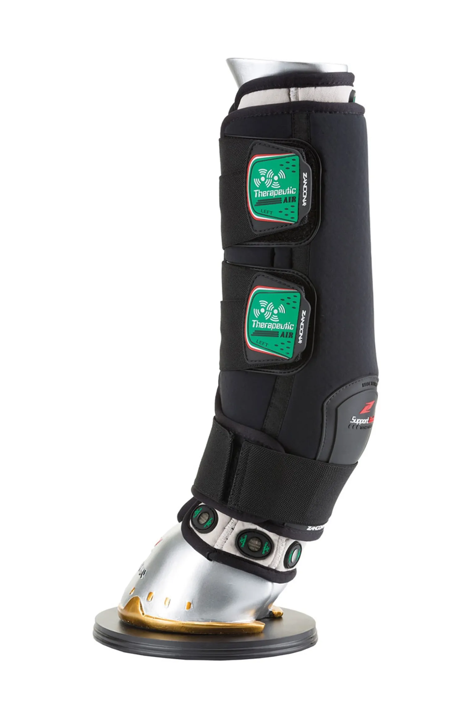 Die Stallgamaschen „THERAPEUTIC SUPPORT BOOT“ haben 18 angeordnete Magnete, welche die zelluläre Funktion verbessern, was wiederum eine natürliche therapeutische Unterstützung vom Huf zum Röhrbein ist und somit eine Art Fußreflexzonenmassage für den ganzen Körper ist.Sie sind 2 Produkte in 1, denn sie wurden auch dazu entwickelt, den Bandapparat und die Sehnen zu unterstützen, während das Pferd transportiert wird und um die typischen Schwellungen nach dem Training zu verringern. Sie sind zu 100% in Italien hergestellt und mit auswechselbarem Innenband aus COOL-MAX® (spezielle Faser, die Feuchtigkeit zur Außenfläche des Gewebes transportiert, um die Haut trocken zu halten) ausgestattet. Auf der äußeren Schicht, direkt am Fesselgelenk, ist ein zusätzlicher Schutz aufgebracht, der Die Stall- und Transportgamaschen “THERAPEUTIC SUPPORT BOOT AIR” sind mit 18 Magneten ausgestattet, die die Zellfunktionen verbessern können und eine natürliche therapeutische Unterstützung von Huf bis zum Schienbein, sowie eine Reflexzonenmassage des gesamten Pferdes bieten.