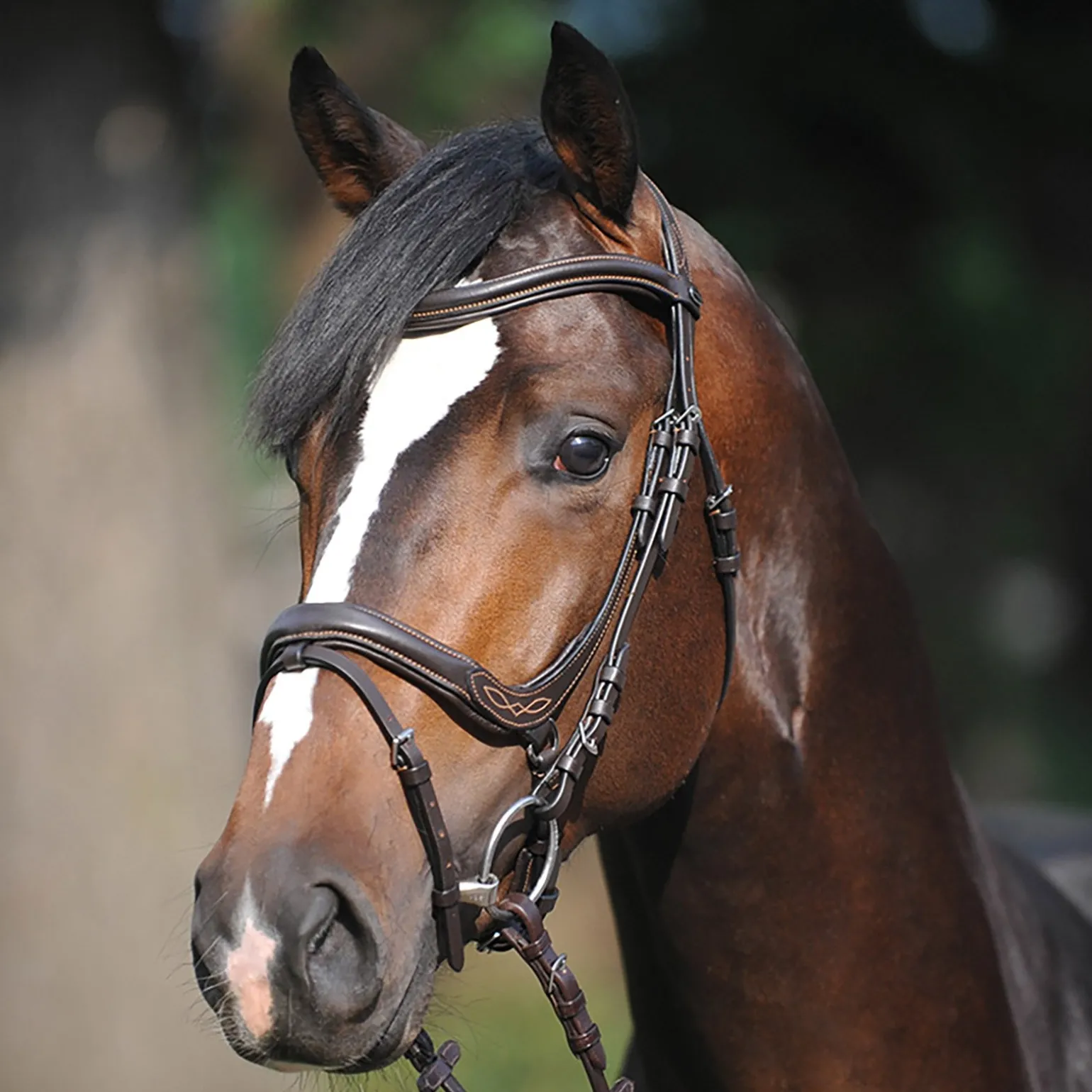 Englische Trense mit anatomischem Genickstück, geschwungenem Nasenriemen und Gummizügeln.