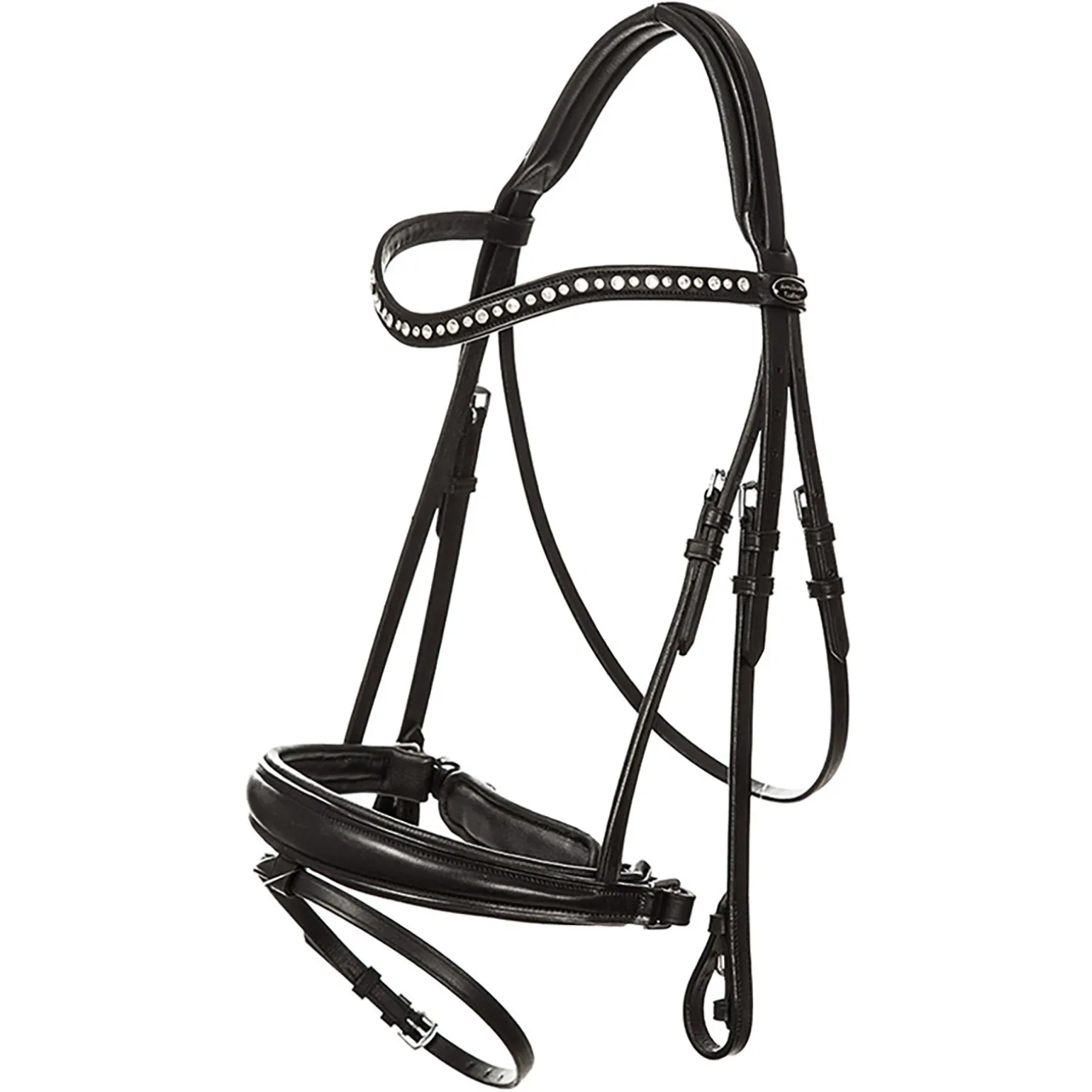 Unsere schwedisch-kombinierte Trense Mia ist unsere beliebteste Dressurtrense! Sie besteht aus sehr gutem Qualitätsleder. Dabei steht dieses Leder für sehr gute Langlebigkeit und Robustheit beim täglichen Arbeiten. Das Stirnband hat verschraubte Strasssteine in unterschiedlichen Größen. Deutlich langlebiger Halt jedes Steinchen. Genickstück und Nasenriemen sind weich gepolstert und schmiegen sich dem Pferdekopf optimal an. Das Reithalfter ist überlaufend, sodass weniger Verschnallungen notwendig sind. Der Nasenriemen wird zu den Seiten schmaler, um zusätzlichen Druck auf die seitlichen Nervenbahnen zu entlasten.