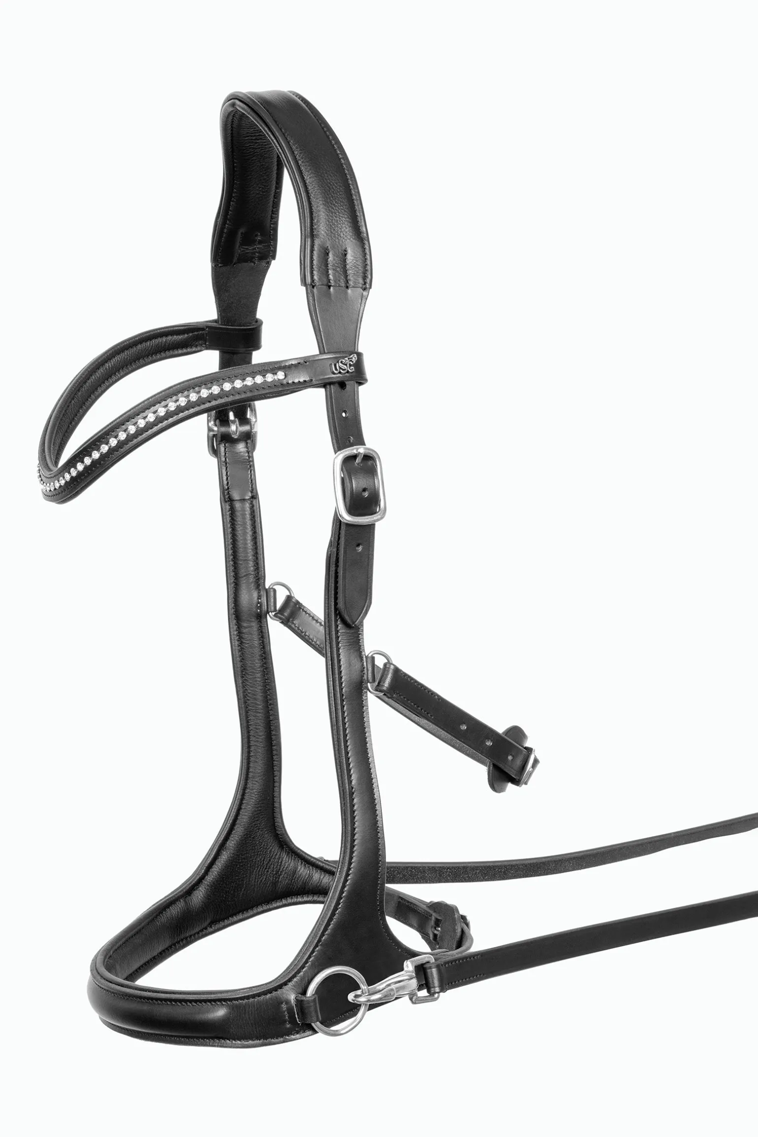 Gebisslose Zäumung, lederunterlegt, Gurtzügel, geschwungener Stirnriemen mit Glitzersteinen, die sanfte Alternative zum Reiten mit Gebiss.