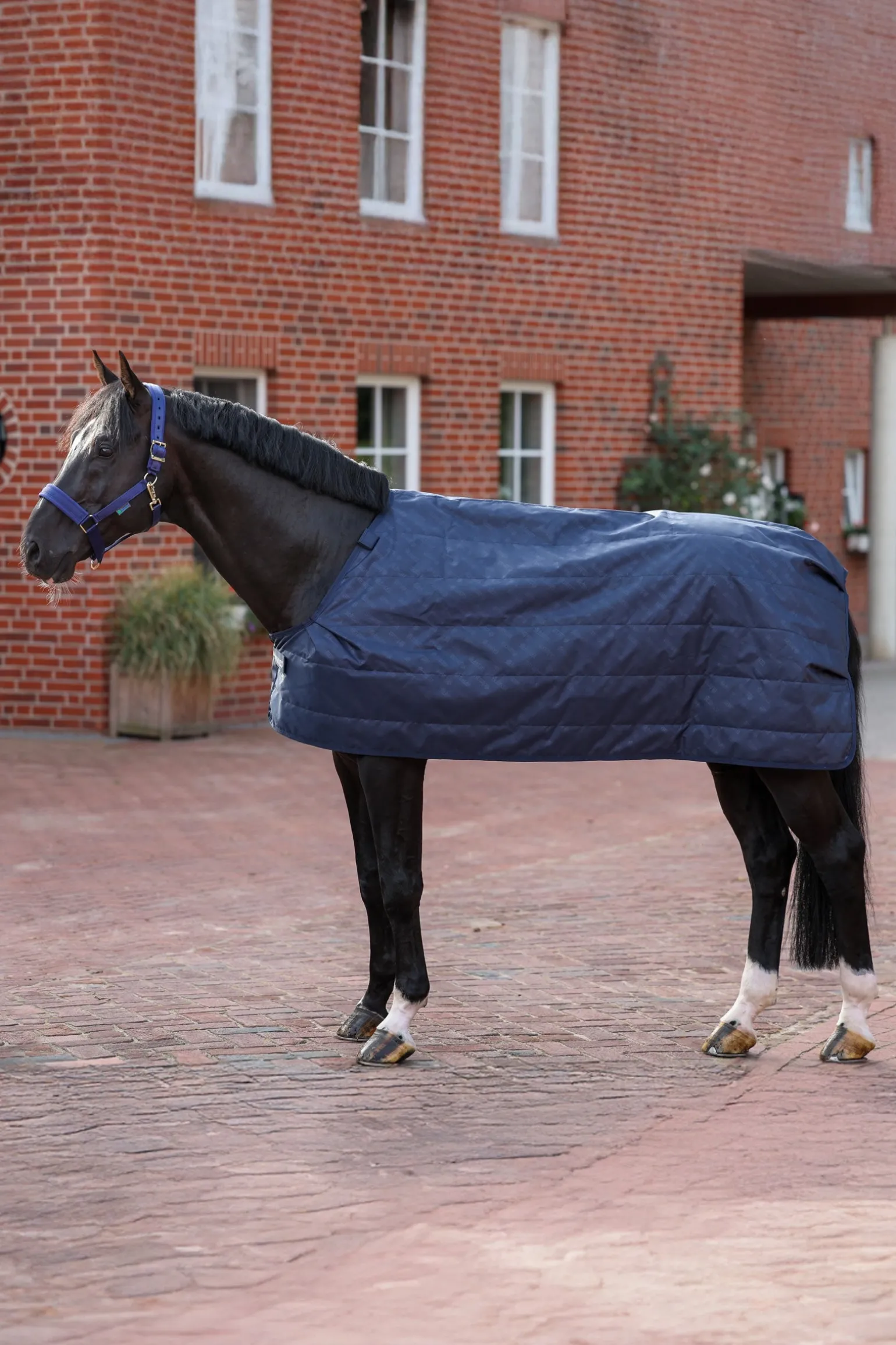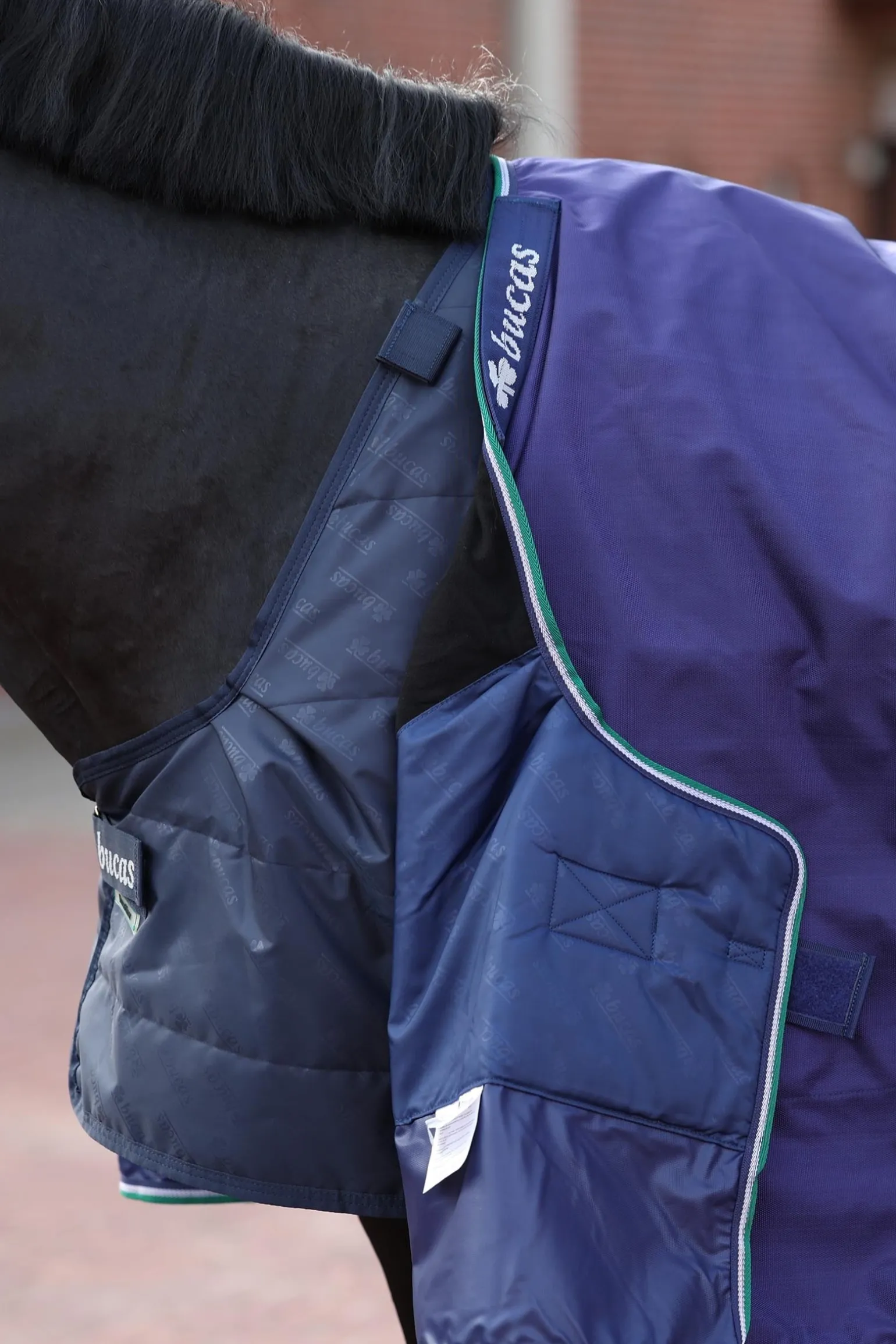 Der vordere Halsverschluss wird an den Halsbefestigungspunkten angebracht, und der hintere Klettverschluss wird an den hinteren D-Ringen Ihrer oberen Decke befestigt. Der seidige Polyester-Außenstoff verhindert, dass Einstreu an Ihrer Decke haften bleibt, während Schulterabnäher ausreichend Platz rund um die Schultern gewährleisten.