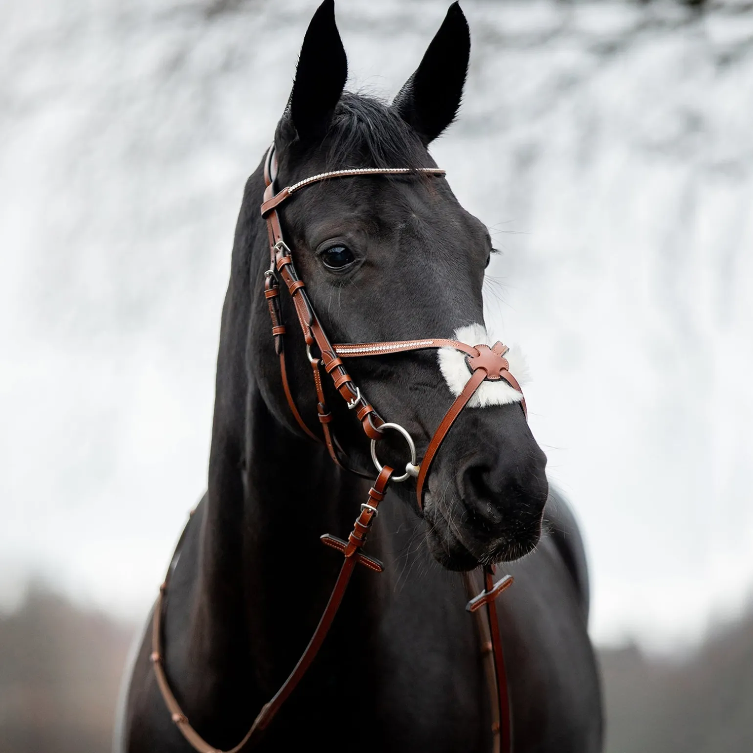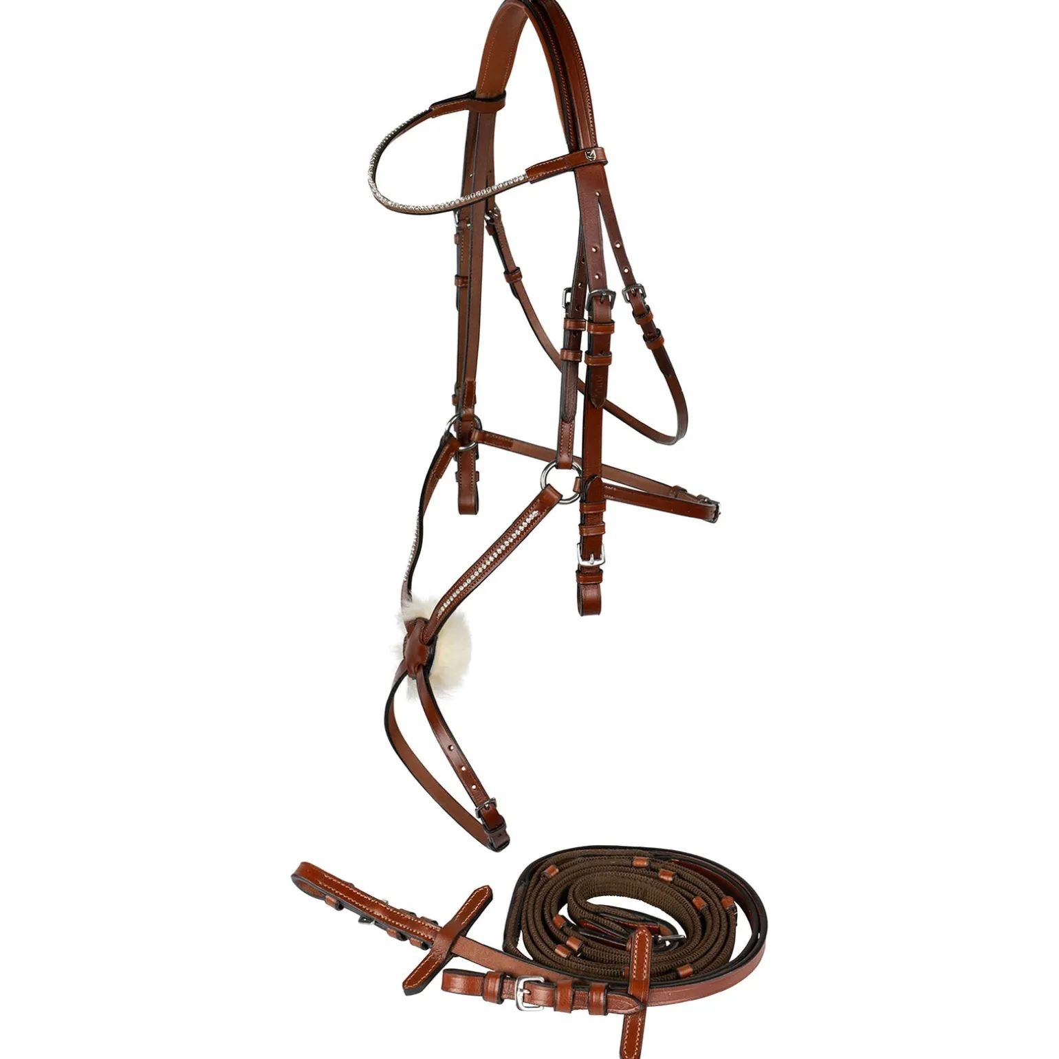 Das mexikanische Reithalfter Horze Valencia ist die klassische Wahl für Vielseitigkeit oder Springen und dieses Modell hat einen besonderen Stil zu bieten. Der wie eine 8 geformte Nasenriemen ist mit Kristallen veredelt, um passend zum geraden Stirnriemen für einen tollen Look zu sorgen. Eine weiche, kreisförmige Polsterung aus Wolle an der Nase verhindert reiben oder scheuern. Lass dich von diesem eleganten Zaumzeug mit den passenden Zügeln begeistern.