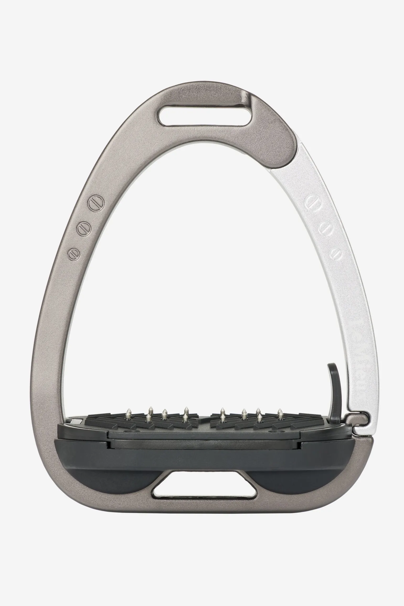 Die Trittfläche wird durch ein Twin-Balance-Bogensystem gestützt, das das Gewicht gleichmäßig auf die Basis des Steigbügelrahmens verteilt. Der Scheitelpunkt des Rahmens ist vertieft und versetzt, was eine 45º-Ausrichtung nach außen fördert und es dem Reiter erleichtert, den optimalen Winkel für den Fuß zu finden und einen verlorenen Steigbügel wiederzufinden.