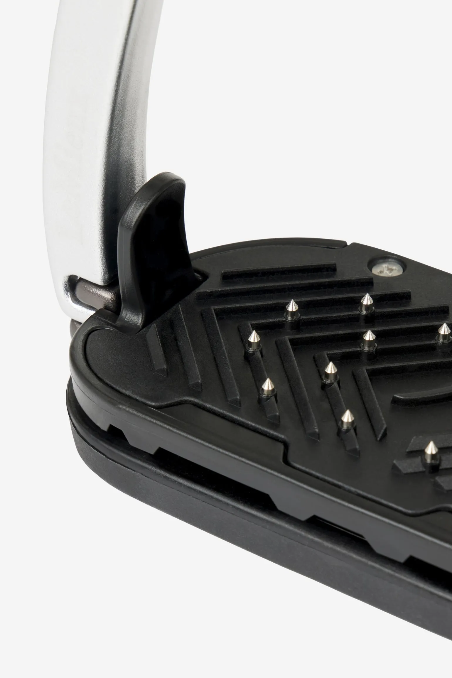 Die ergonomische Trittfläche des Balance Steigbügels ist auf 5º eingestellt, hat eine quer verlaufende Grifffläche und ist auf einer stoßabsorbierenden Schicht aus dynamischem Polymer mit einer Kompression von 70% montiert. Stöße und Vibrationen werden beim Sprung an der Landestelle absorbiert, was die Ermüdung von Knie und Knöchel reduziert und die Belastung von Beinmuskeln und Sehnen verringert. Die eingebetteten gehärteten Stahlstifte sorgen für maximale Sicherheit des Schuhs.