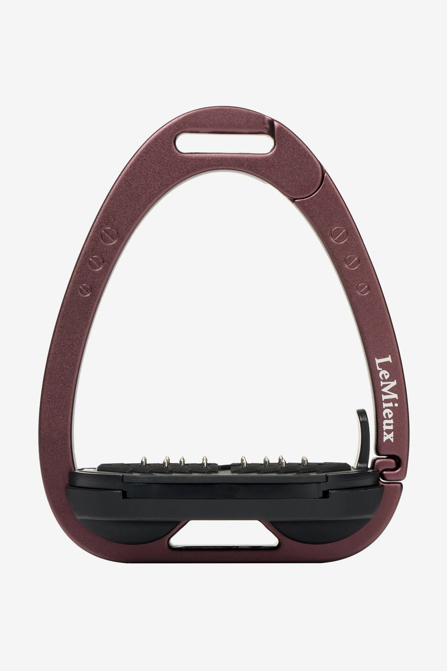 Die Trittfläche wird durch ein Twin-Balance-Bogensystem gestützt, das das Gewicht gleichmäßig auf die Basis des Steigbügelrahmens verteilt. Der Scheitelpunkt des Rahmens ist vertieft und versetzt, was eine 45º-Ausrichtung nach außen begünstigt, was es dem Reiter erleichtert, den optimalen Winkel für den Fuß zu finden und einen verlorenen Steigbügel wiederzufinden.