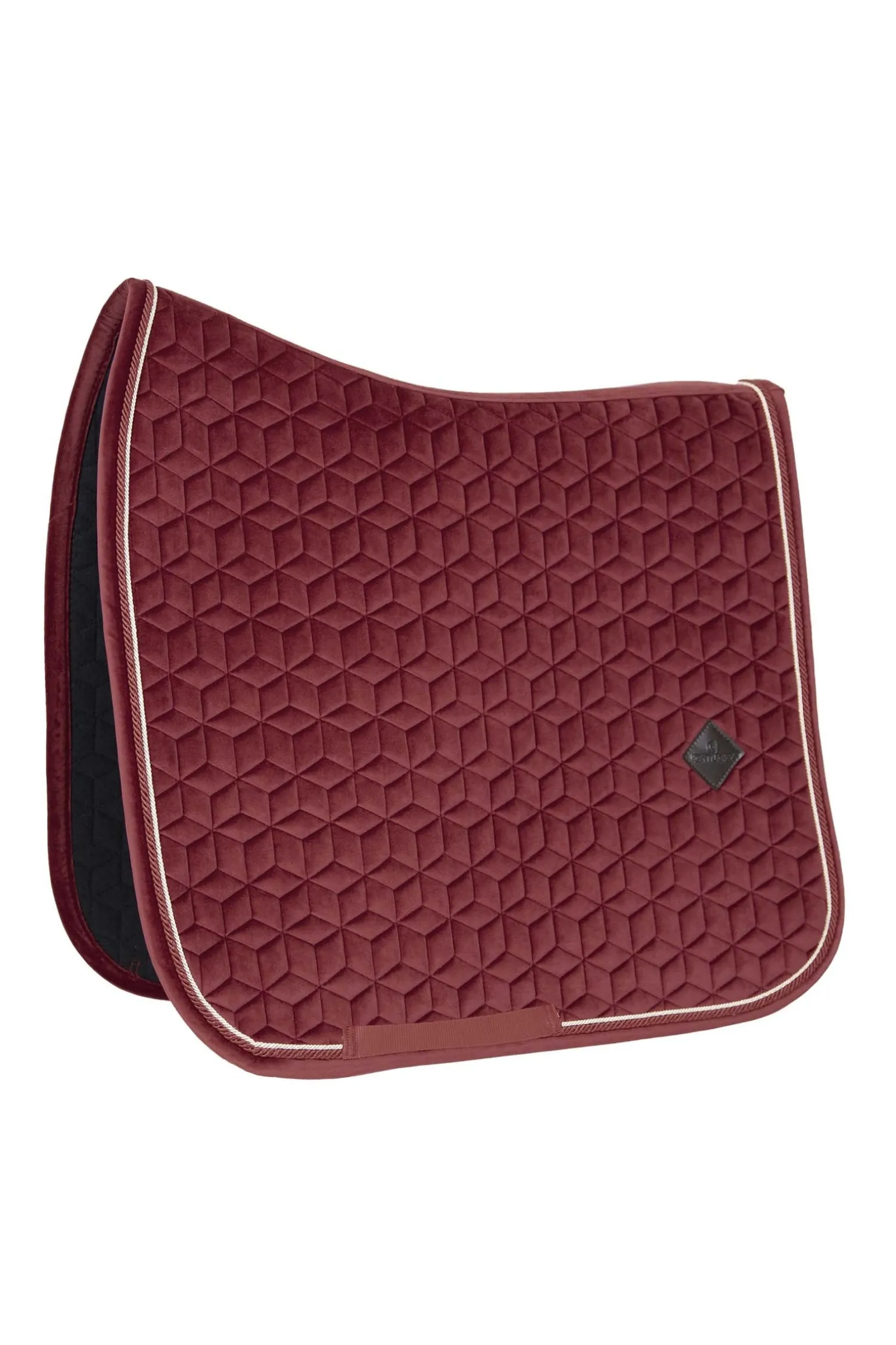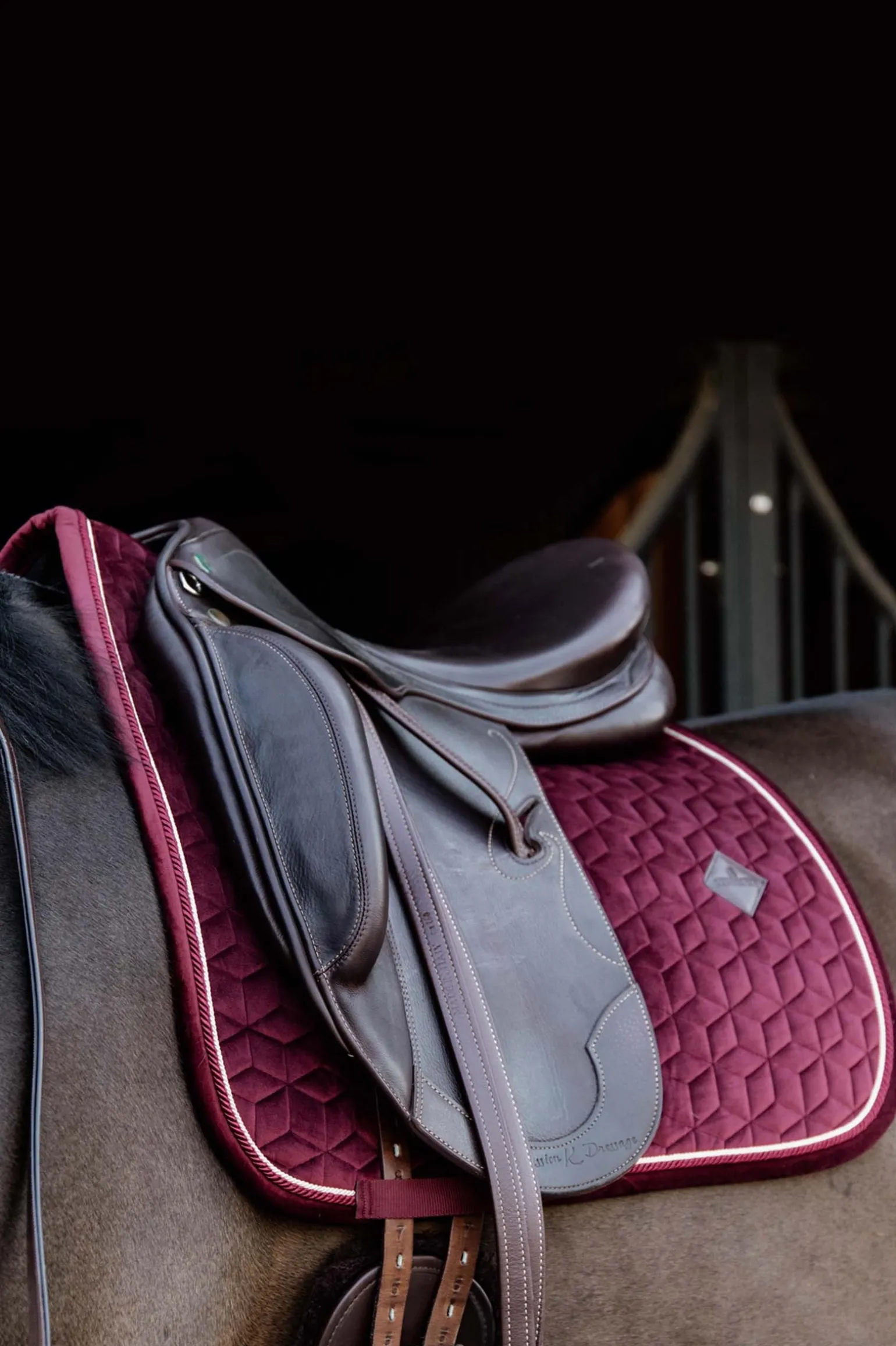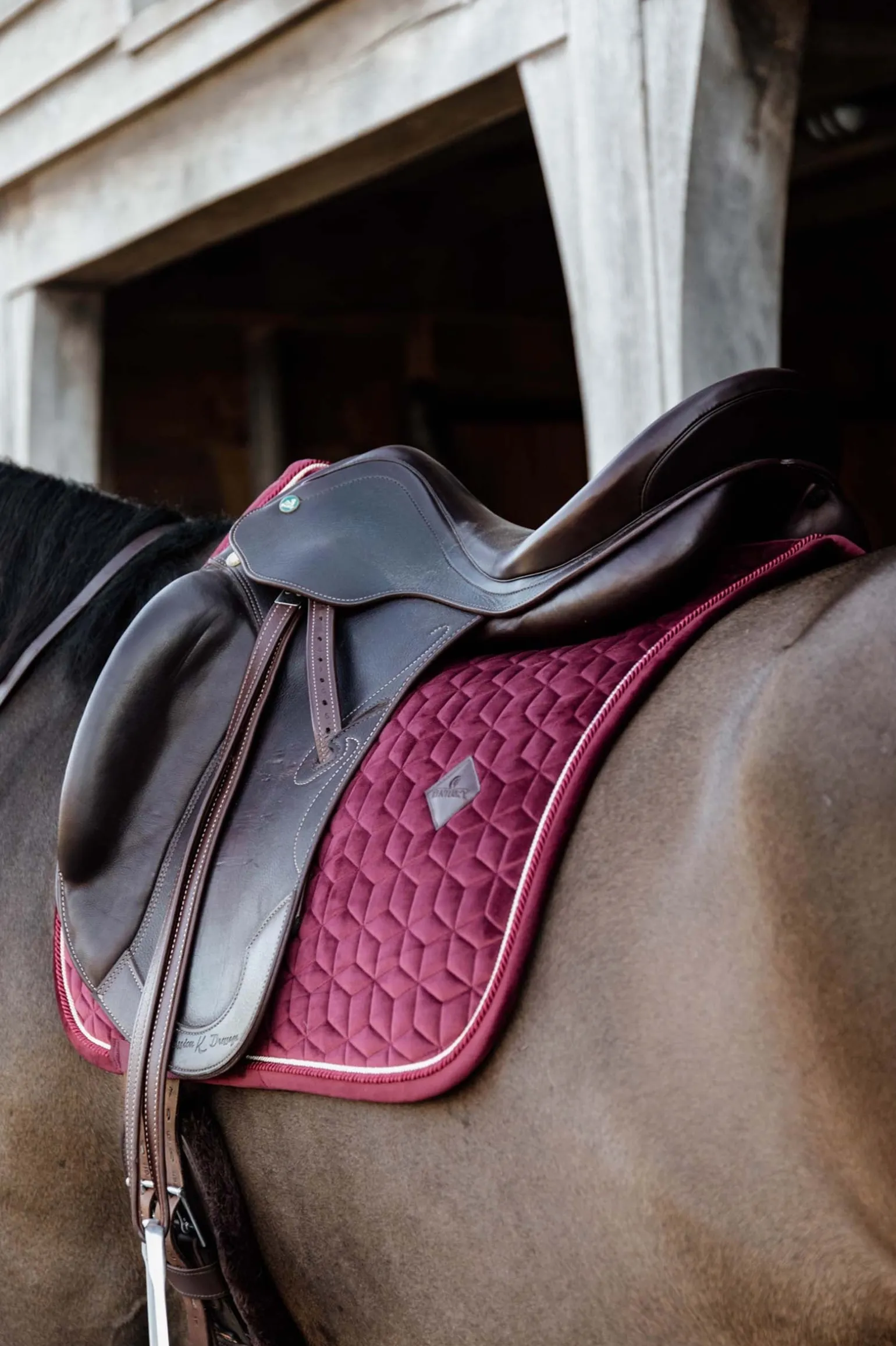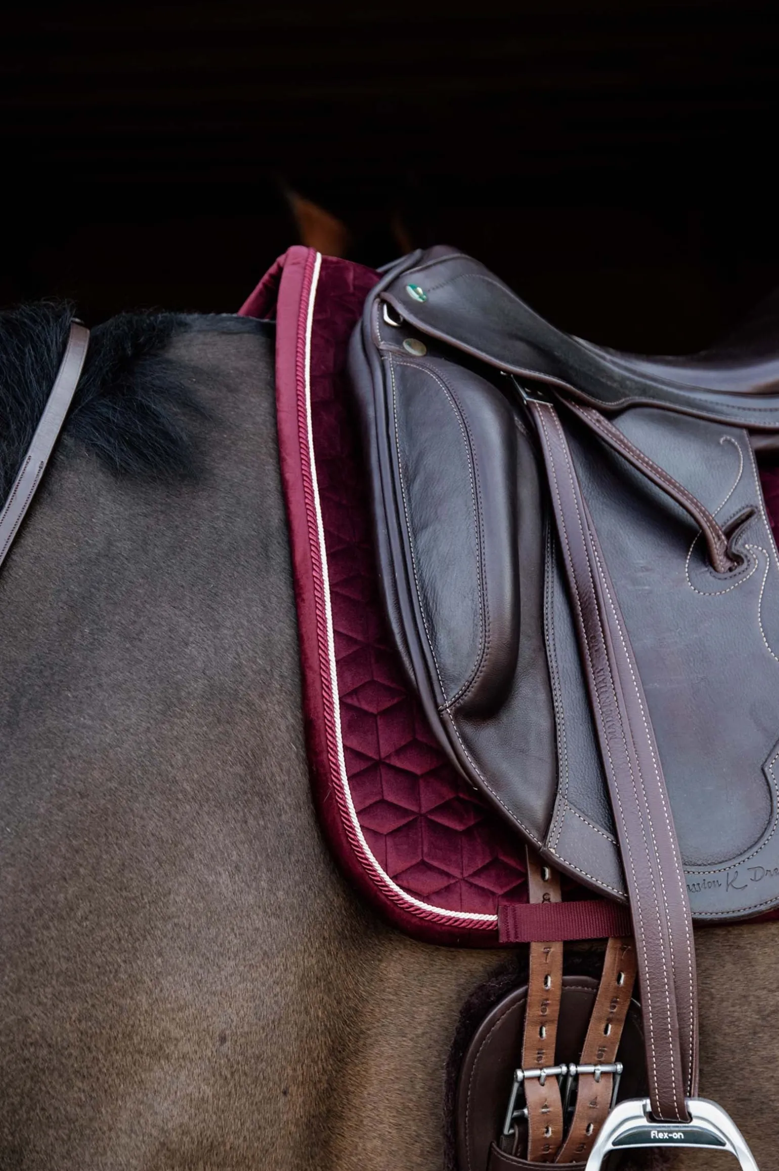 Super stylische und stilvolle Schabracke aus Samt mit doppelt gedrehter Bordüre. Die Samtschabracke ist für die Dressur designed und bietet hervorragende Polsterung zwischen dem Rücken des Pferdes und dem Sattel und schützt gleichzeitig vor Verspannungen. Die Schabracke hat keine lästigen Schlaufen zur Befestigung am Sattel, sondern nur einen Nylonriemen für den Gurt. Das dezente Logo aus Kunstleder ist immer an einer zentralen, etwas höheren Stelle platziert, so dass bei Bedarf immer Platz für die Bestickung mit ihrem eigenen Logo verfügbar ist.