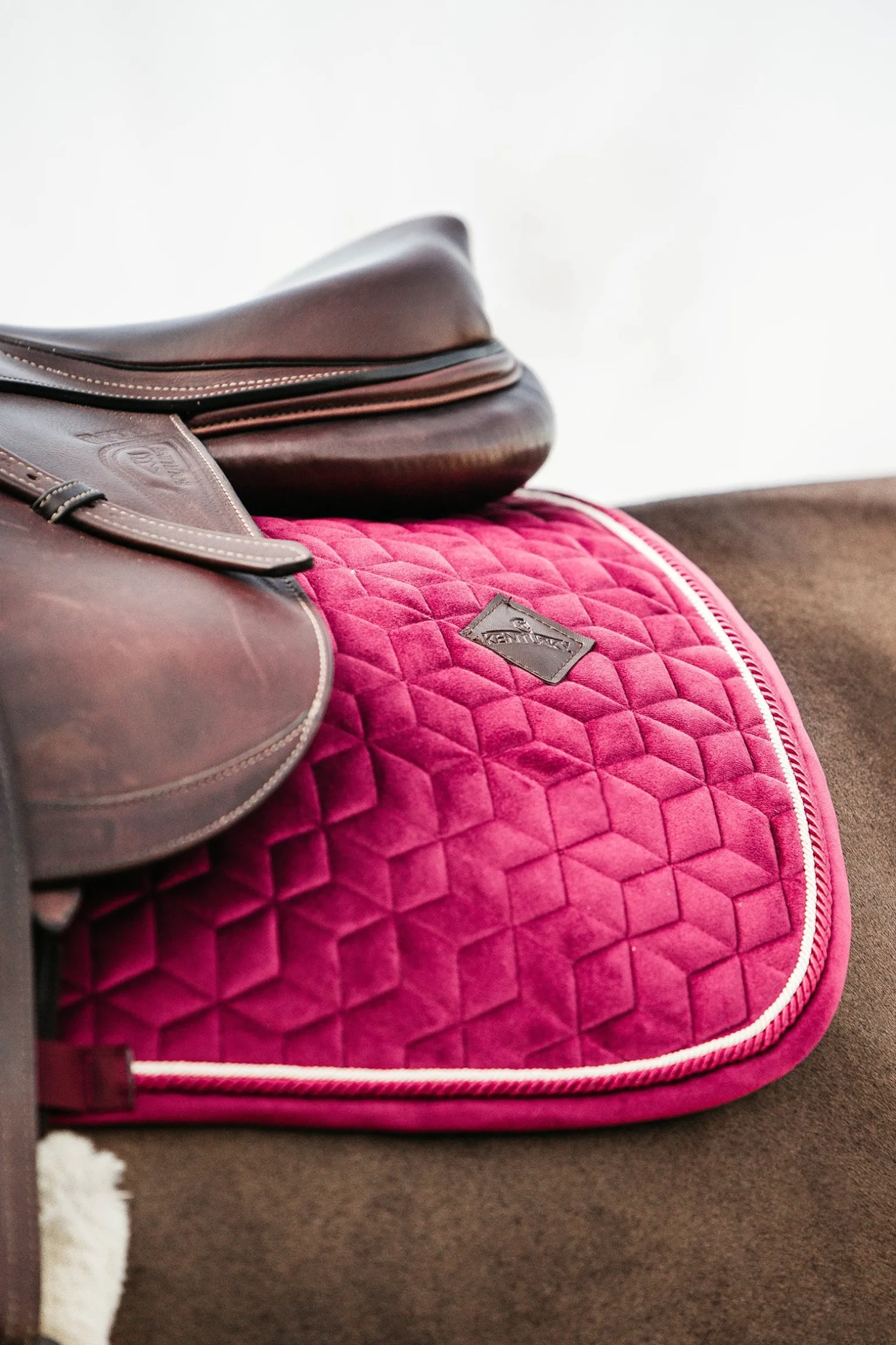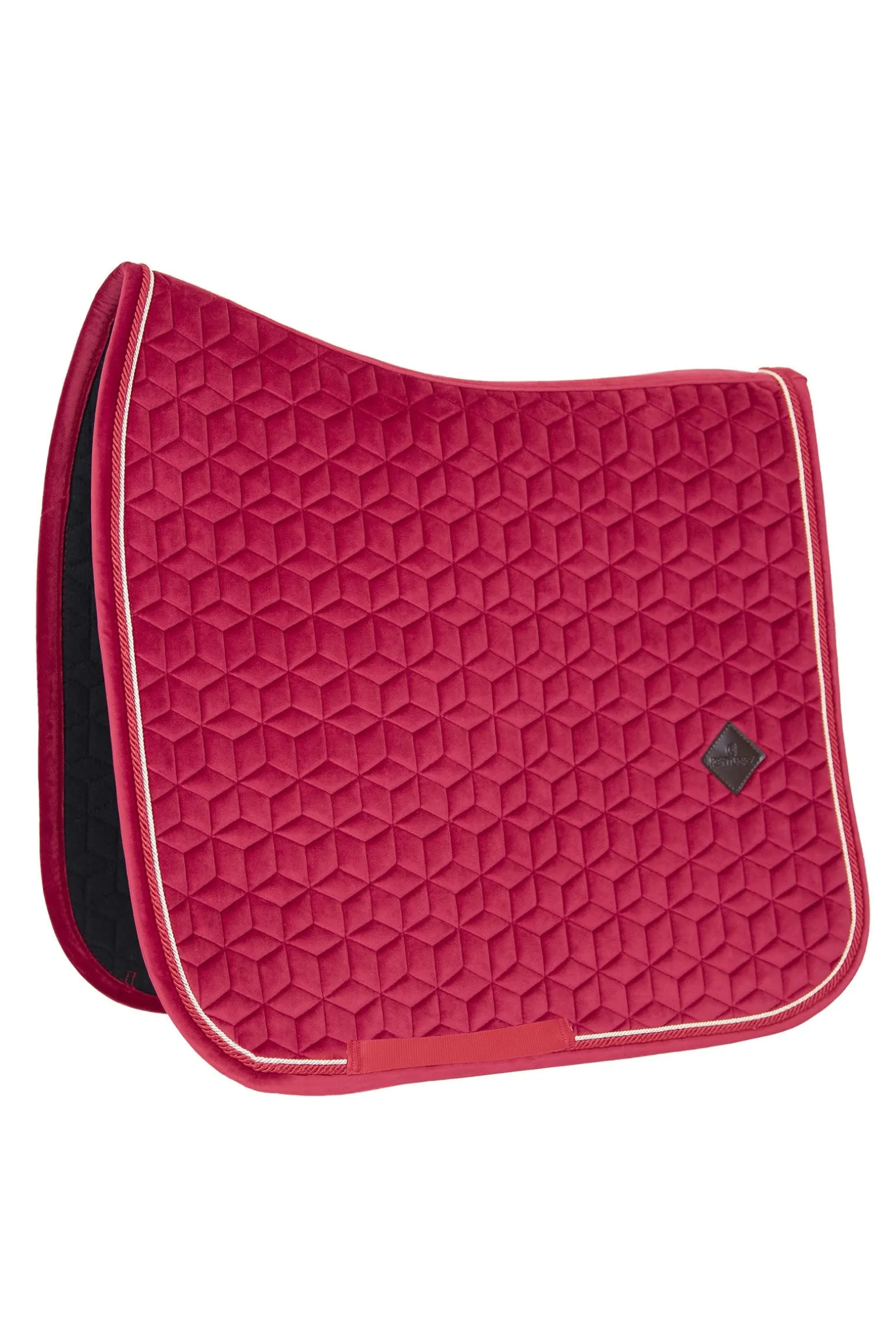 Super stylische und stilvolle Schabracke aus Samt mit doppelt gedrehter Bordüre. Die Samtschabracke ist für die Dressur designed und bietet hervorragende Polsterung zwischen dem Rücken des Pferdes und dem Sattel und schützt gleichzeitig vor Verspannungen. Die Schabracke hat keine lästigen Schlaufen zur Befestigung am Sattel, sondern nur einen Nylonriemen für den Gurt. Das dezente Logo aus Kunstleder ist immer an einer zentralen, etwas höheren Stelle platziert, so dass bei Bedarf immer Platz für die Bestickung mit ihrem eigenen Logo verfügbar ist.