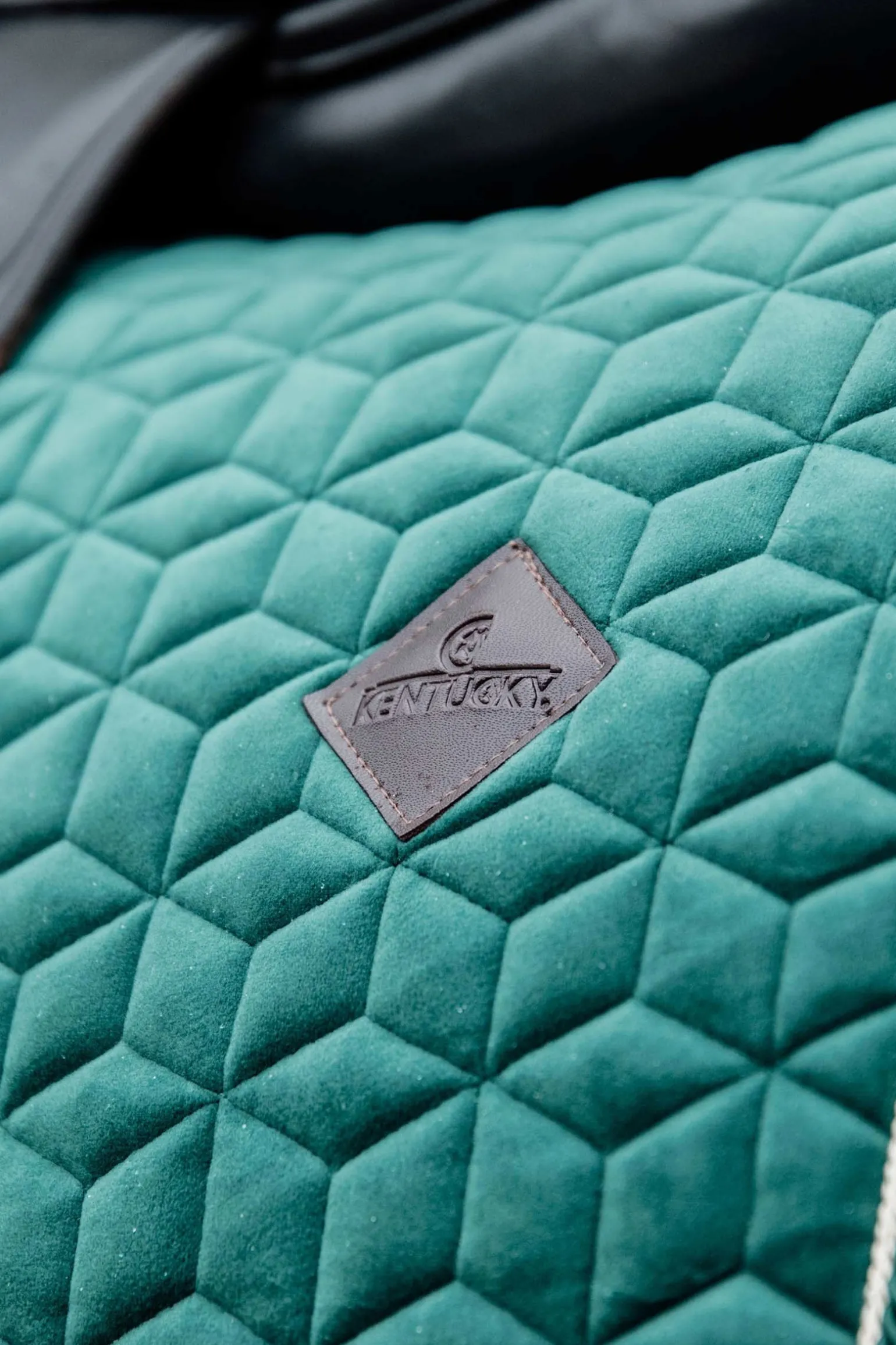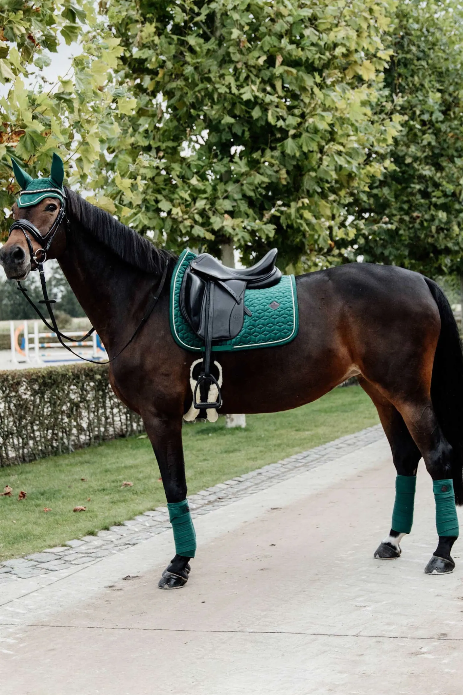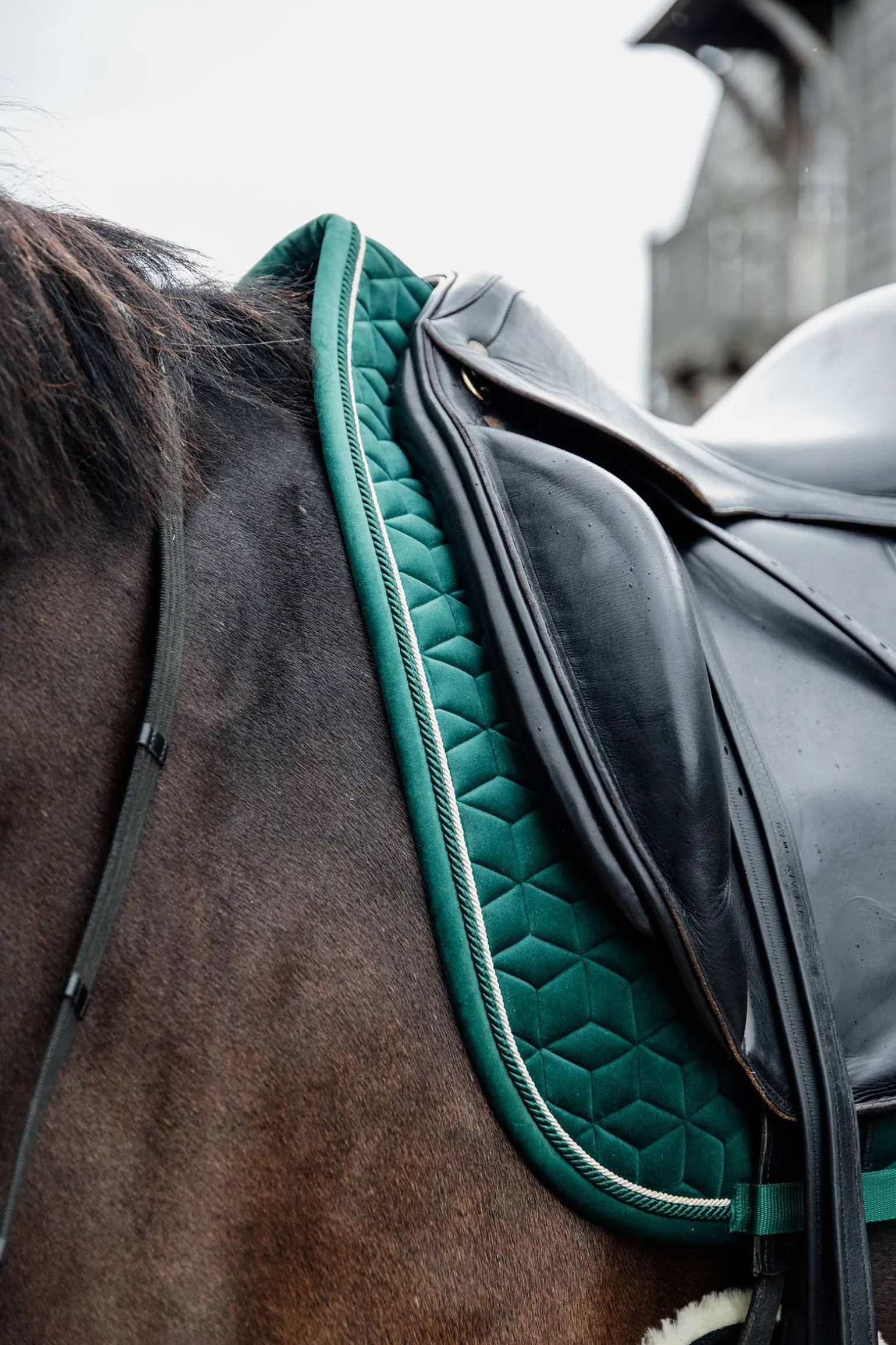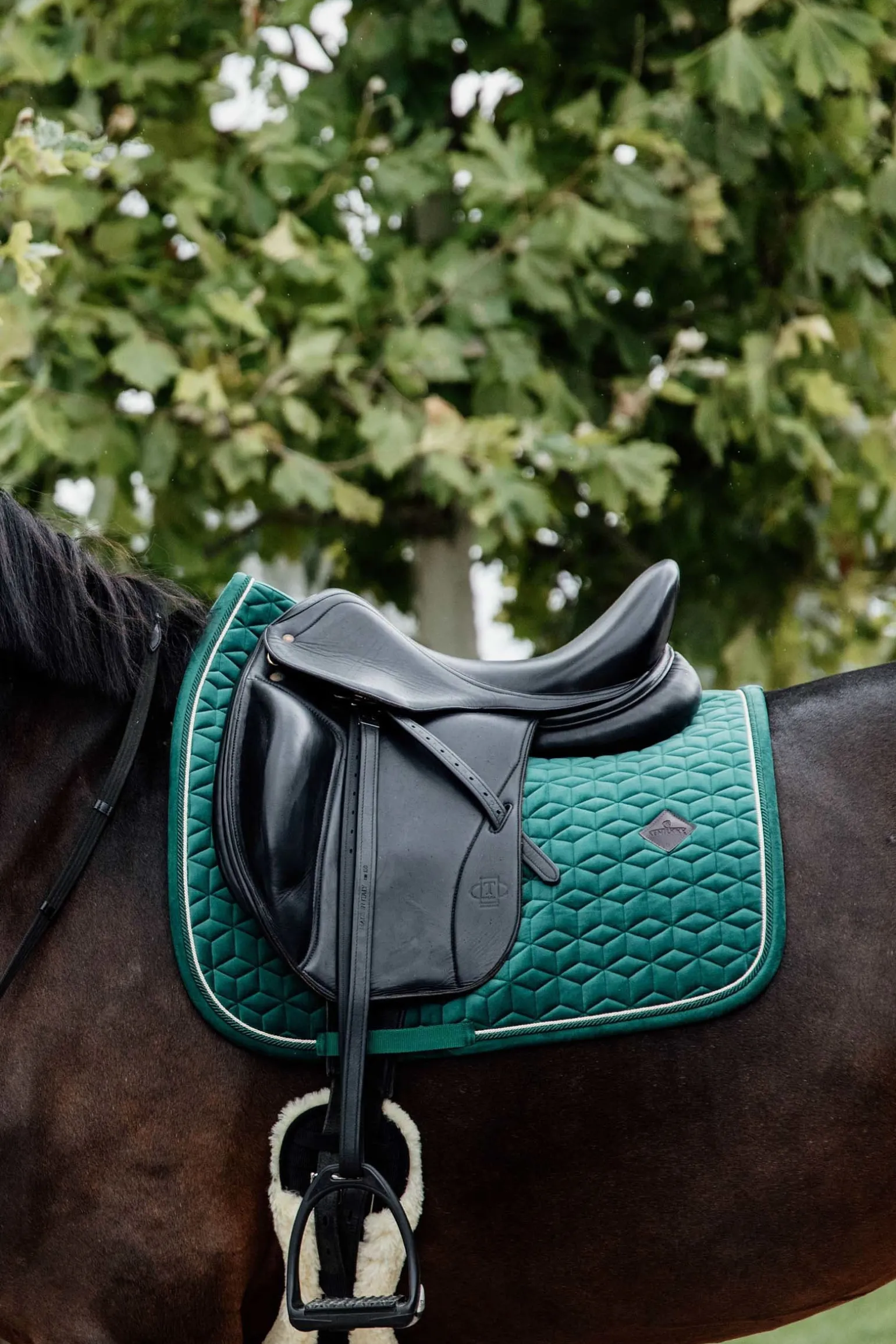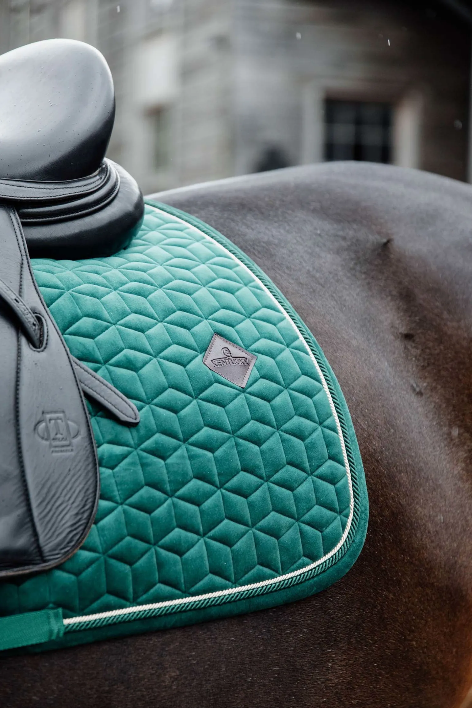 Super stylische und stilvolle Schabracke aus Samt mit doppelt gedrehter Bordüre. Die Samtschabracke ist für die Dressur designed und bietet hervorragende Polsterung zwischen dem Rücken des Pferdes und dem Sattel und schützt gleichzeitig vor Verspannungen. Die Schabracke hat keine lästigen Schlaufen zur Befestigung am Sattel, sondern nur einen Nylonriemen für den Gurt. Das dezente Logo aus Kunstleder ist immer an einer zentralen, etwas höheren Stelle platziert, so dass bei Bedarf immer Platz für die Bestickung mit ihrem eigenen Logo verfügbar ist.