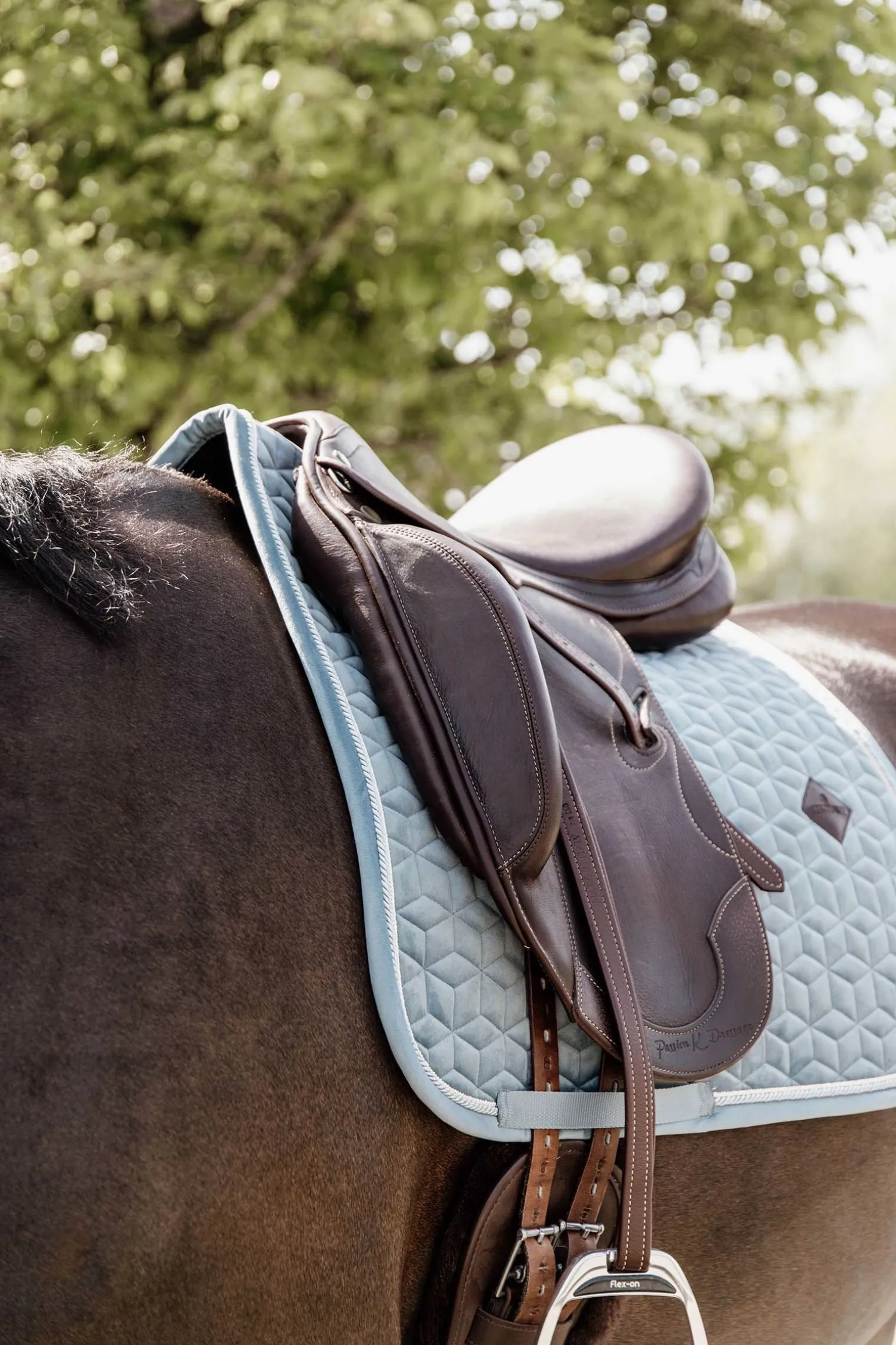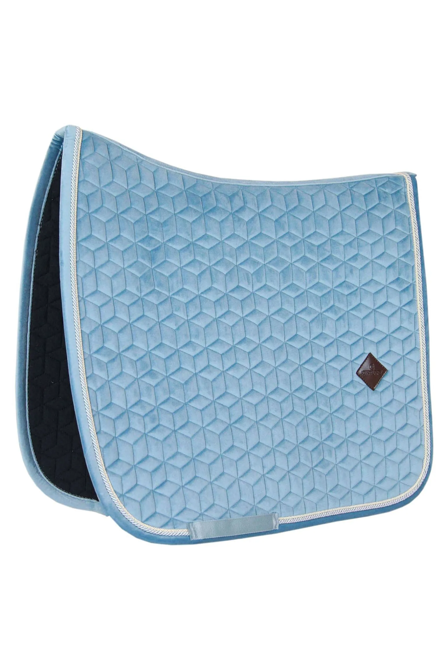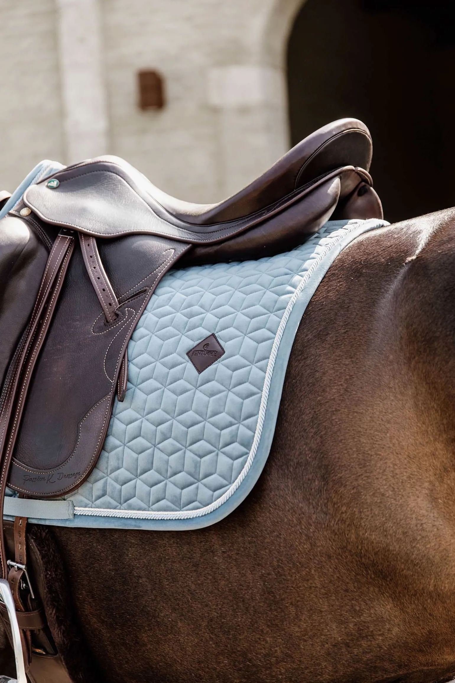 Super stylische und stilvolle Schabracke aus Samt mit doppelt gedrehter Bordüre. Die Samtschabracke ist für die Dressur designed und bietet hervorragende Polsterung zwischen dem Rücken des Pferdes und dem Sattel und schützt gleichzeitig vor Verspannungen. Die Schabracke hat keine lästigen Schlaufen zur Befestigung am Sattel, sondern nur einen Nylonriemen für den Gurt. Das dezente Logo aus Kunstleder ist immer an einer zentralen, etwas höheren Stelle platziert, so dass bei Bedarf immer Platz für die Bestickung mit ihrem eigenen Logo verfügbar ist.