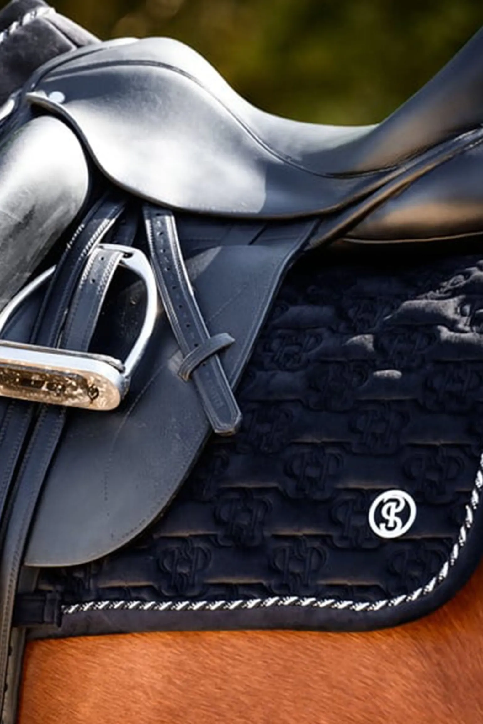 Luxuriöser Samt trifft auf neue Monogramm-Steppung in dieser Satteldecke. Lollipop-Einfassung, rutschfest und schnelltrocknend. Neue Monogramm-Steppung auf luxuriösem Samtstoff mit dreifarbiger und solider Lollipop-Einfassung. Verdeckter Gurttunnel und metallisches Zitat in Gold oder Silber entlang der Wirbelsäule. Vervollständige den Look mit einem Poloshirt und einer Fliegenhaube aus der Velvet Monogram Collection.