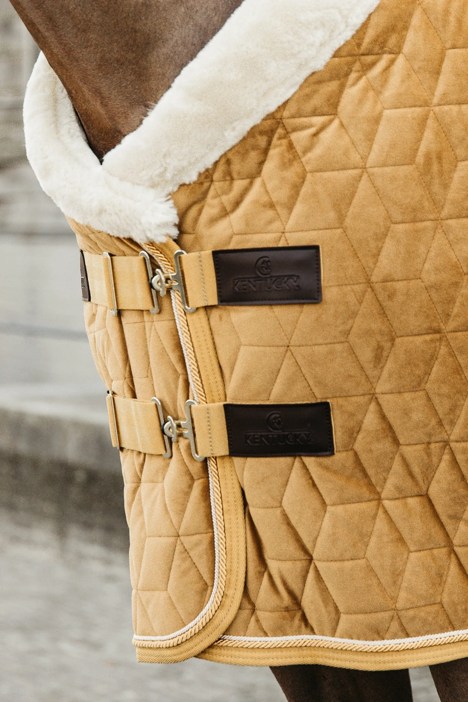 Dank des künstlichen Kaninchenfells auf der Innenseite bleibt die Decke nach dem Wälzen oder Liegen an Ort und Stelle. Die Decke kann mit zwei doppelten Frontverschlüssen und zwei Kreuzgurten, die mit den charakteristischen Kentucky-Kunstlederpatches versehen sind, geschlossen werden.