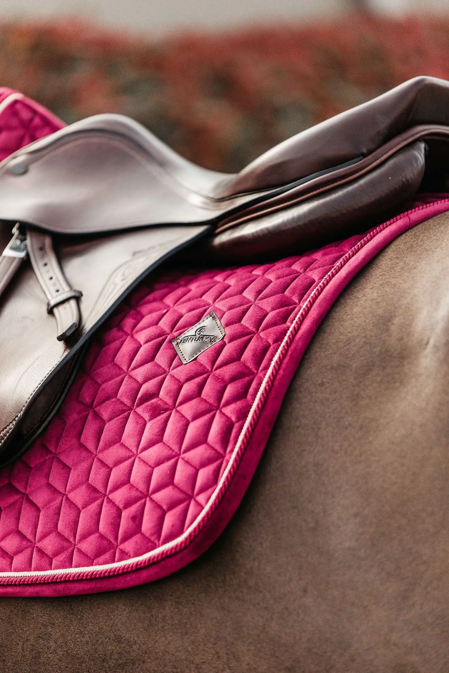 Super stylische und stilvolle Schabracke aus Samt mit doppelt gedrehter Bordüre. Die Samtschabracke ist für das Springen designed und bietet hervorragende Polsterung zwischen dem Rücken des Pferdes und dem Sattel und schützt gleichzeitig vor Verspannungen. Die Schabracke hat keine lästigen Schlaufen zur Befestigung am Sattel, sondern nur einen Nylonriemen für den Gurt. Das dezente Logo aus Kunstleder ist immer an einer zentralen, etwas höheren Stelle platziert, so dass bei Bedarf immer Platz für die Bestickung mit ihrem eigenen Logo verfügbar ist.