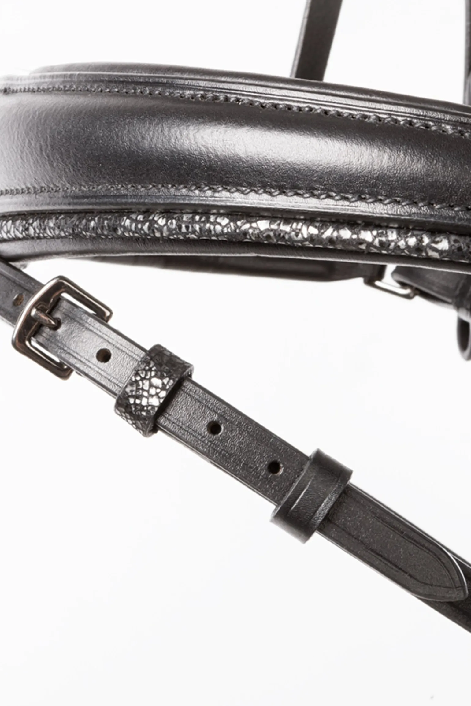 Die modische “Victoria” KavalSH4 Trense ist ein absoluter Hingucker auf deinem Pferd! Die Lederlaschen sowie der untere Rand des Nasenriemens und die Martingalstopper haben ein dekoratives Muster. Die Beschläge sind in einem passenden Dunkelgrau gehalten und das Stirnband ist mit kleinen dunklen Strasssteinen verziert. Das Genickstück ist anatomisch geformt und breit geschnitten, um mehr Bewegungsfreiheit um die Ohren zu ermöglichen. Der Nasenriemen ist weich gefüttert und verjüngt sich. Die Trense kann beidseitig verstellt werden, um eine optimale Passform zu gewährleisten.
