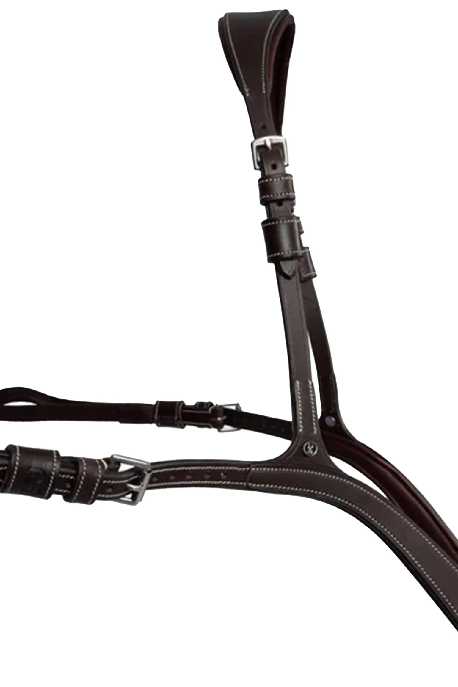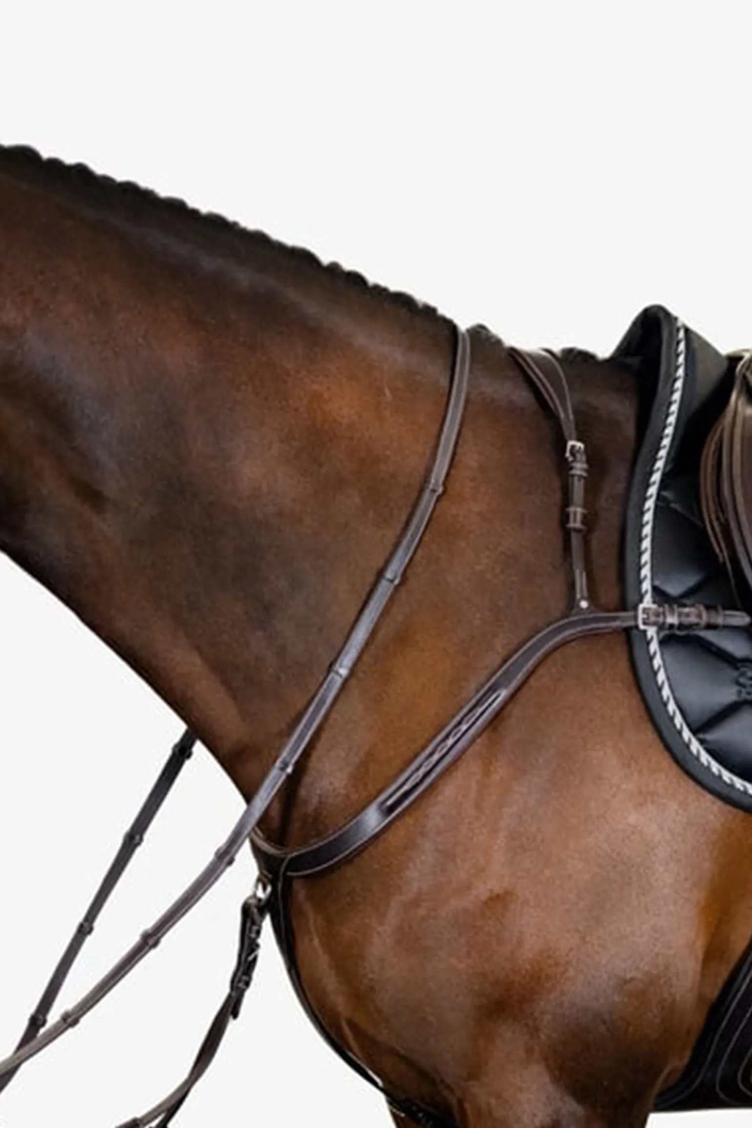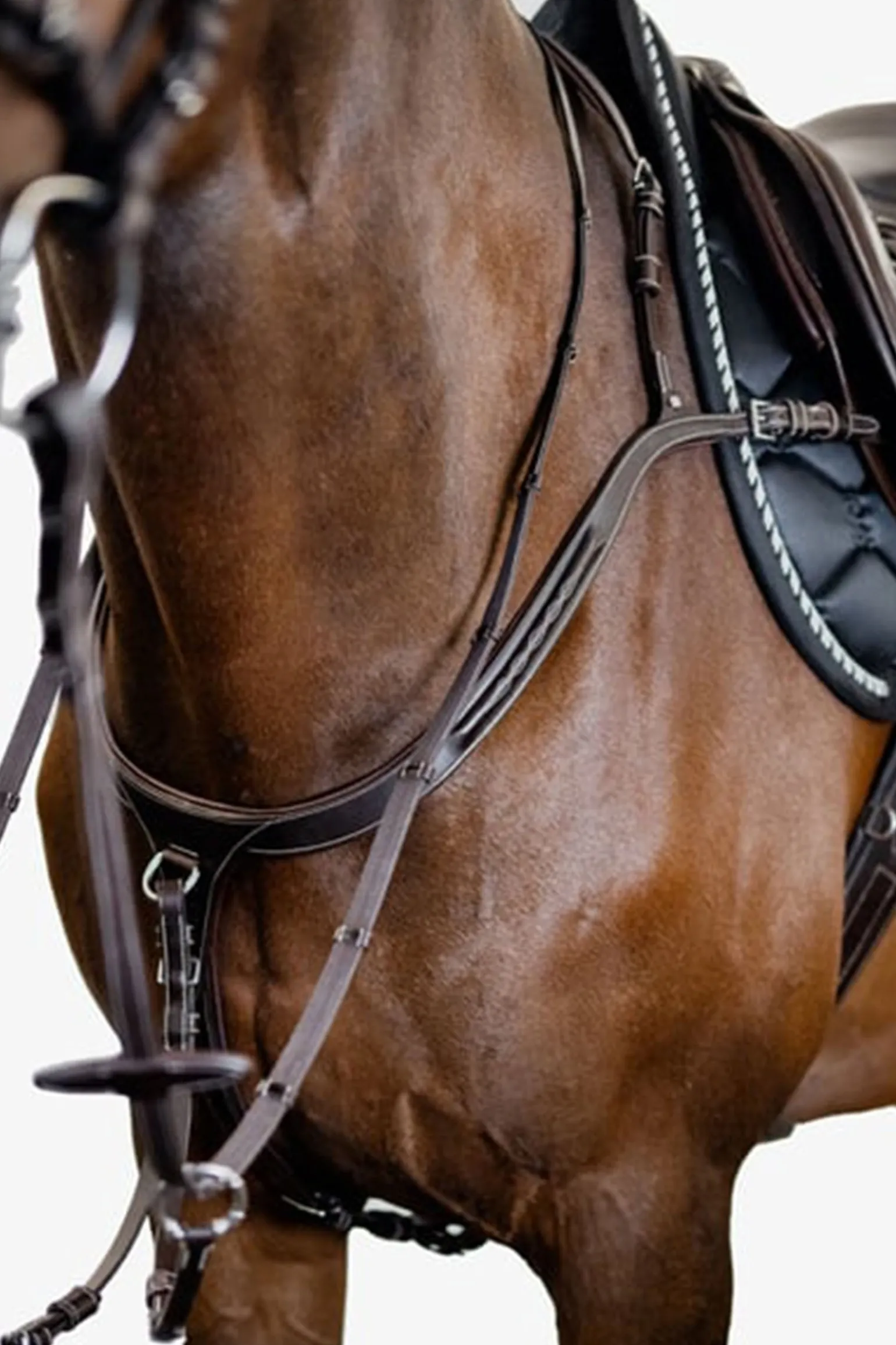 Ein luxuriöses und hochwertig verarbeitetes Vorderzeug, extra breit und gepolstert für zusätzlichen Komfort. Es hat eine anatomisch geformte Kurve, die die Schulter des Pferdes sanft umschließt, ohne die Beweglichkeit einzuschränken. Ein praktischer Karabinerhaken ist am Sattelgurt befestigt, und das Vorderzeug ist beidseitig am Widerrist verstellbar. Die cleveren Snap It-Haken machen es unnötig, die Zügel zu öffnen, um die Ausrüstung zu verbinden, was sowohl praktisch als auch sicher ist.