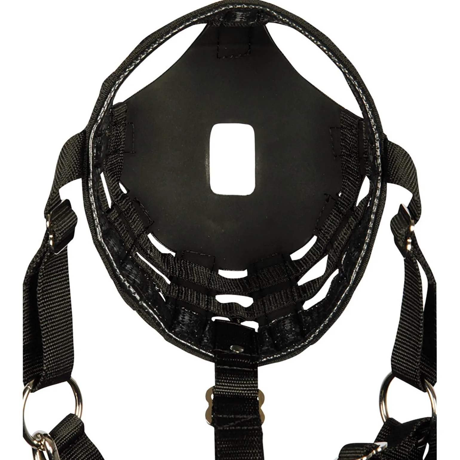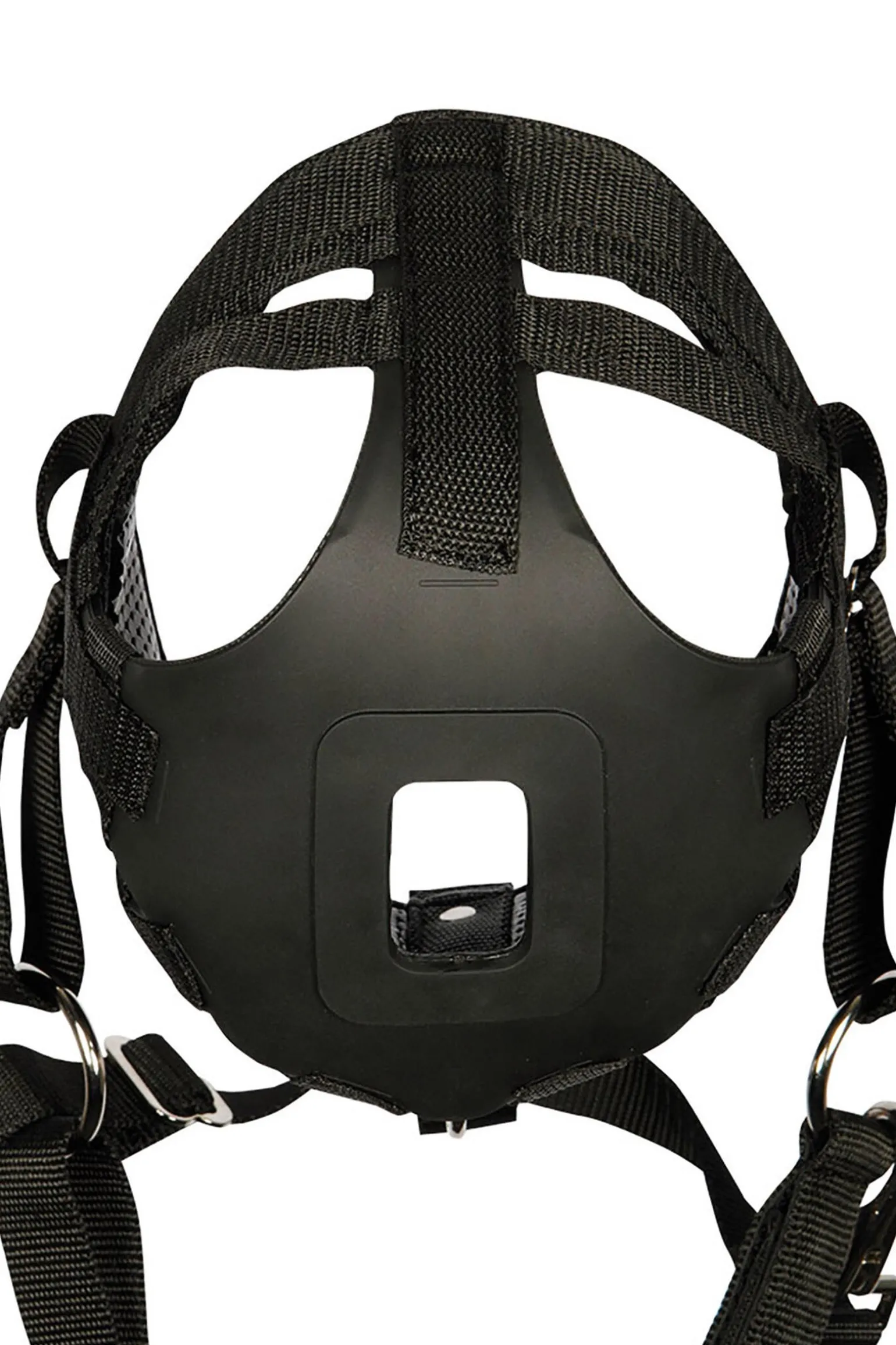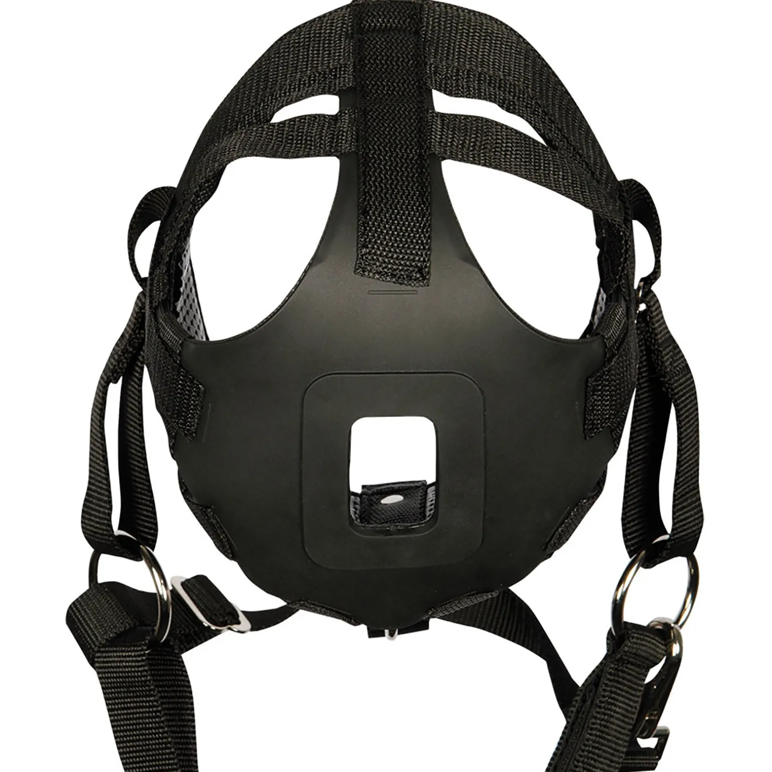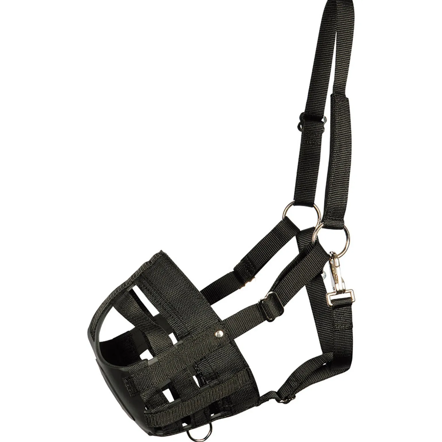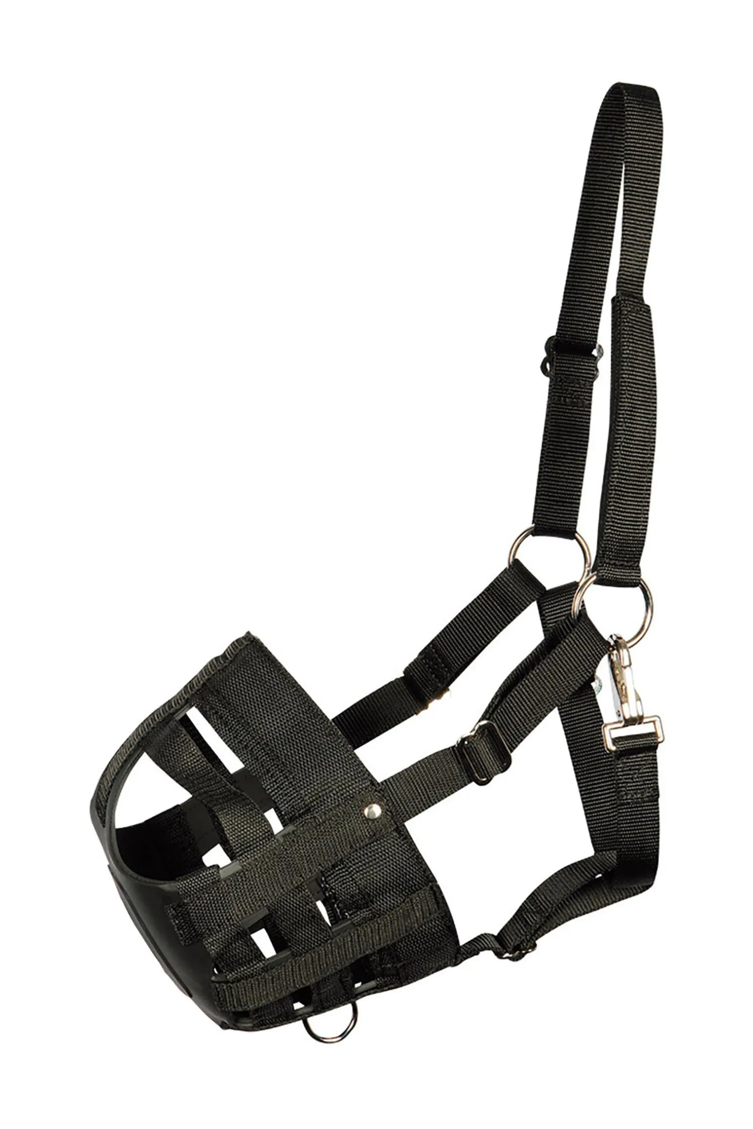 Weidemaulkorb mit Öffnungen, so dass beträchtlich weniger Gras gefressen, aber normal getrunken und gefressen werden kann.