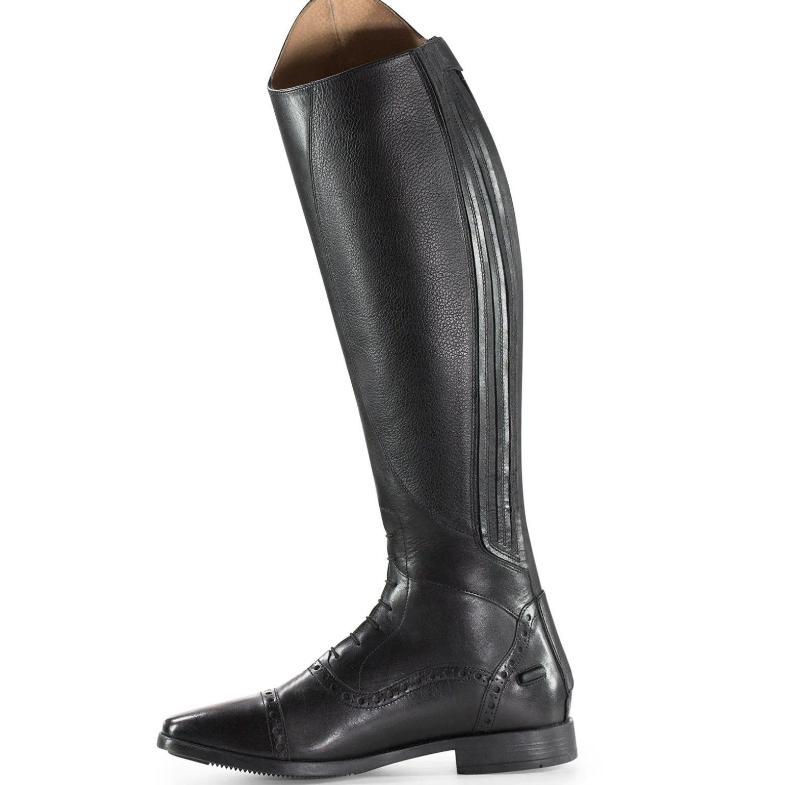 Hohe Stiefel sind ein Muss für das Turnier, wenn Halb-Chaps und Stiefeletten nicht angebracht sind. Diese wunderschönen Stiefel aus brasilianischem Leder haben hinten einen Reißverschluss und einen Elastikeinsatz. Eine Gummisohle und verschiedene Größen und Weiten bieten Komfort. Der Fuß hat gestanzte Details, elastische Schnürsenkel und eine schöne Sporenhalterung. Das Futter ist Wildleder für mehr Komfort. Z Emblem oben am Schaft mit einem kleinen Metallknopf und Kristallen. Ein Lederriemen mit Druckknopf am oberen Ende des Reißverschlusses, um diesen sicher zu verschließen.