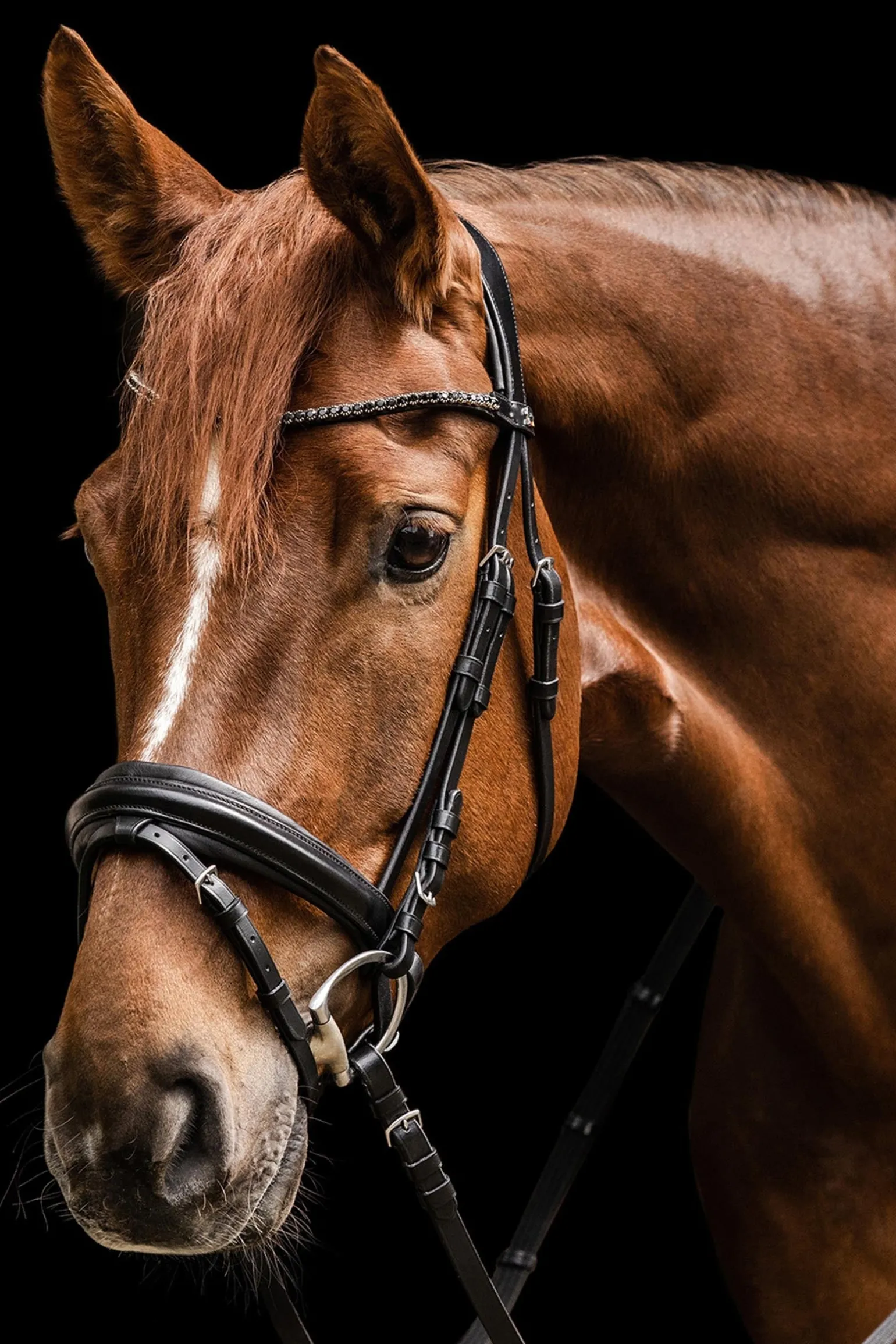 Diese Trense verfügt über einen Pull-back-Nasenriemen und ein anatomisch geformtes Kopfstück für eine bequeme Passform. Nasenriemen und Kopfstück sind weich gepolstert für zusätzlichen Komfort. Das schmale, gebogene Stirnband ist elegant mit schwarzen Steinen verziert, was einen Hauch von Raffinesse verleiht. Edelstahlbeschläge gewährleisten Haltbarkeit und die Trense wird mit 19 mm kontinentalen Zügeln für optimale Kontrolle geliefert.