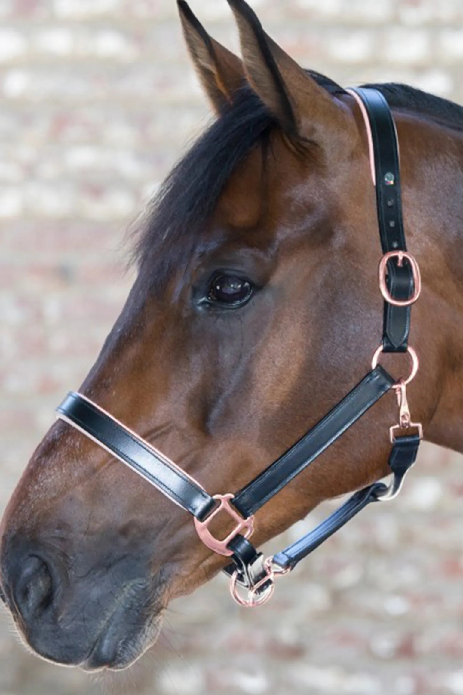 Elegantes Lederhalfter mit weich gepolstertem Nasenriemen und Genickstück sowie rundgenähtem Kehlriemen. Hochwertige Beschläge in rosé Farbe. Beidseitig verstellbares Genickstück und einfach verstellbarer Kinnriemen.