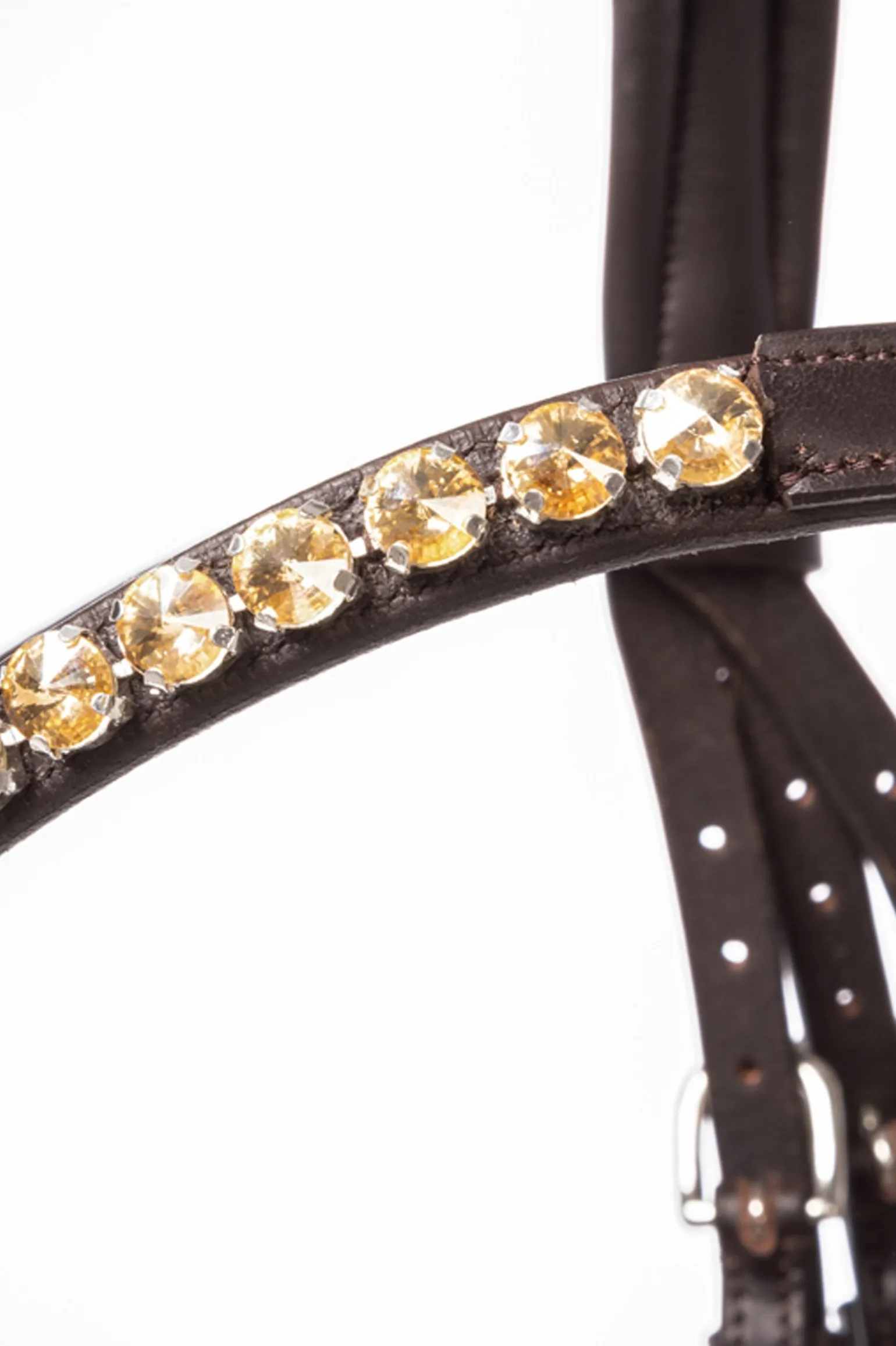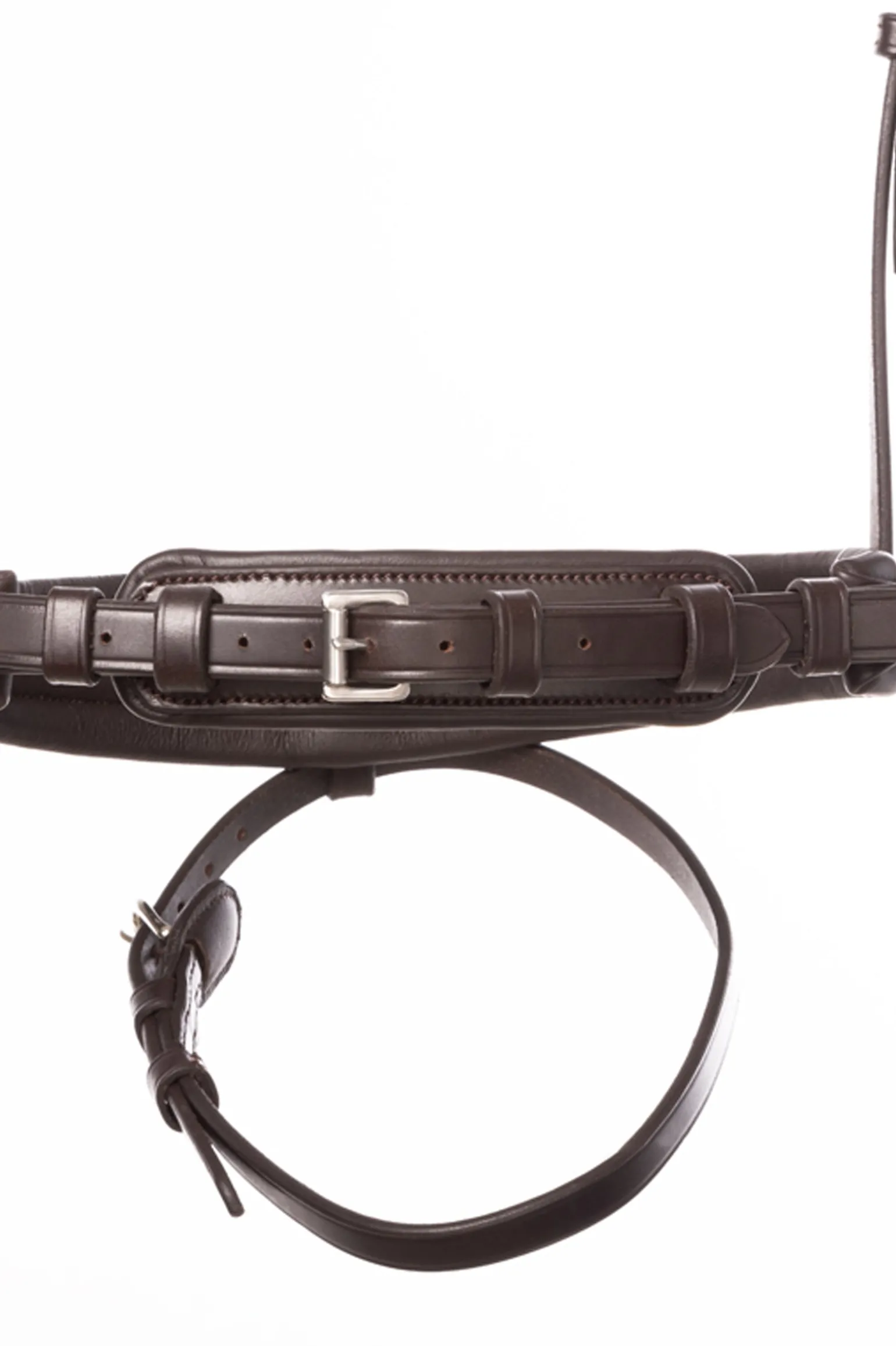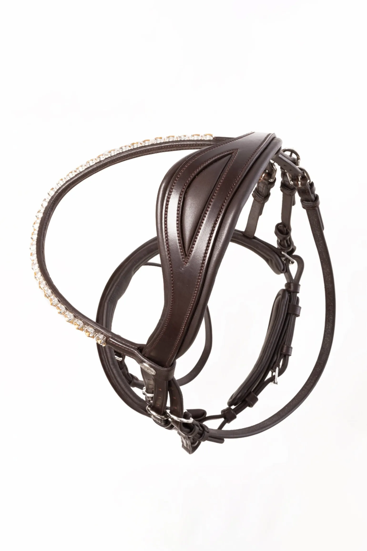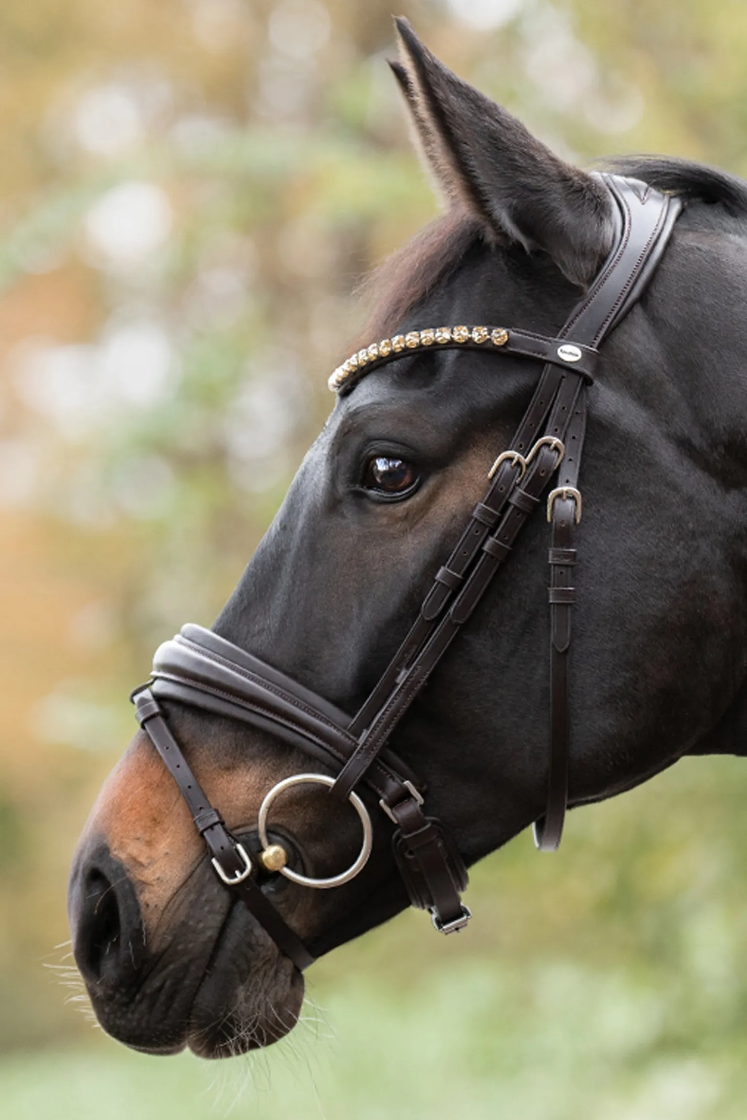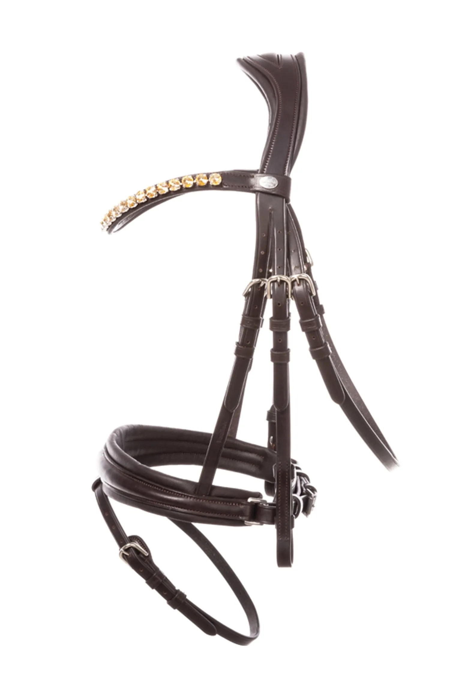 Die Dressurtrense „Zora“ besteht aus hochwertigem deutschen Qualitätsleder sowie einem besonders weichen Genickstück, welches stark anatomisch geformt ist mit Einschnitt. Die weiche Polsterung vom Nasenriemen und Stirnband bieten ebenfalls einen besonderen Komfort für das Pferd. Das Reithalfter ist beidseitig verstellbar. Der Trensenzaum wird ohne Zügel geliefert.