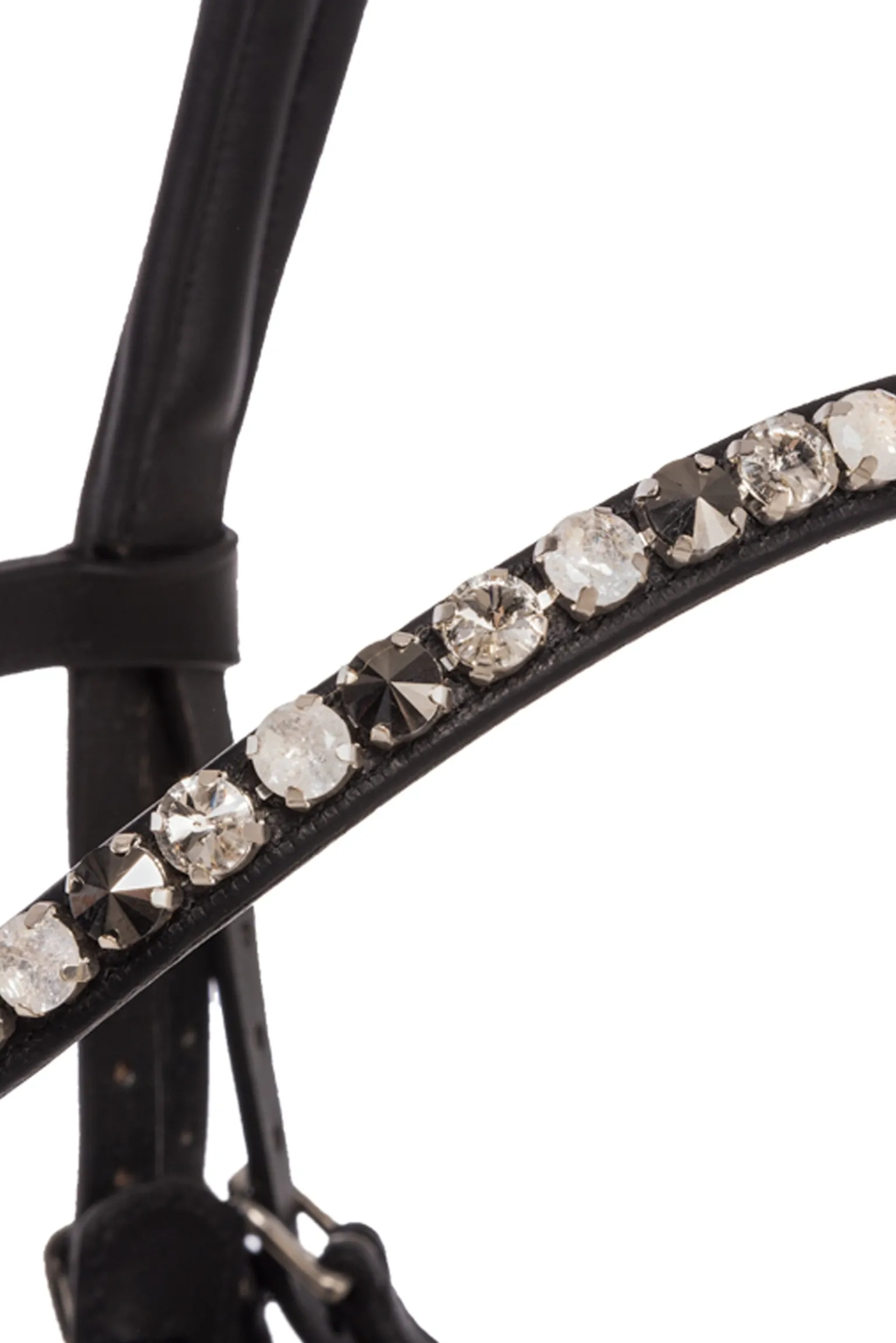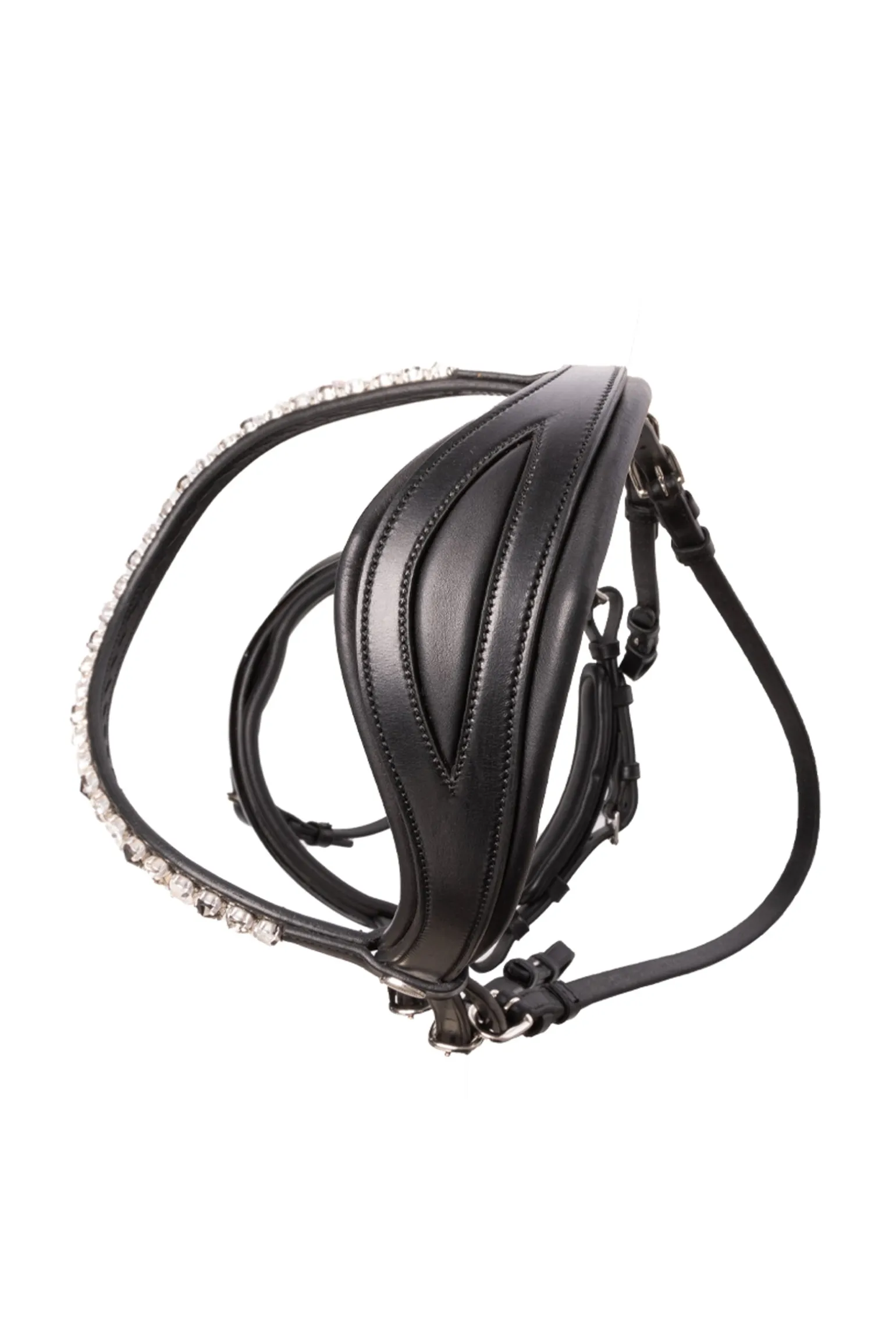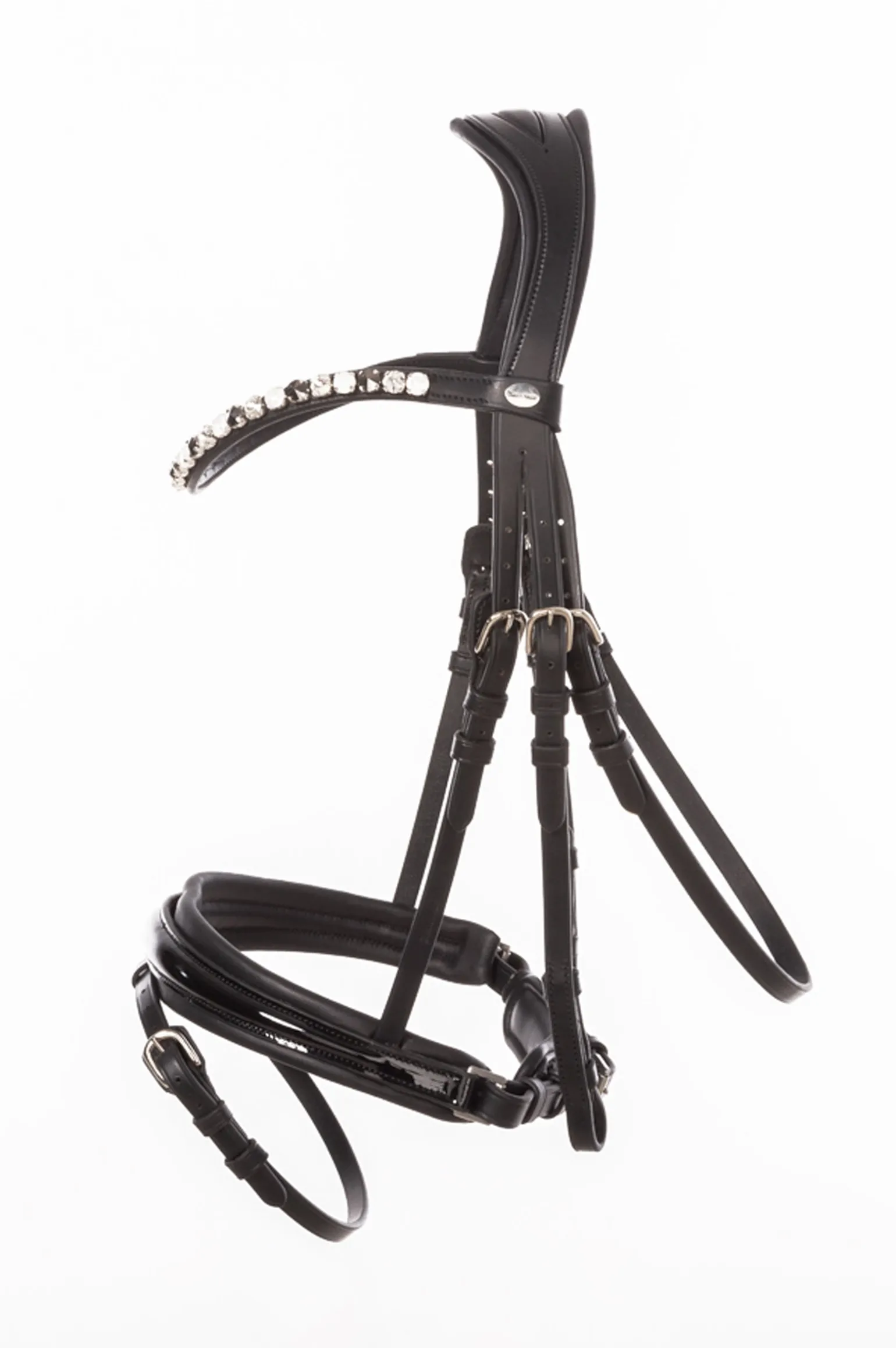 Die Dressurtrense „Zora“ besteht aus hochwertigem deutschen Qualitätsleder sowie einem besonders weichen Genickstück, welches stark anatomisch geformt ist mit Einschnitt. Die weiche Polsterung vom Nasenriemen und Stirnband bieten ebenfalls einen besonderen Komfort für das Pferd. Das Reithalfter ist beidseitig verstellbar. Der Trensenzaum wird ohne Zügel geliefert.