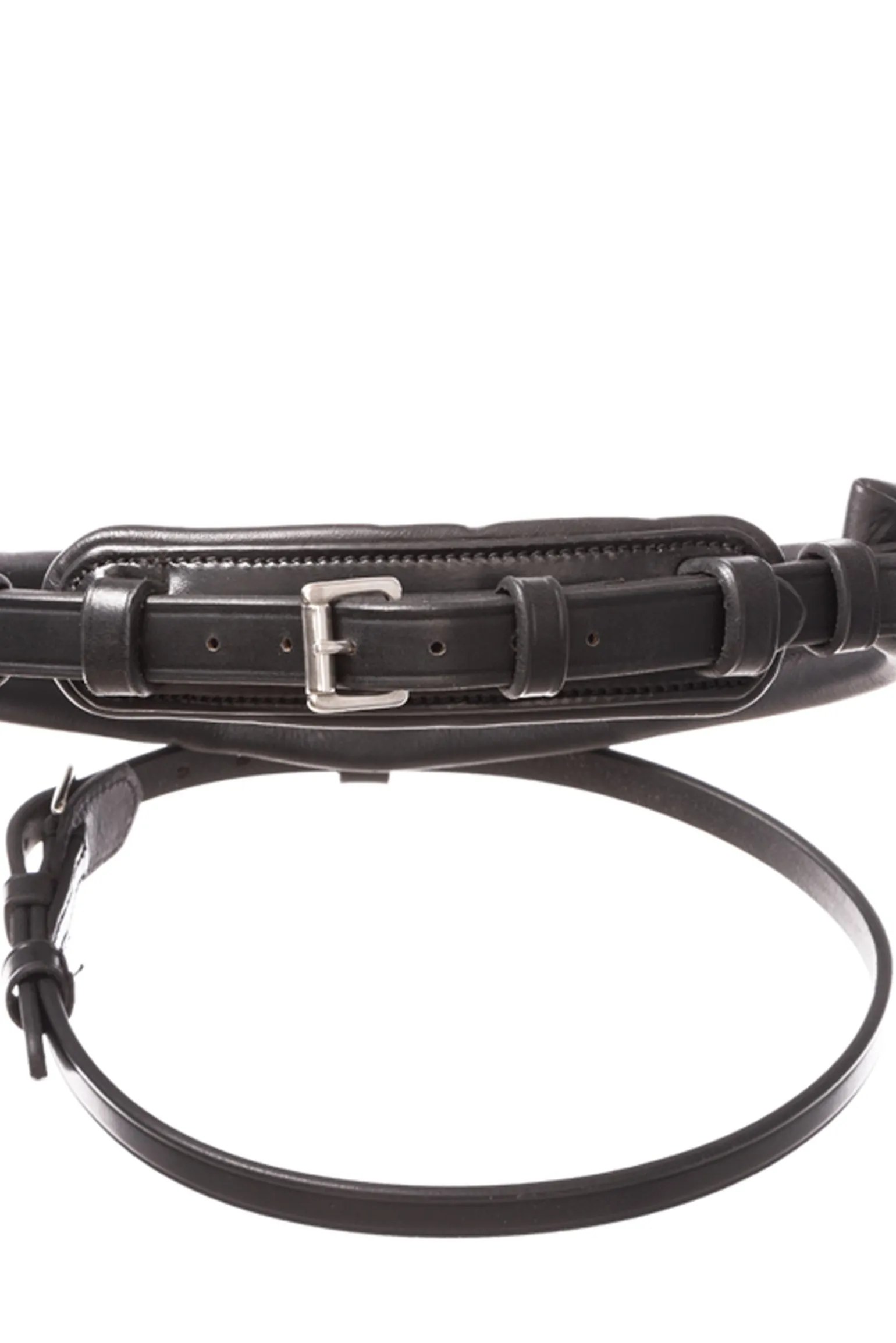 Bei Trensen mit dem Zusatz KavalSH4 ist der Sperrriemen abnehmbar. Das Besondere daran ist, dass die Halterung für den Sperrriemen nicht, wie bei herkömmlichen Trensen mit abnehmbarem Sperrriemen, ersichtlich ist.